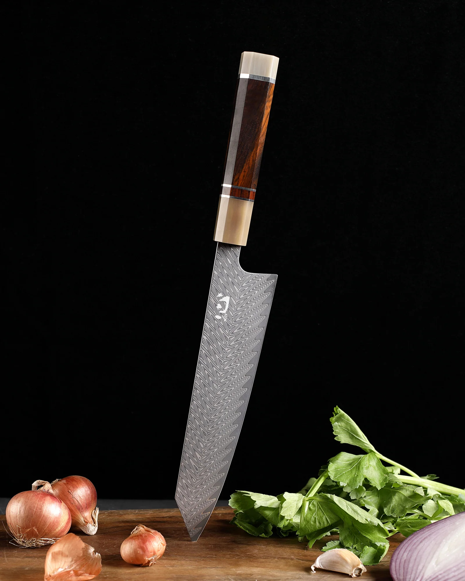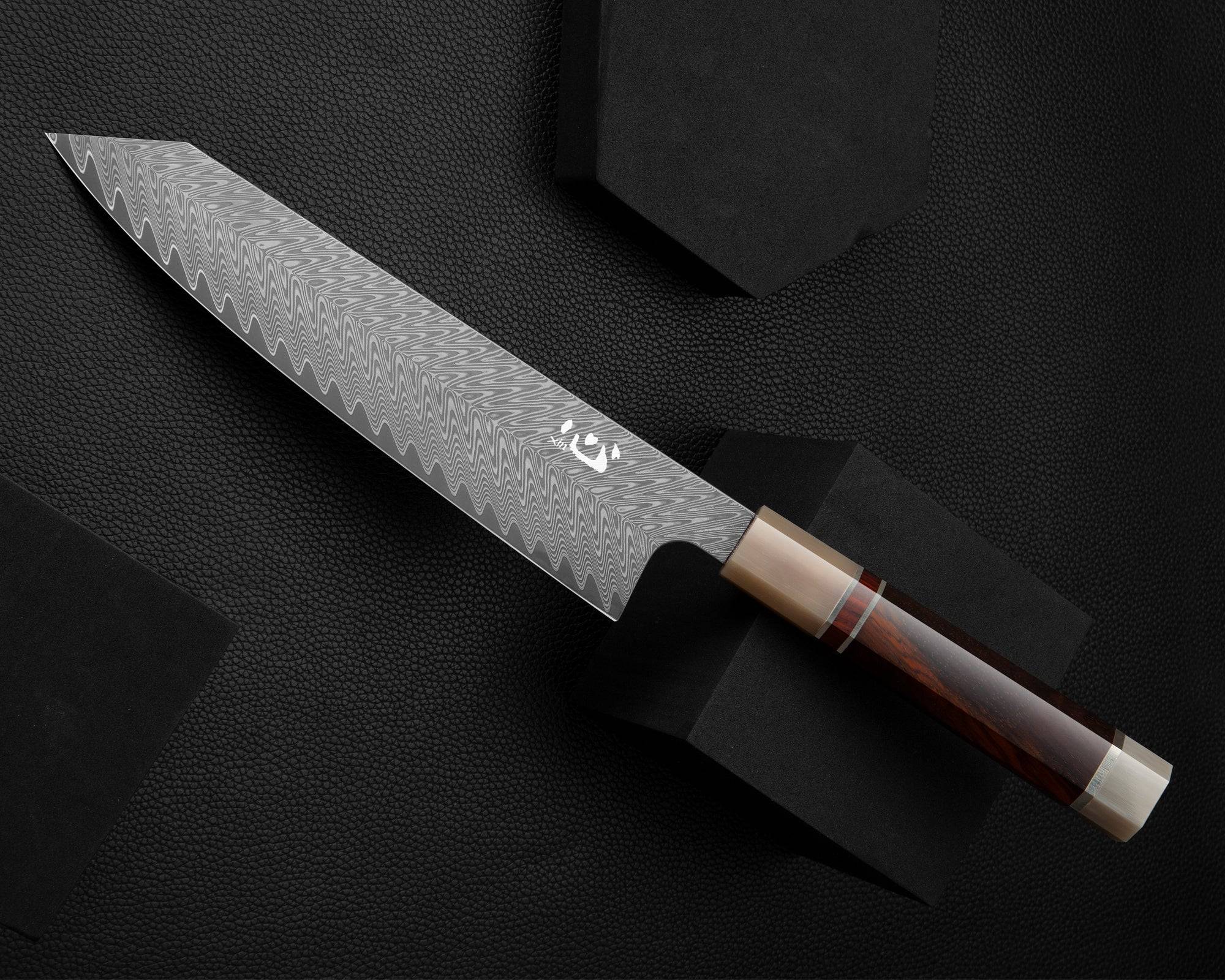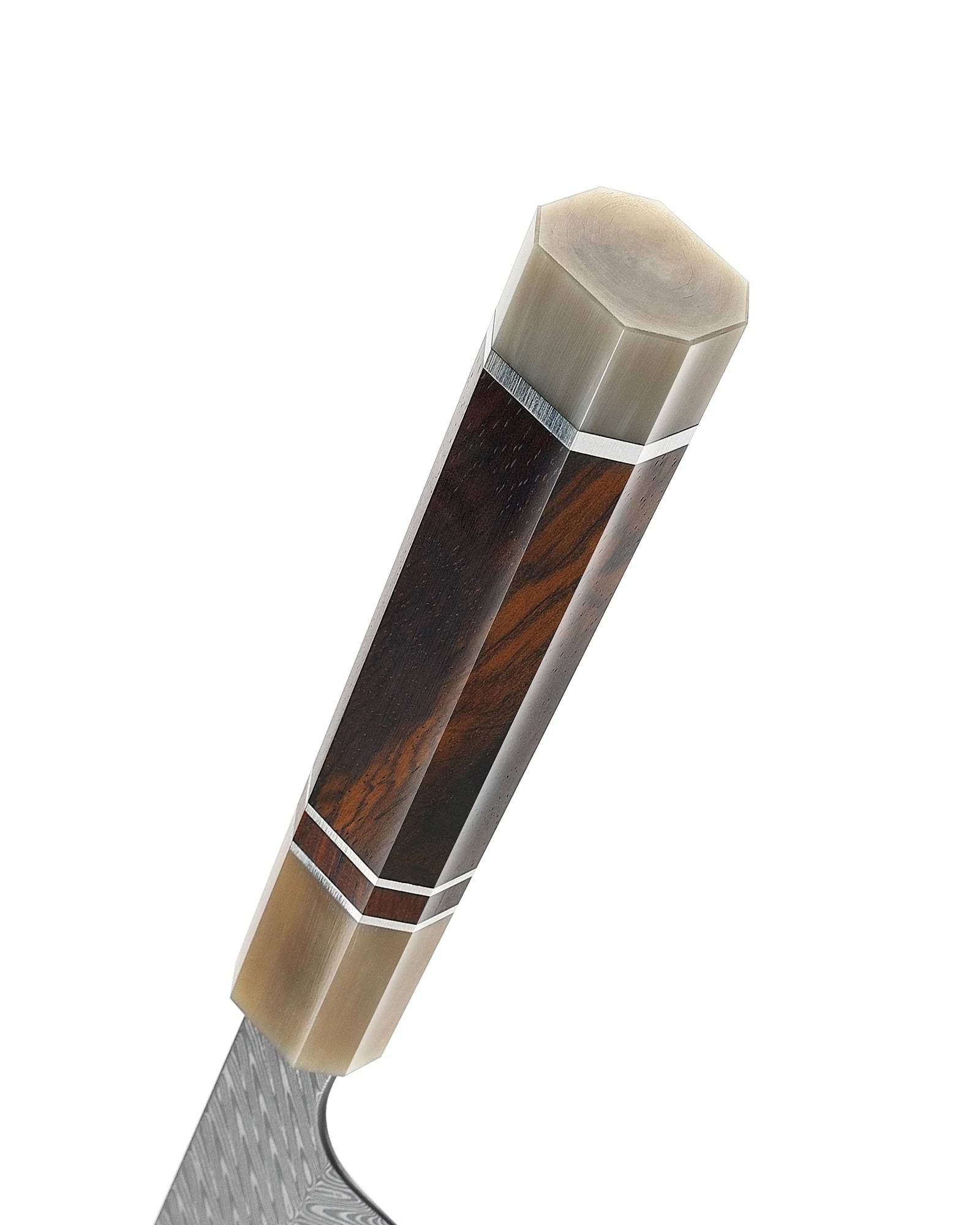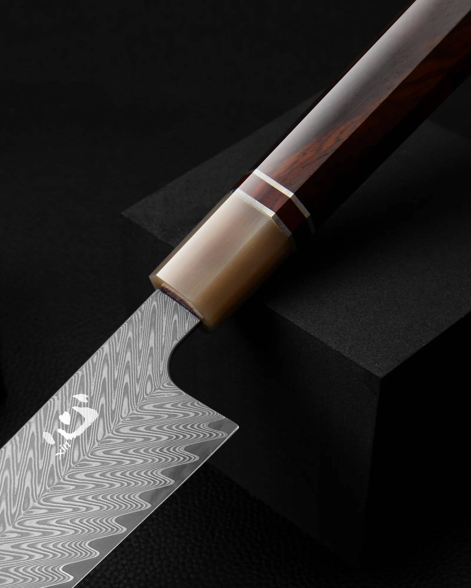 这把刀是限量版手工制作的4.7英寸多功能刀。工具可以作为小任务和非常精准切割的好工具。这把刀由拥有数十年手工刀具经验的经验丰富的工匠手工制作。刀刃采用67层VG10大马士革钢,采用锻造和高度酸蚀洗涤处理。刀刃的细微凸磨形成漂亮的弧形,性能极为锋利。我们还会用玫瑰木和水牛角,并用镍银接合作为手柄。整体采用简洁经典的设计,采用全柄结构,实现最佳平衡和持久耐用。
