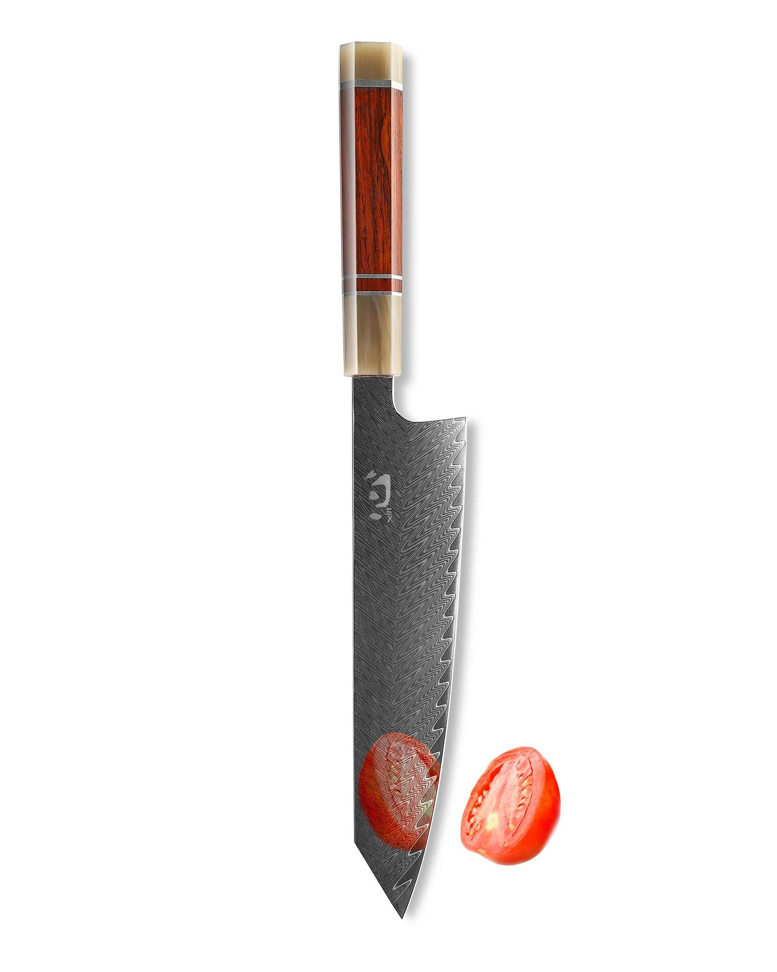 这把刀是手工制作的8英寸日式切礼。切理总是能轻松地切肉、蔬菜、鱼和熟食。这把刀由拥有数十年手工刀具经验的经验丰富的工匠手工制作。刀刃采用67层VG10大马士革钢,具有锻造和高度镜面抛光的表面处理。刀刃的细微凸磨形成漂亮的弧形,性能极为锋利。我们还会用玫瑰木和水牛角,并用镍银接合作为手柄。整体采用简洁经典的设计,采用全柄结构,实现最佳平衡和持久耐用。
