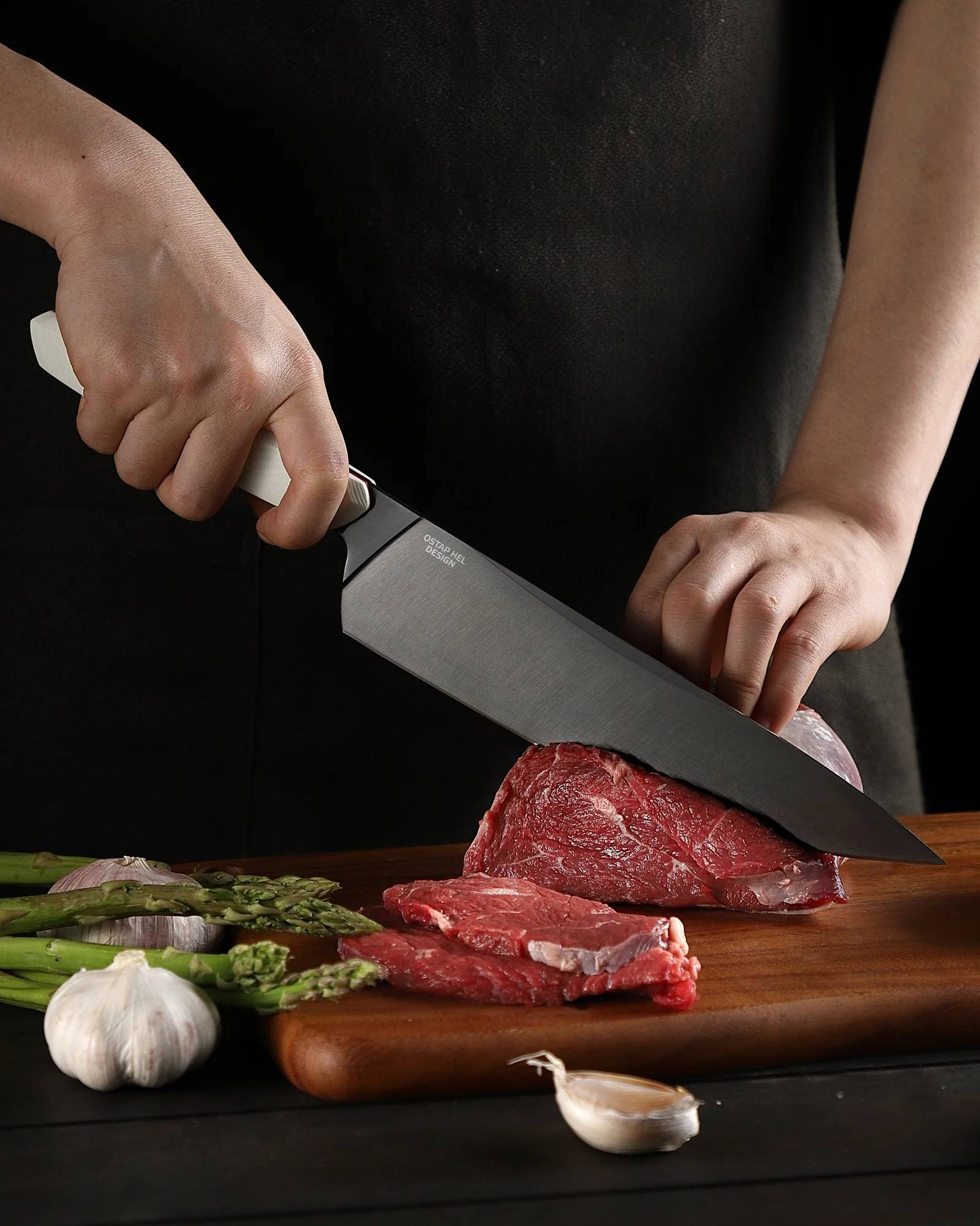 XinCore 系列是 Xin Cutlery 团队的创新艺术作品。该系列独特的外观由波兰设计师Ostap Hel设计,他始终致力于将令人赞赏的艺术品带入厨房。刀刃采用Sandvik 14C28N真空处理钢材,材质为58-59 Rockwell,全部采用手工抛光缎面处理。手柄采用纤维树脂G10材质,手工精心抛光,符合人体工学的手柄形状最大化了舒适度、抓握力和灵活性。