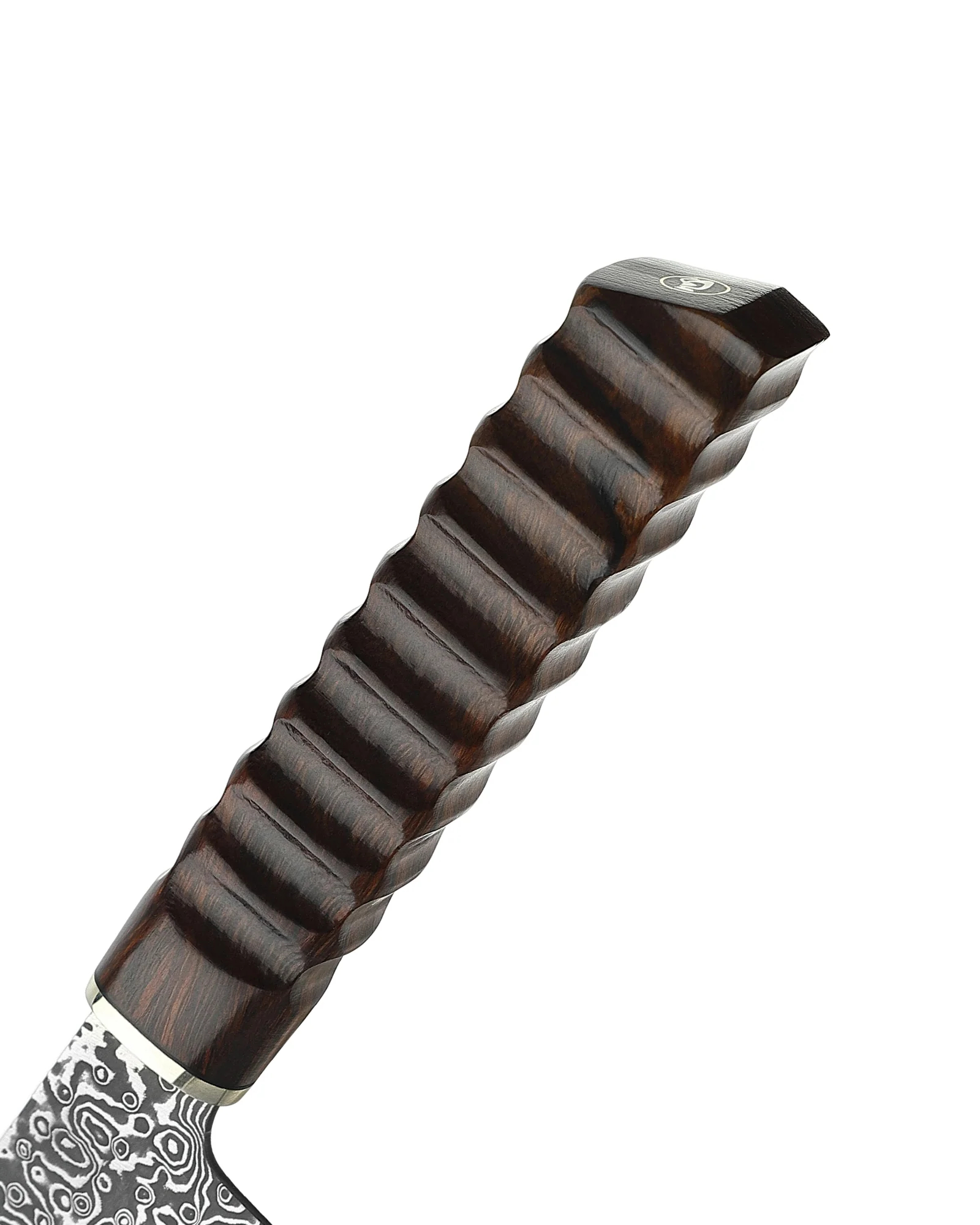 这款Nakiri由拥有数十年手工刀具经验的经验丰富的工匠手工制作。刀刃由67层VG10大马士革钢锻造,刀芯硬度达HRC61+/-1,锋利度极高。手柄采用稳定枫木丛木和黄铜作为垫片,最大化稳定性和防腐蚀性能。长而平的刀刃帮助将蔬菜完全切开,不像手风琴一样留下连接,这把刀是切蔬菜的理想工具,也被用作厨房的多功能刀具。