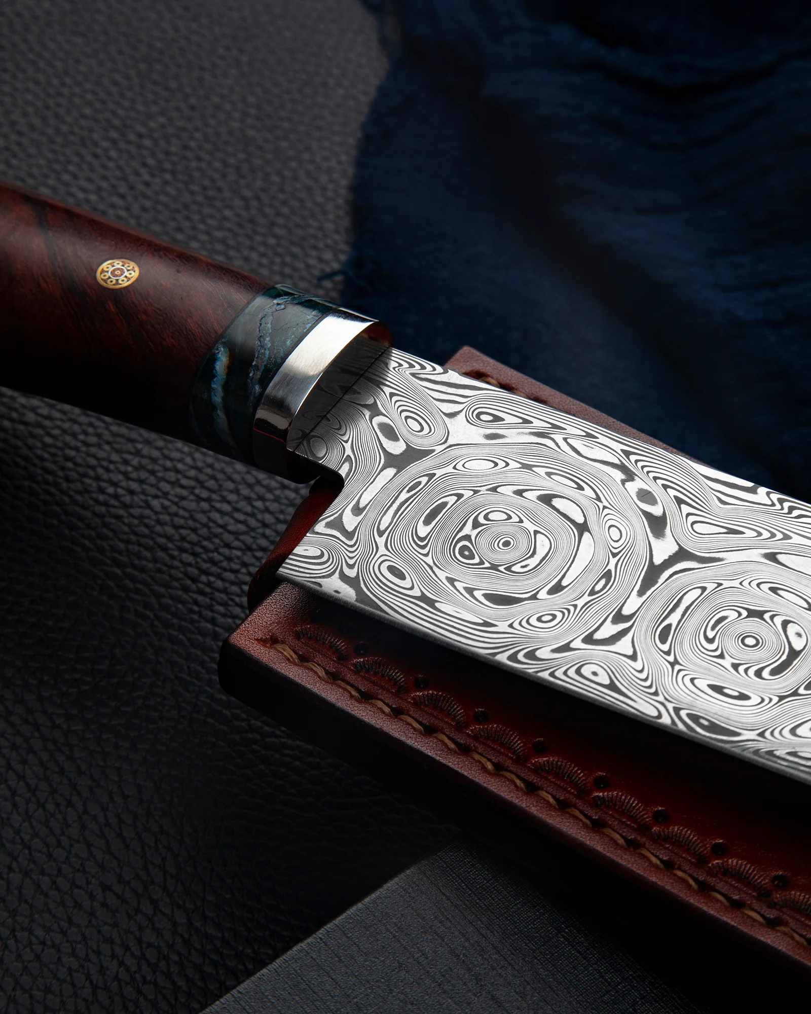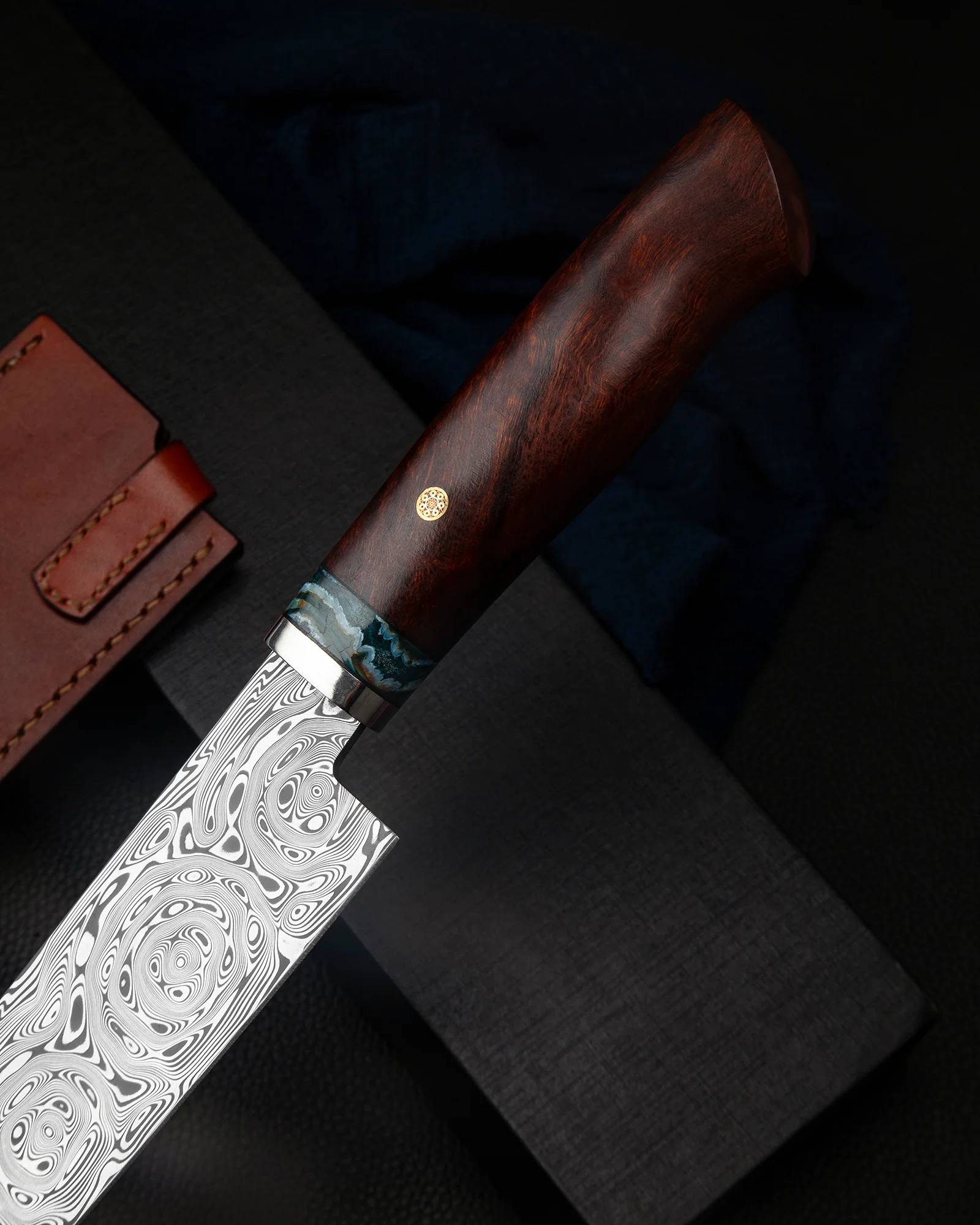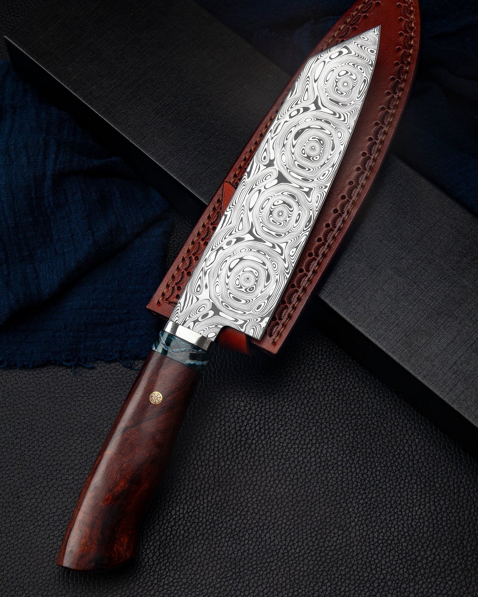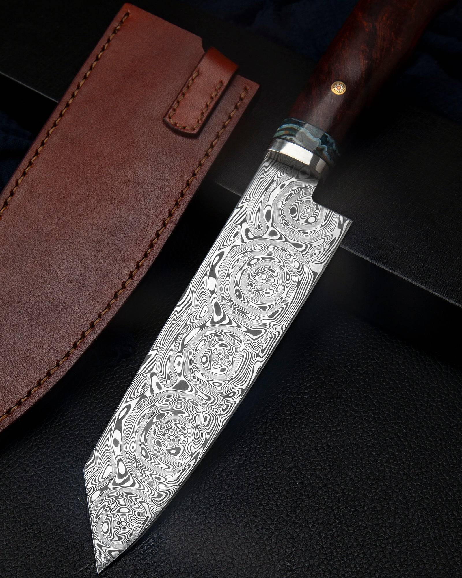 这把刀结合了顶级材料和顶级工艺。刀刃涂上了具有优越强度和耐久度的大石钢大罗森,握把则涂上铁木和猛犸象象牙化石。它将是值得收藏的那一本。