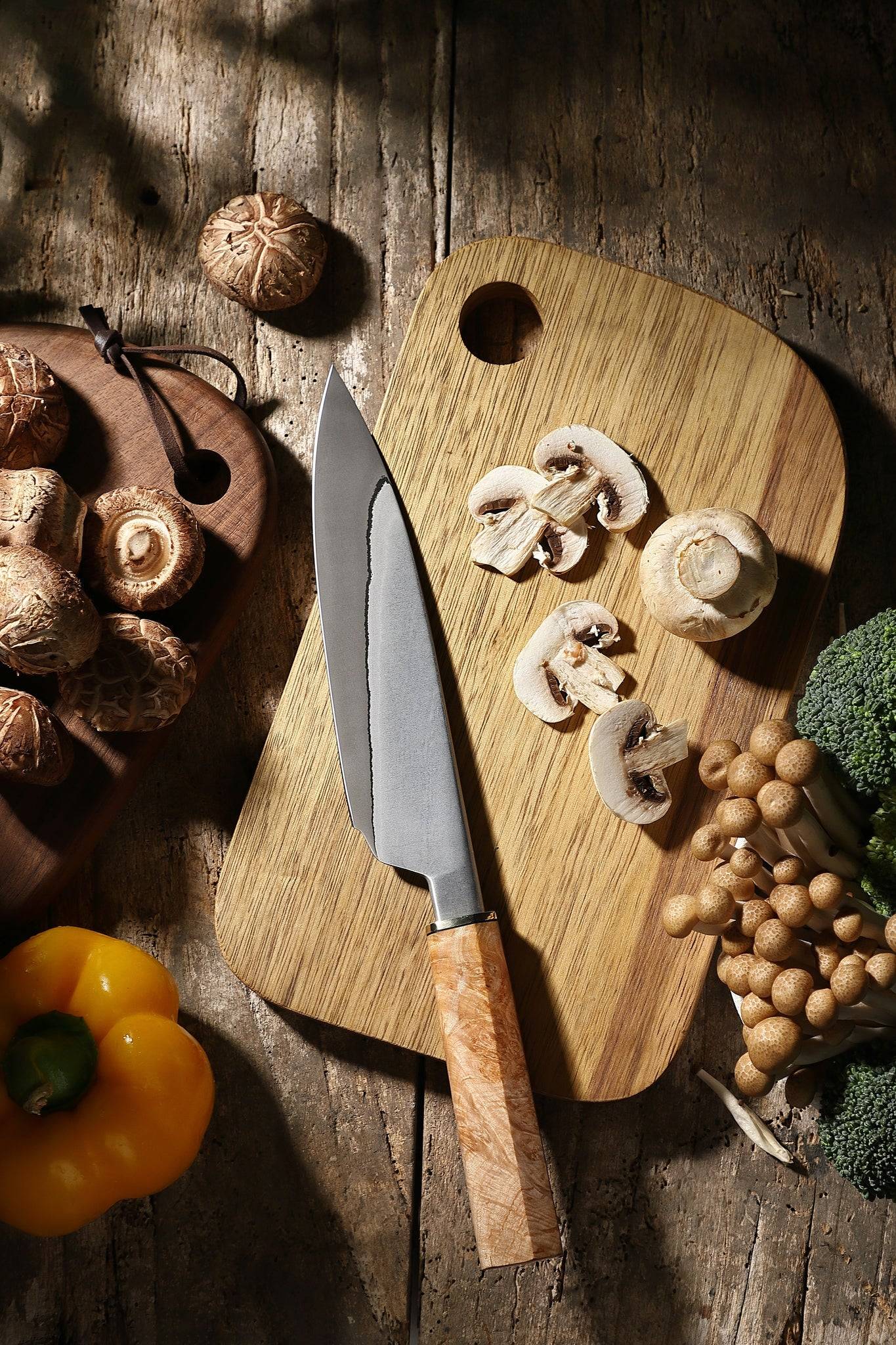 我们用稳定的棘纹枫树瘤做手柄,并用黄铜垫片接合。整个刀身是全柄结构,足够方便处理灵活切割任务。