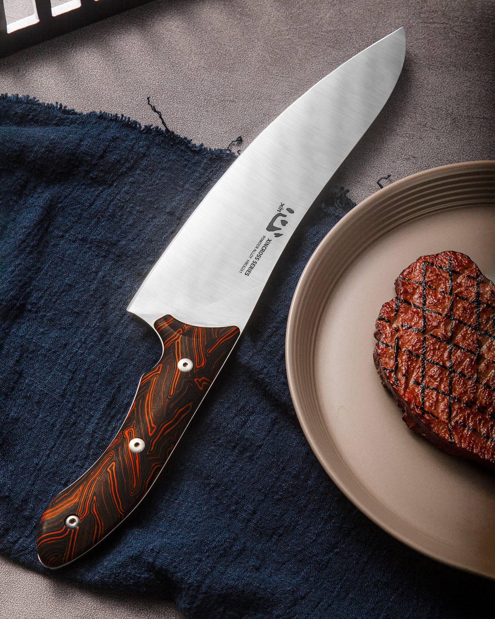 刀具类型:战术风格厨师刀 刀刃长度:210mm(8英寸) 刀刃材质:特殊粉末合金钢 握柄材质:G10 刀柄长度:140mm 全长:362mm 刀刃厚度:2.4mm 刃口类型:平面 刀刃 表面处理:机器 缎面 硬度:62+/-1 净重:242克 最大起飞重量:529克 来源:中国 型号:XC143(黑橙色)