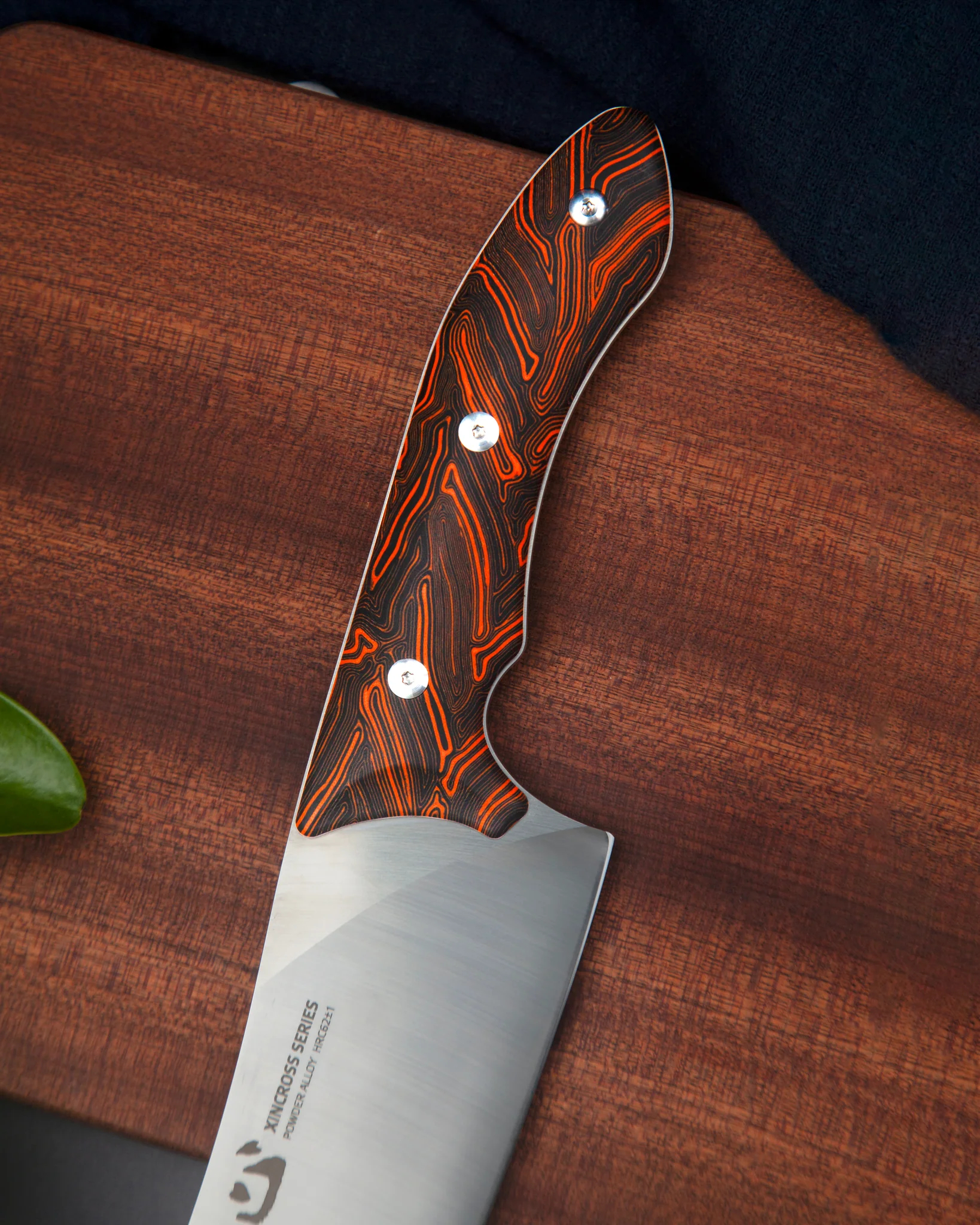 该系列设计融合了厨房刀具和户外刀具。其特点是特殊粉末合金在真空油提取下,硬度高达HRC62±1。手柄采用双色交织的G10材质,耐腐蚀且使用耐用。人体工学设计的身体形状带来了舒适的剪裁体验,而且看起来超级酷!