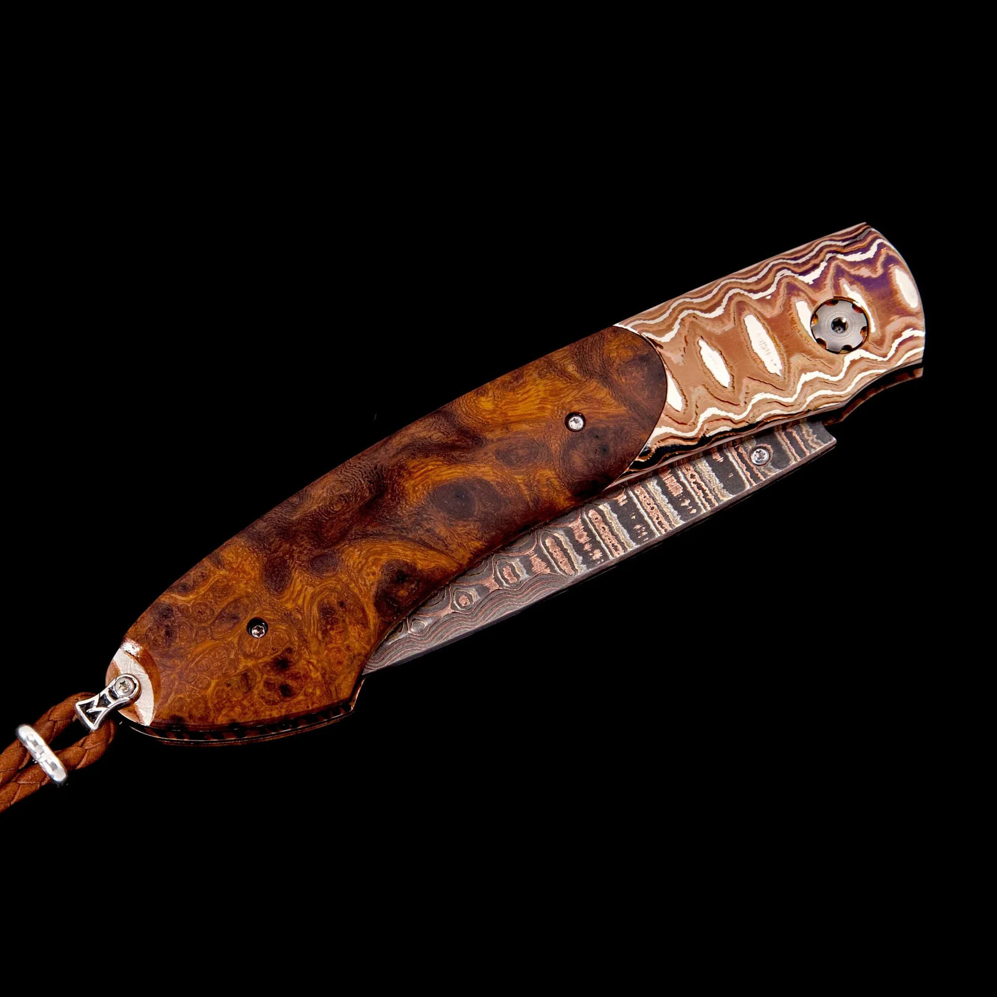 这款名为“Rustic”的矛尖折刀,拥有威廉·亨利标志性的(专利申请中)“波浪”木纹钢刀架,并镶嵌着精美的沙漠铁木刀柄。刀刃采用“铜波”大马士革钢,刀芯则采用VG-5钢材,锋利无比。单手按钮锁定装置和拇指柱上镶嵌着黄水晶。这款设计卓越的折刀,握感舒适稳固,刀身深弧,用途广泛。“Rustic”完美诠释了威廉·亨利的核心理念——卓越的功能性应与卓越的艺术性相得益彰。此外,“Rustic”还采用了威廉·亨利最受推崇的两种特色锻造金属,堪称一件永恒的传世之作,值得您一生珍藏,并可传承给下一代。