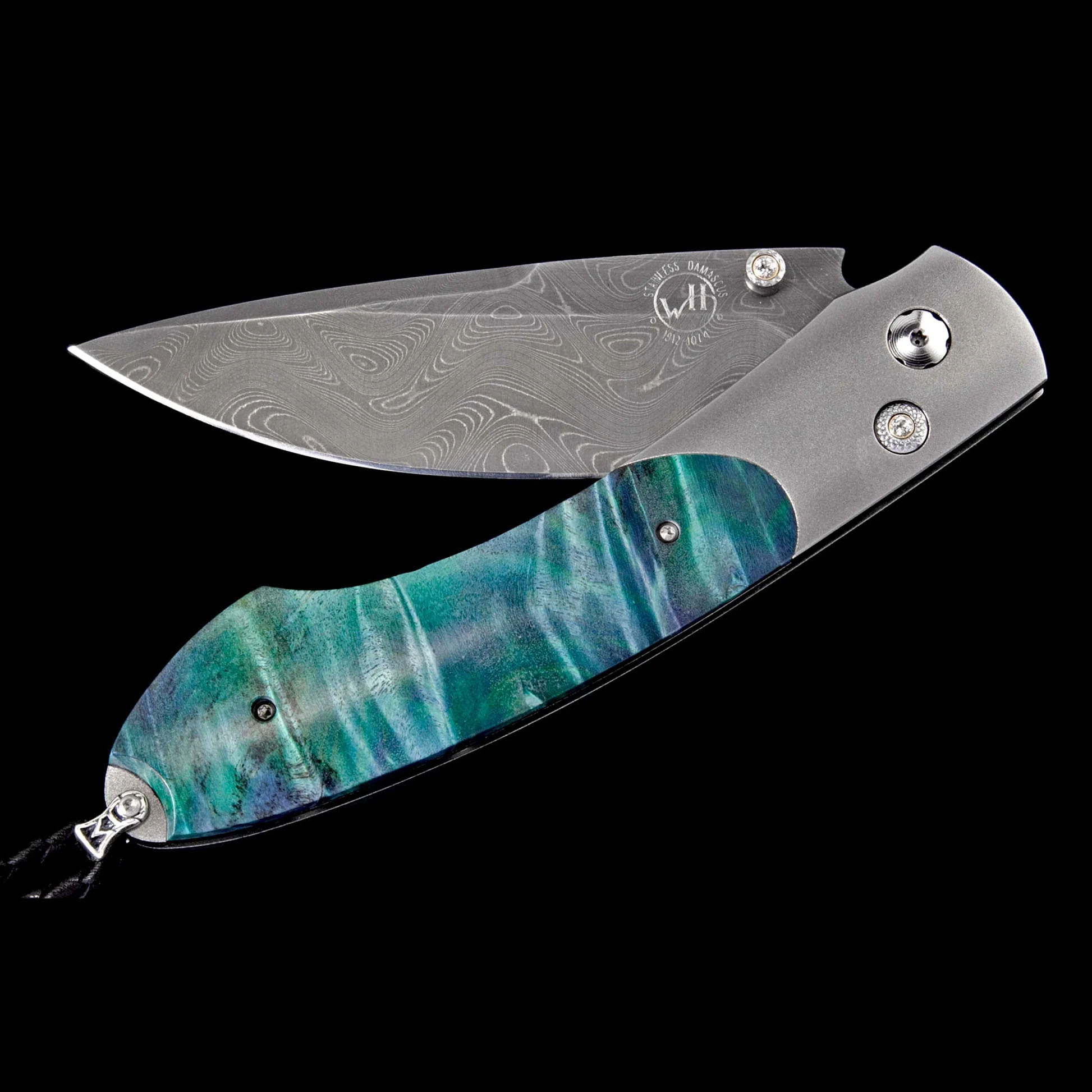 Spearpoint“蓝七叶树”折刀采用轻盈坚韧的航空级钛合金框架,并镶嵌一块精美的蓝绿色七叶树瘤木。刀刃为手工锻造的“回旋镖”大马士革钢;单手按钮锁定装置和拇指柱均镶嵌白色托帕石。Spearpoint 折刀设计卓越,握感舒适稳固,刀身深弧,用途广泛,完美诠释了William Henry的核心理念——卓越的功能性应与卓越的艺术性相得益彰。“蓝七叶树”折刀采用William Henry系列标志性的珍稀材料和手工锻造金属,彰显独特个性,值得您一生佩戴和使用。