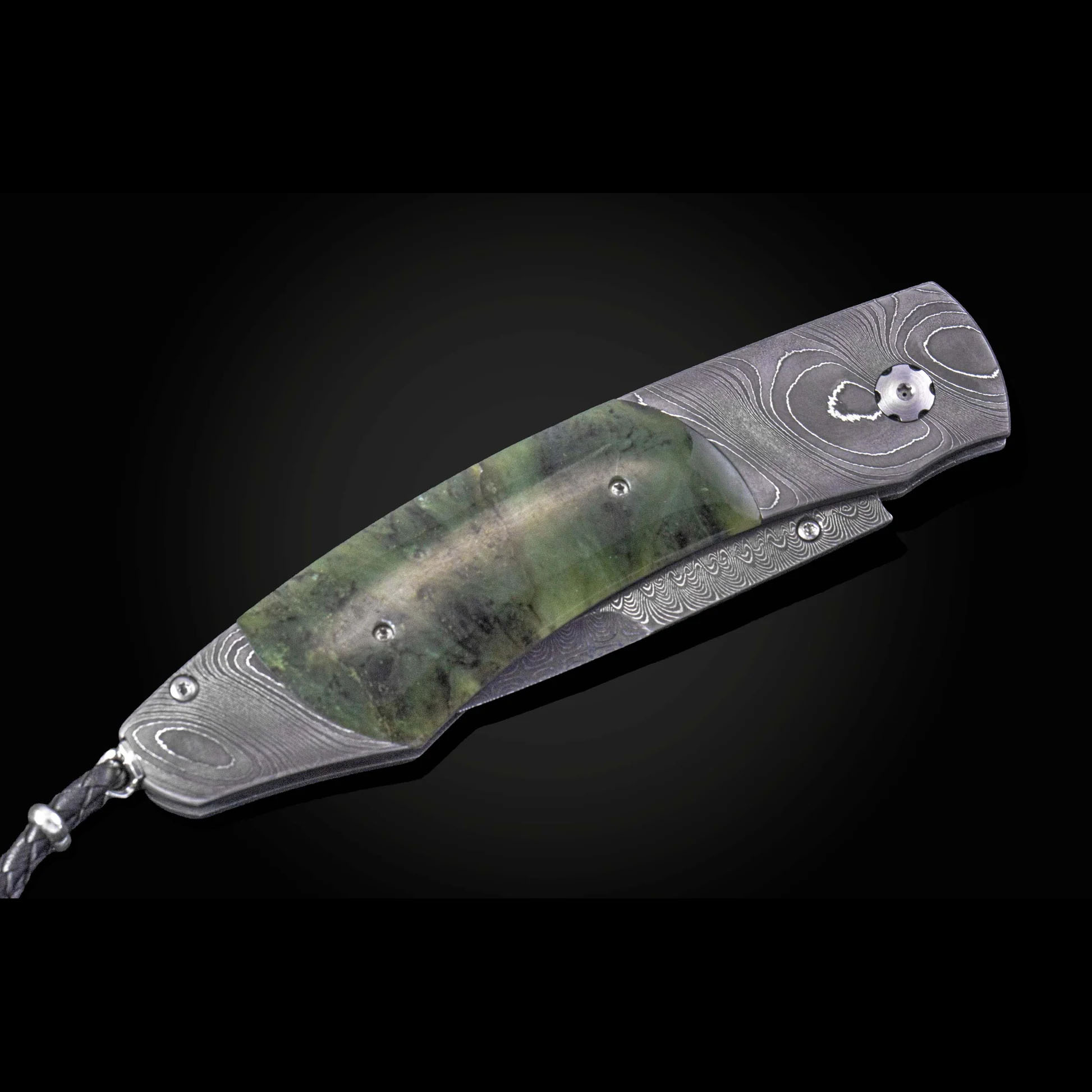 细节 Spearpoint“绿丘”折刀拥有由Chad Nichols手工锻造的“扭曲”大马士革钢刀架,并镶嵌着一块精美的绿色玉石,令人叹为观止。刀刃则由Luke Mattern手工锻造的“土耳其”大马士革钢制成;单手按钮锁定装...