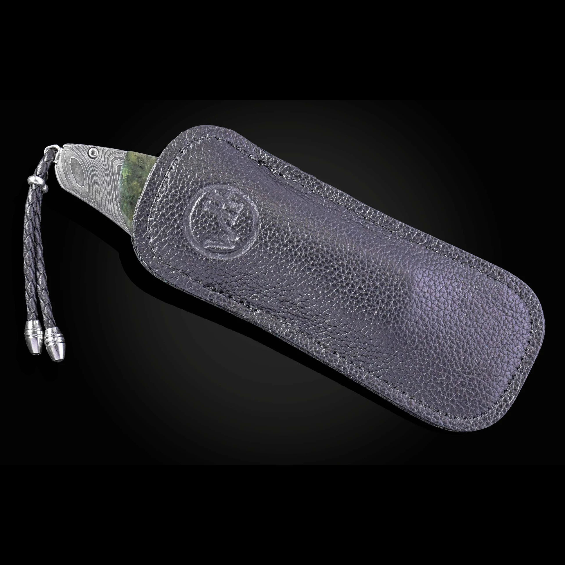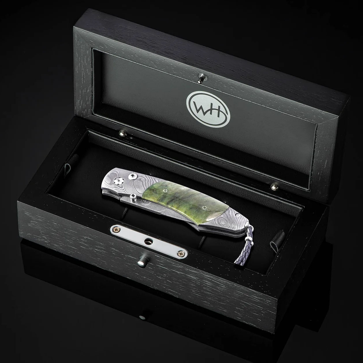 Spearpoint“绿丘”折刀拥有由Chad Nichols手工锻造的“扭曲”大马士革钢刀架,并镶嵌着一块精美的绿色玉石,令人叹为观止。刀刃则由Luke Mattern手工锻造的“土耳其”大马士革钢制成;单手按钮锁定装置和拇指柱均镶嵌有尖晶石。这款设计卓越的折刀拥有全尺寸的稳固握柄和用途广泛的深腹刀刃,完美诠释了William Henry的核心理念——卓越的功能性应与卓越的艺术性相得益彰。 “绿丘”折刀融合了William Henry系列标志性的珍稀材质、精湛工艺和锻造金属,堪称一件永恒的传世之作,值得您一生珍藏和使用,并可传承至下一代。
