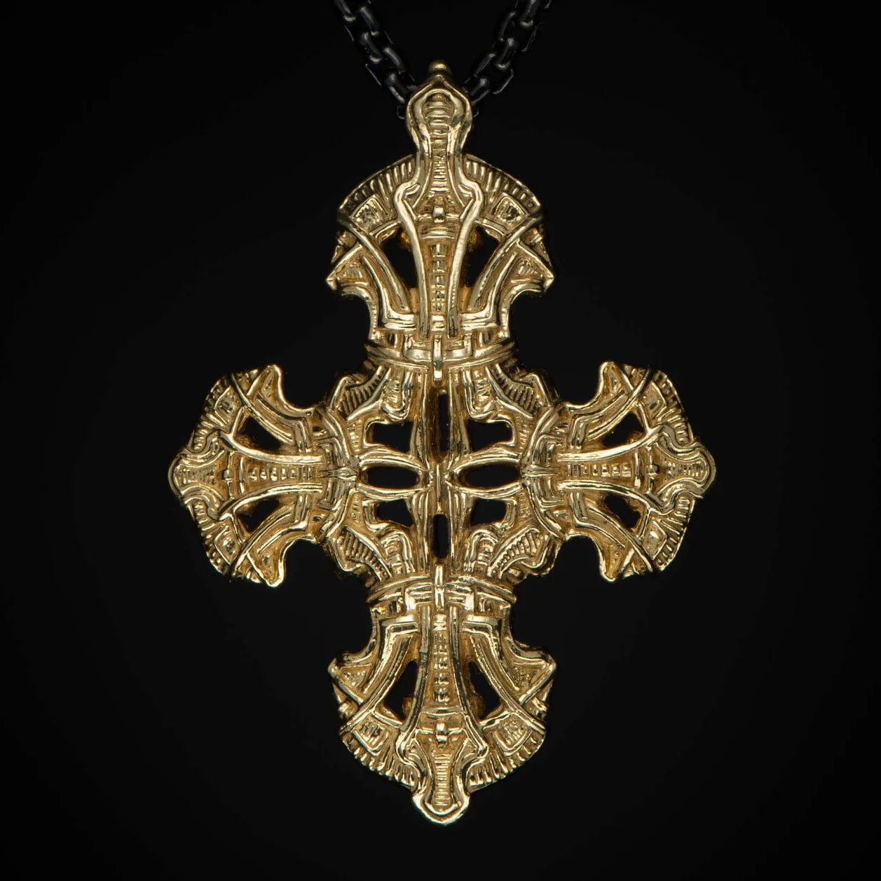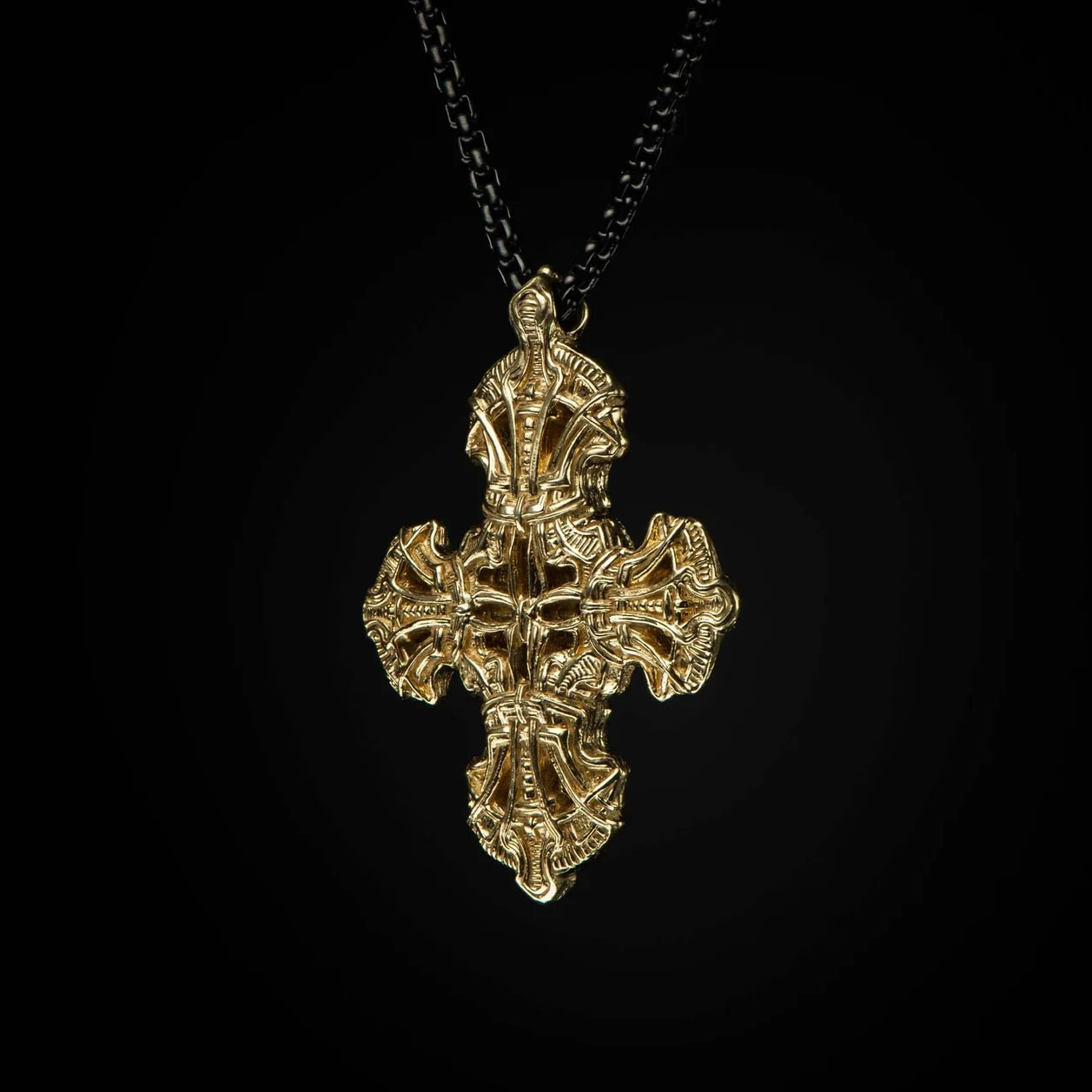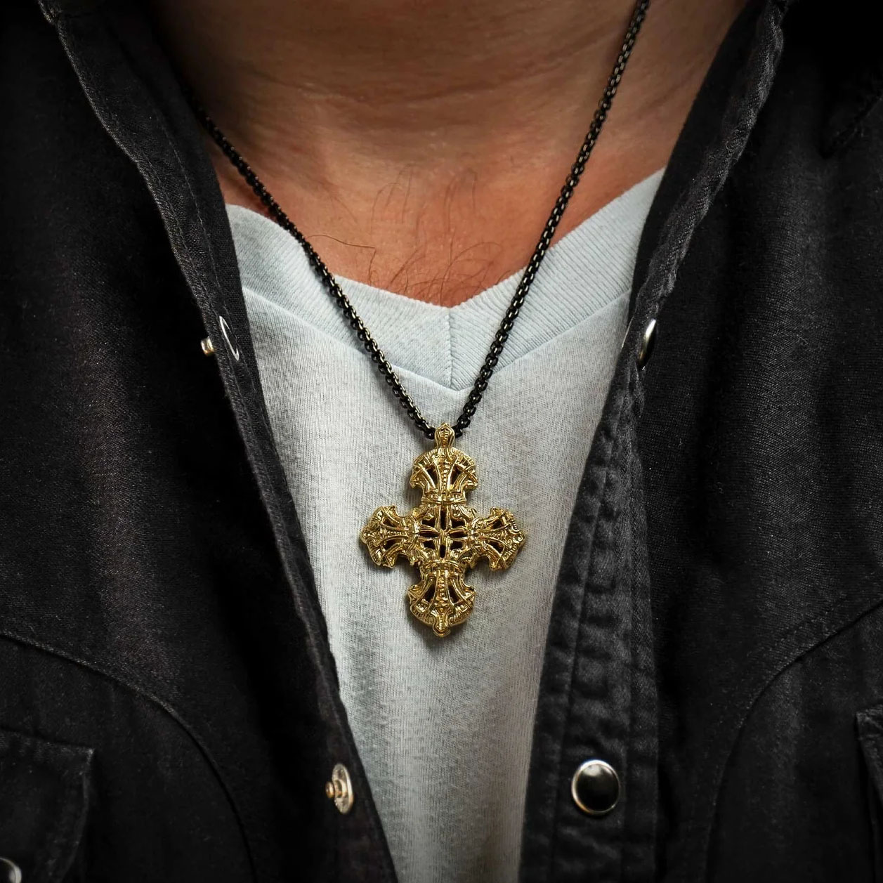 “宁静”是一款精美雕刻的十字架项链,其图案和纹理灵感源自中世纪盔甲。这款中等尺寸的项链既可单独佩戴,也可与其他项链叠戴,打造符合您个人风格的造型。项链采用18K纯金打造,搭配直径2.7毫米的黑色圆润盒式链,并配有龙虾扣,尽显奢华质感,可伴您一生。
