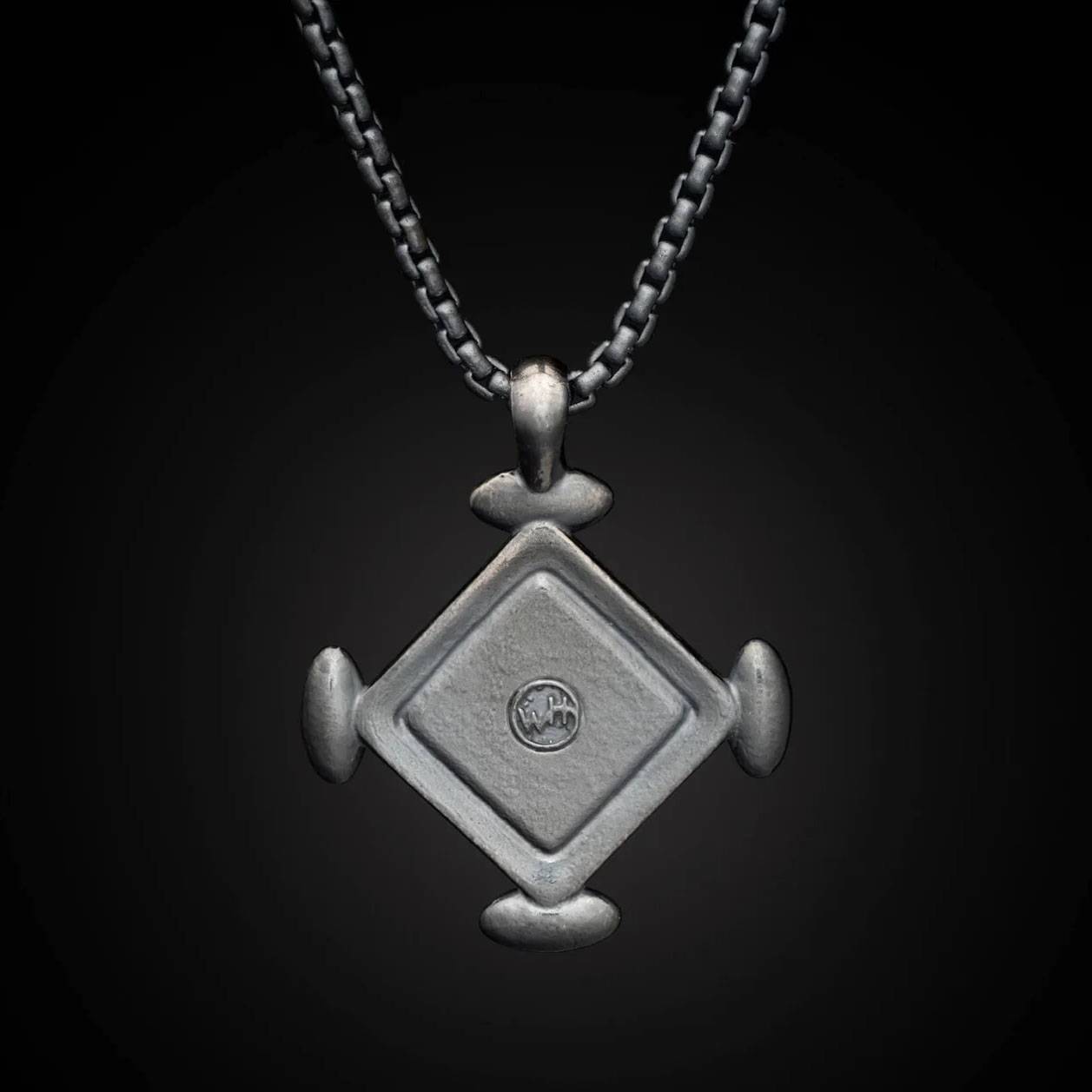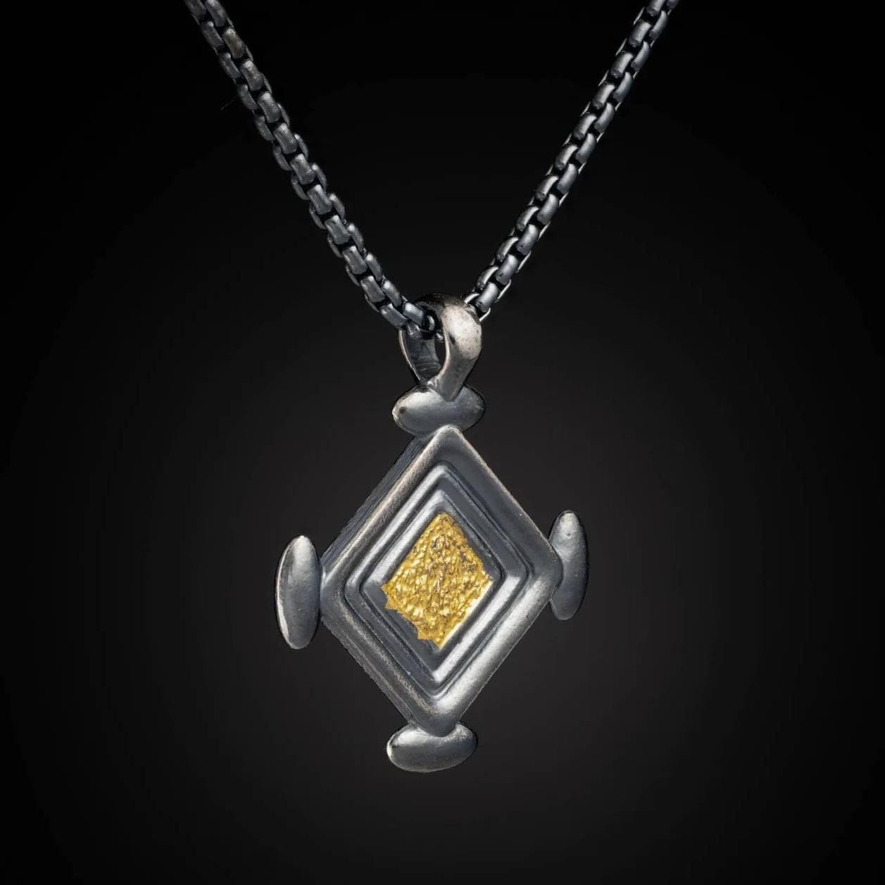 细节 这款四角方形吊坠采用做旧纯银打造,中央镶嵌23.5K金饰,运用金箔扩散焊接工艺,更显夺目。它完美融合了传统与现代,体现了古代与当代设计的艺术精髓。 产品 SKU:P62 - 22"
