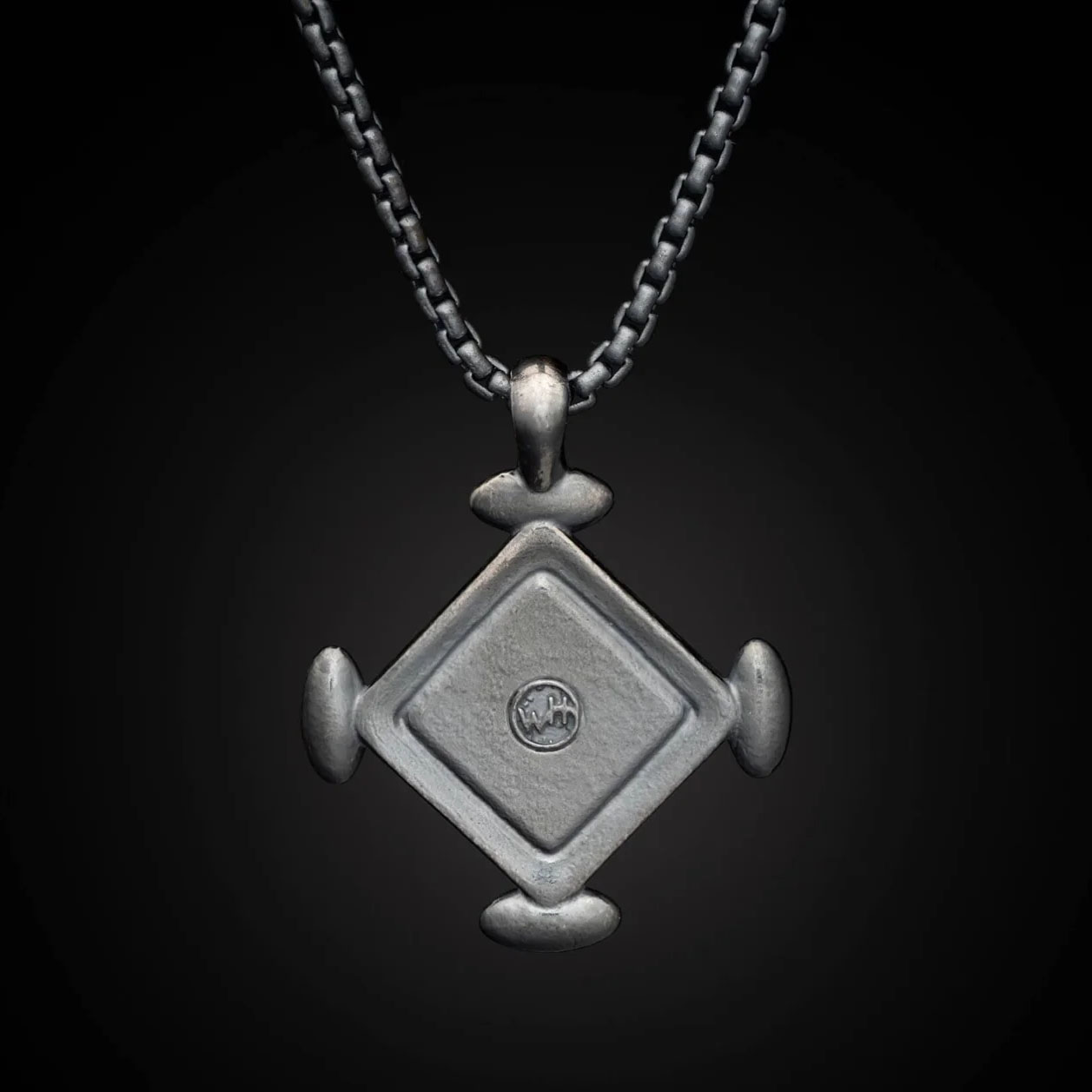 这款四角方形吊坠采用做旧纯银打造,中央镶嵌23.5K金饰,运用金箔扩散焊接工艺,更显夺目。它完美融合了传统与现代,体现了古代与当代设计的艺术精髓。