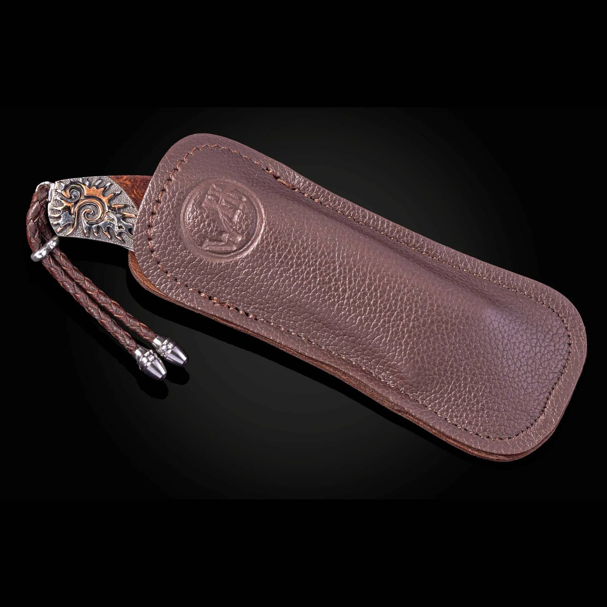 细节 这款名为“铜日升”的Contour折刀,拥有精美的手工雕刻纯银刀架,饰以木纹金,并镶嵌沙漠铁木。刀刃采用手工锻造的“铜波”大马士革钢,刀芯为VG-5钢材。单手按钮锁定装置和拇指柱均镶嵌有黄水晶宝石...