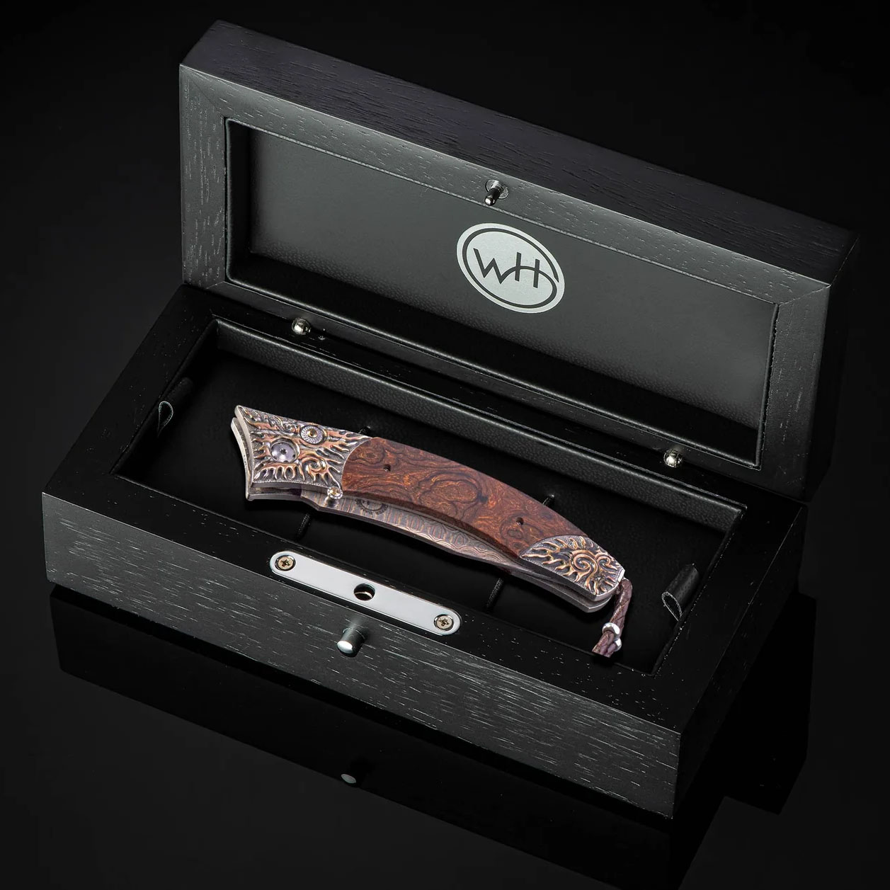 这款名为“铜日升”的Contour折刀,拥有精美的手工雕刻纯银刀架,饰以木纹金,并镶嵌沙漠铁木。刀刃采用手工锻造的“铜波”大马士革钢,刀芯为VG-5钢材。单手按钮锁定装置和拇指柱均镶嵌有黄水晶宝石。