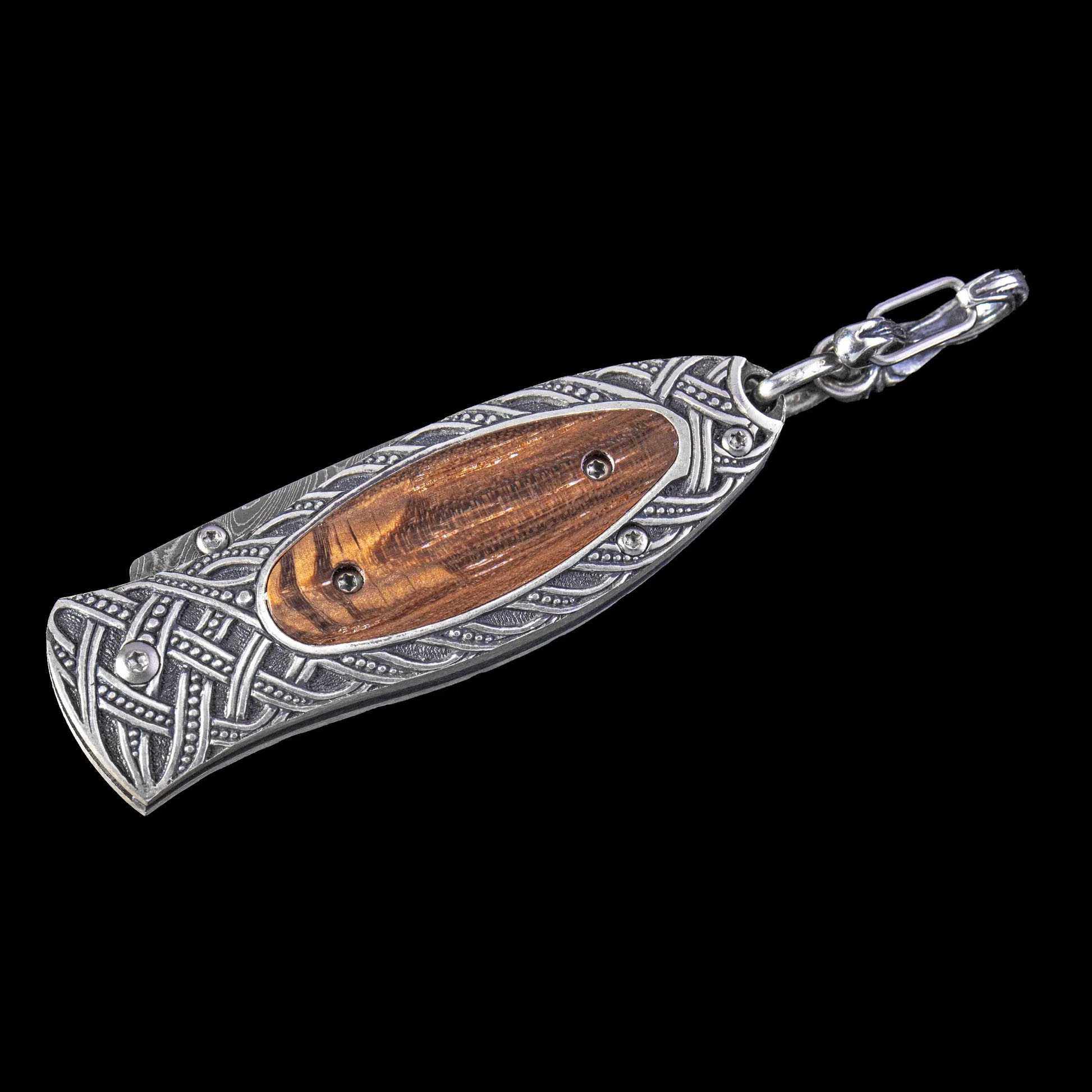 独一无二的刀具 - 定制刀具 型号:B02 墨菲斯 刀刃:“回旋镖”大马士革钢 - 查德·尼科尔斯 镜框:铸造纯银 规模:'Eyrie Vineyard' 黑皮诺葡萄藤 宝石:烟晶