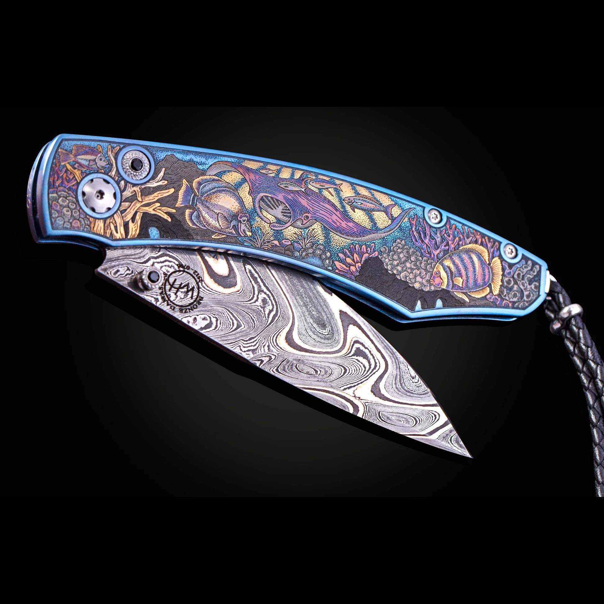 Spearpoint“Seascape II”折刀拥有精美的钛合金刀架,由Bottega Incisioni进行彩色激光雕刻,并由Mick Butterworth绘制图案。刀刃采用Baker Forge手工锻造的“Rip Tide”大马士革钢;单手按钮锁定装置和拇指柱均镶嵌尖晶石。这款设计卓越的折刀拥有全尺寸的稳固握柄和用途广泛的深腹刀刃,完美诠释了William Henry的核心理念——卓越的功能应与卓越的艺术相得益彰。“Seascape II”折刀展现了William Henry系列产品一贯的精湛工艺和手工锻造金属,堪称一件永恒的传世之作,值得您一生珍藏和使用,并可传承至下一代。