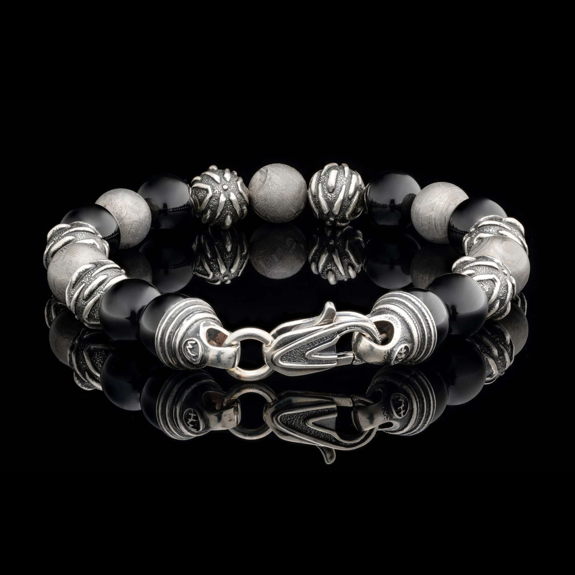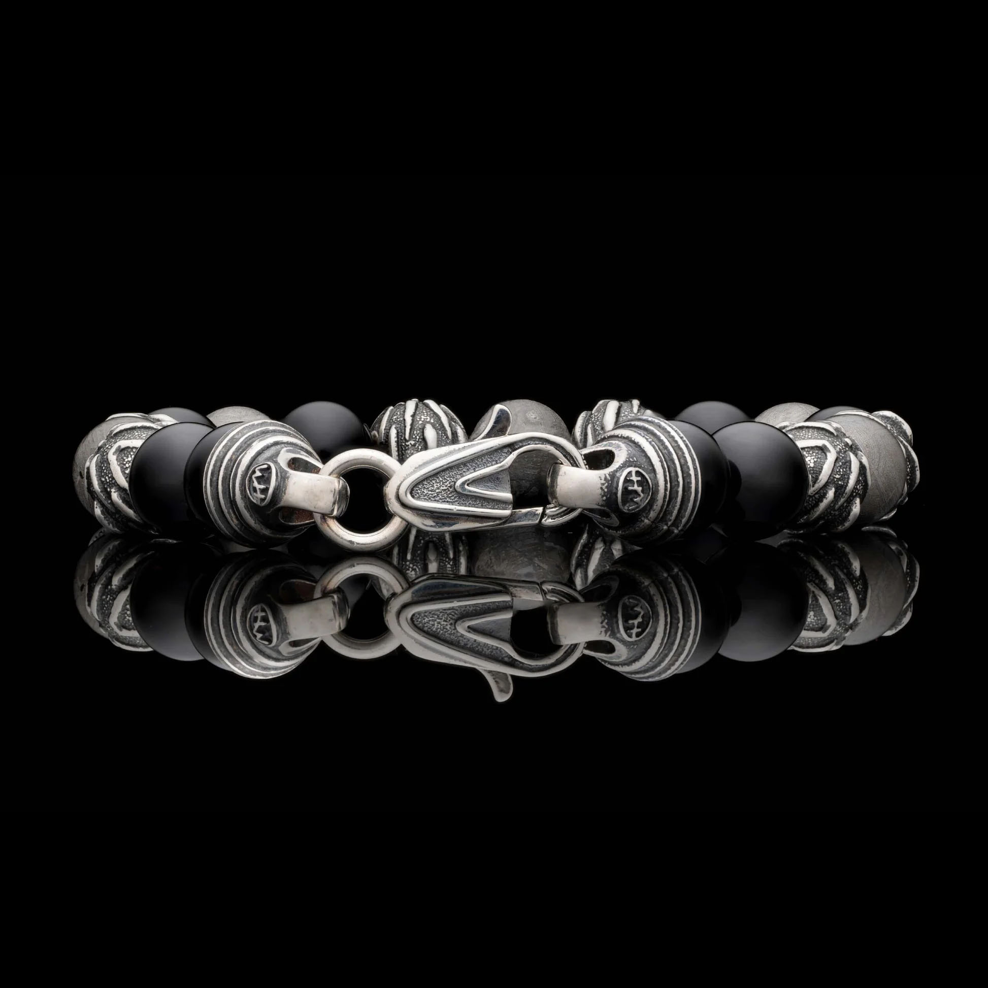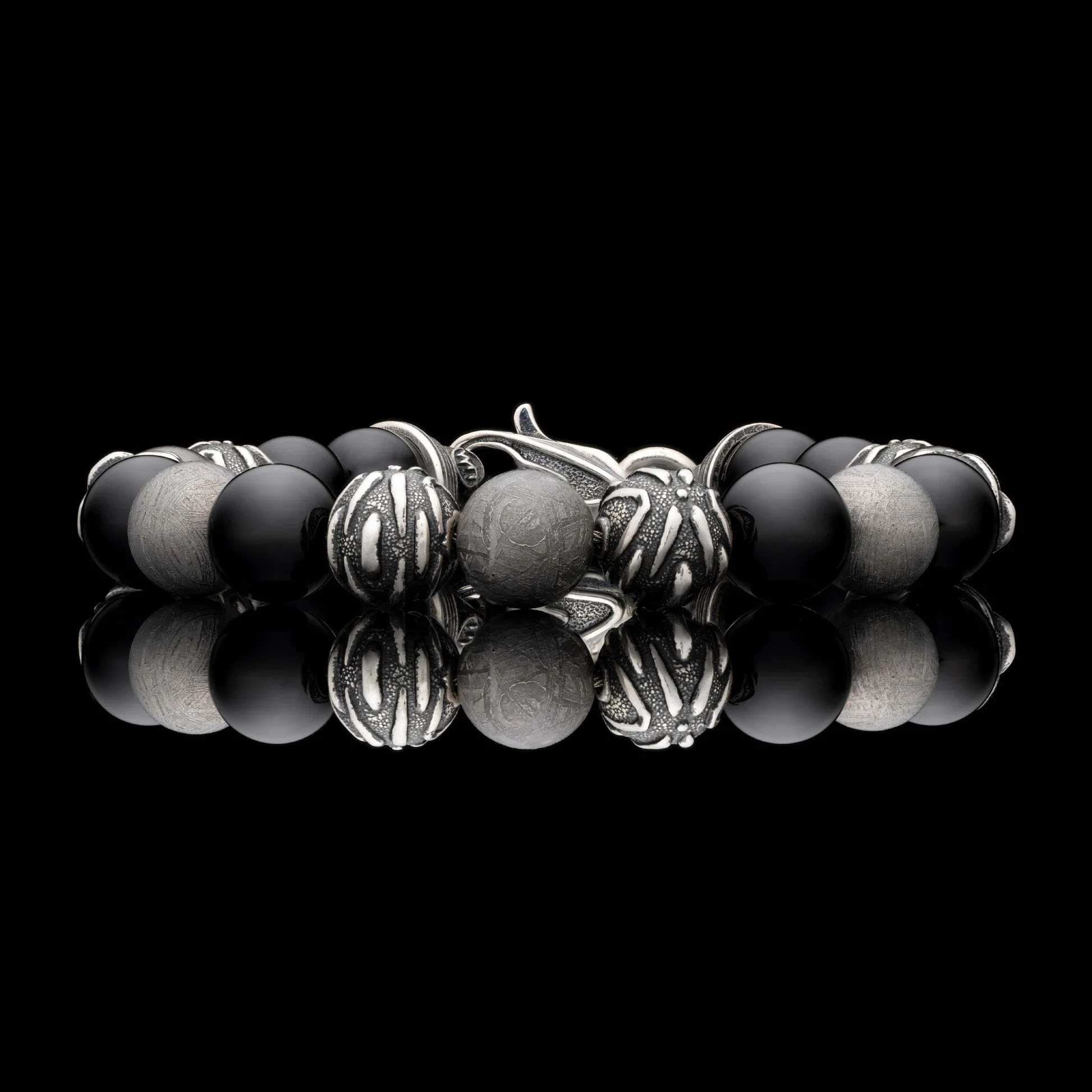 “Archeon”串珠手链引领你进入未知领域,它采用 10 毫米陶瓷涂层吉贝陨石珠、雕塑般的做旧纯银装饰珠和抛光黑玛瑙珠,映衬着宁静的太空虚空。