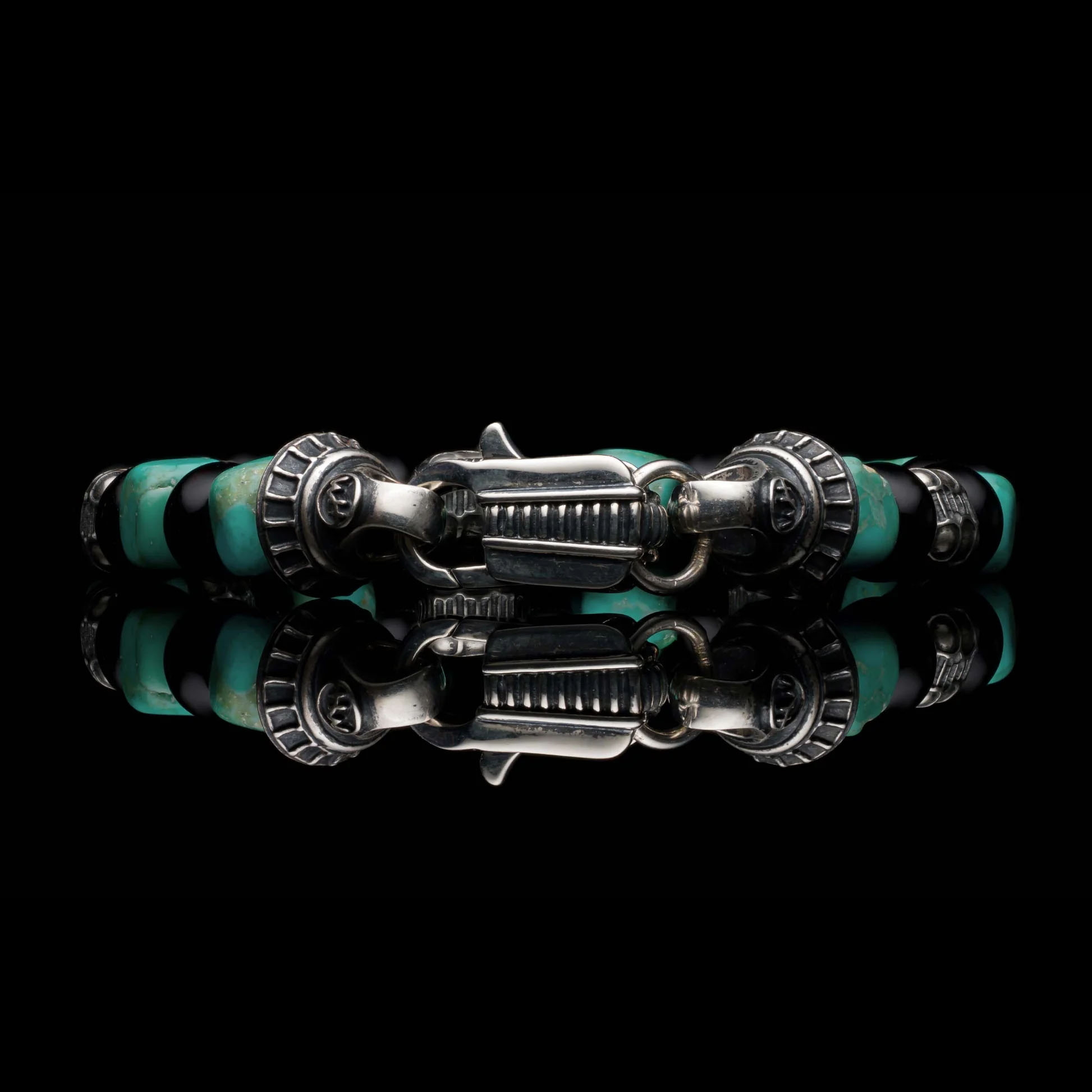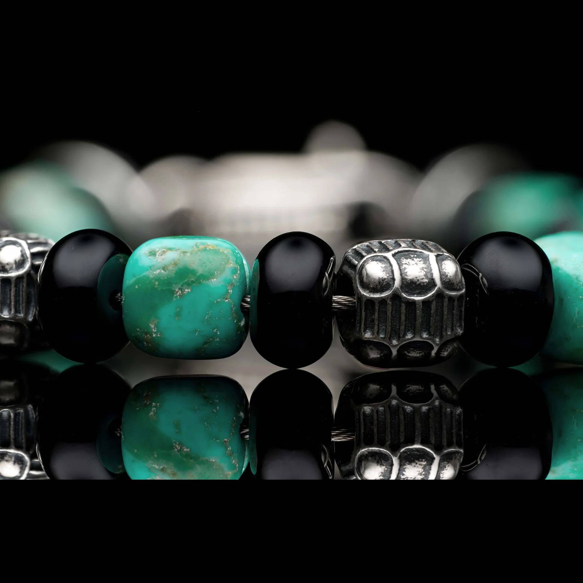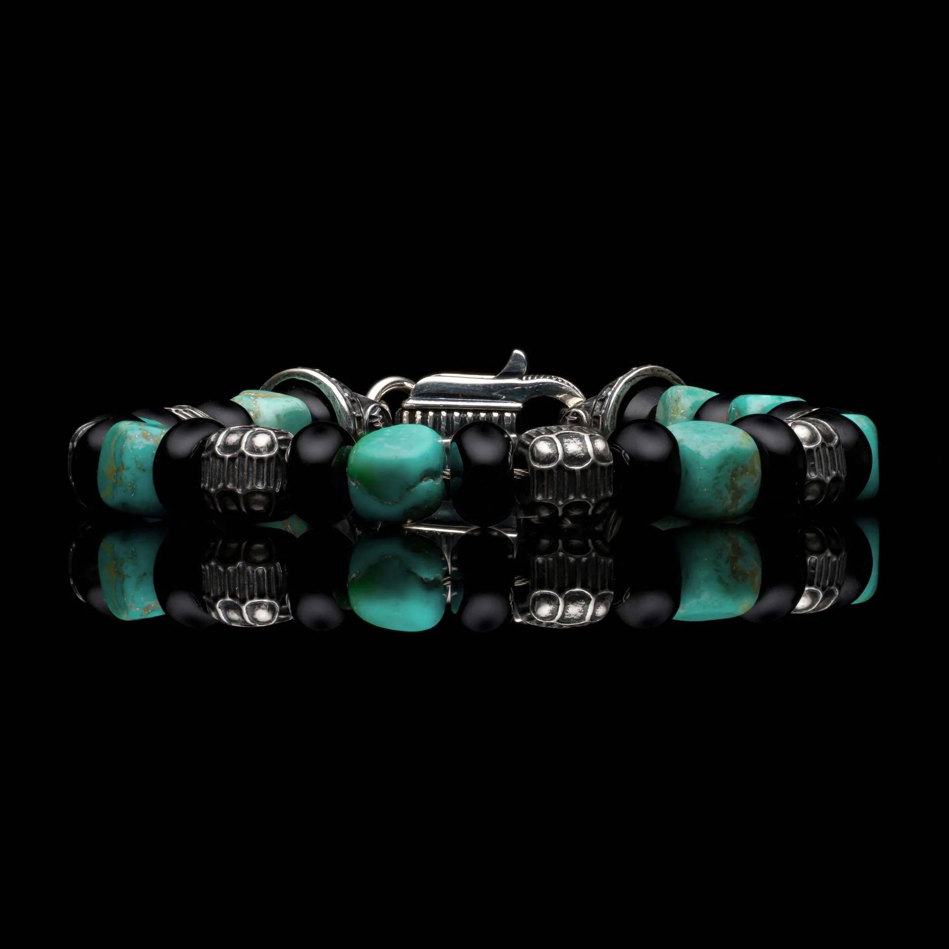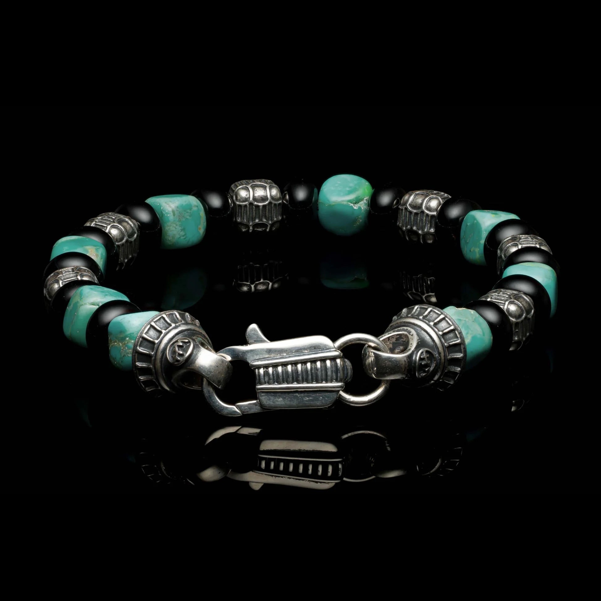 现代造型,古老灵魂。这款手链采用金曼绿松石立方体珠、抛光黑玛瑙圆珠和雕刻纯银绗缝立方体珠,并配以定制搭扣。几何造型,精致优雅,独具一格。