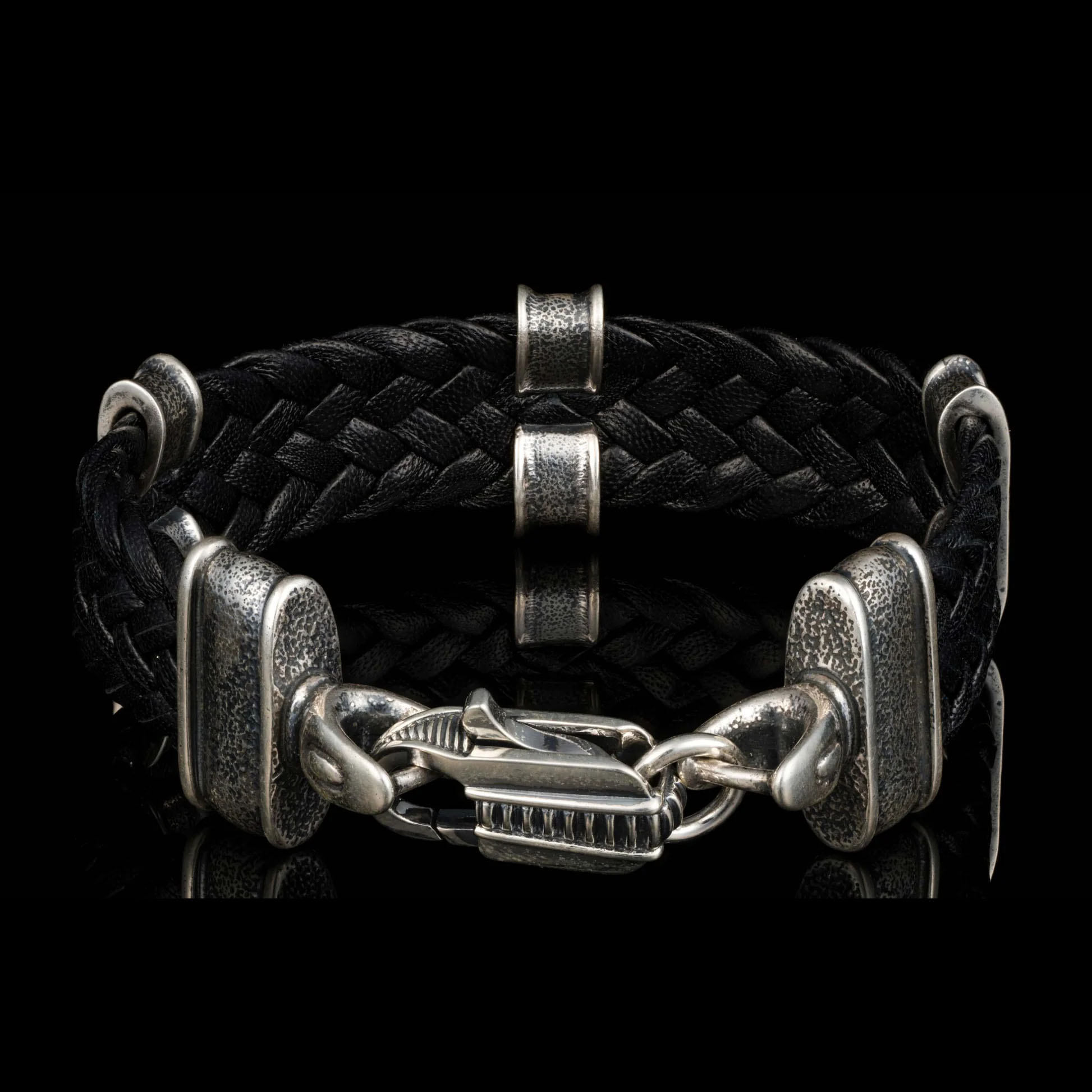 这款名为“Tilt”的皮革手镯采用质感丰富的宽幅编织袋鼠皮,并饰以纹理细腻、做旧处理的纯银细节,呈现出威廉·亨利独有的深邃美感。这款厚重的手镯展现了精湛的工艺和卓越的品质,佩戴舒适,令人过目难忘。