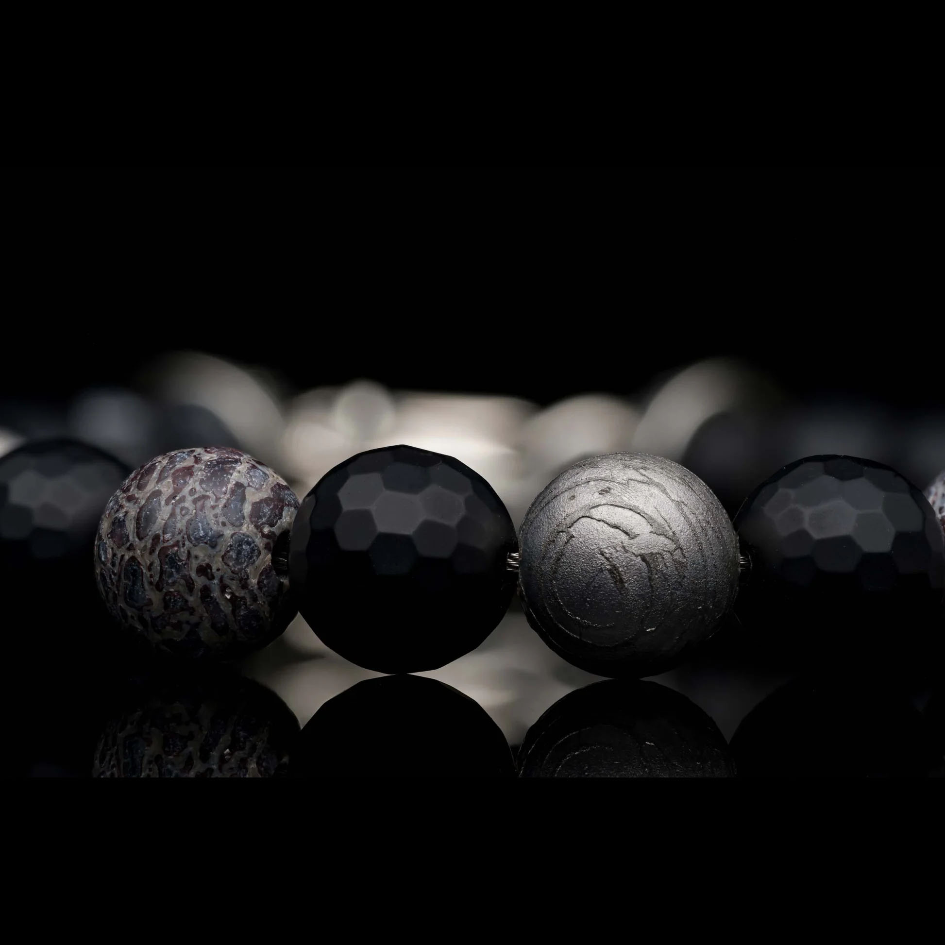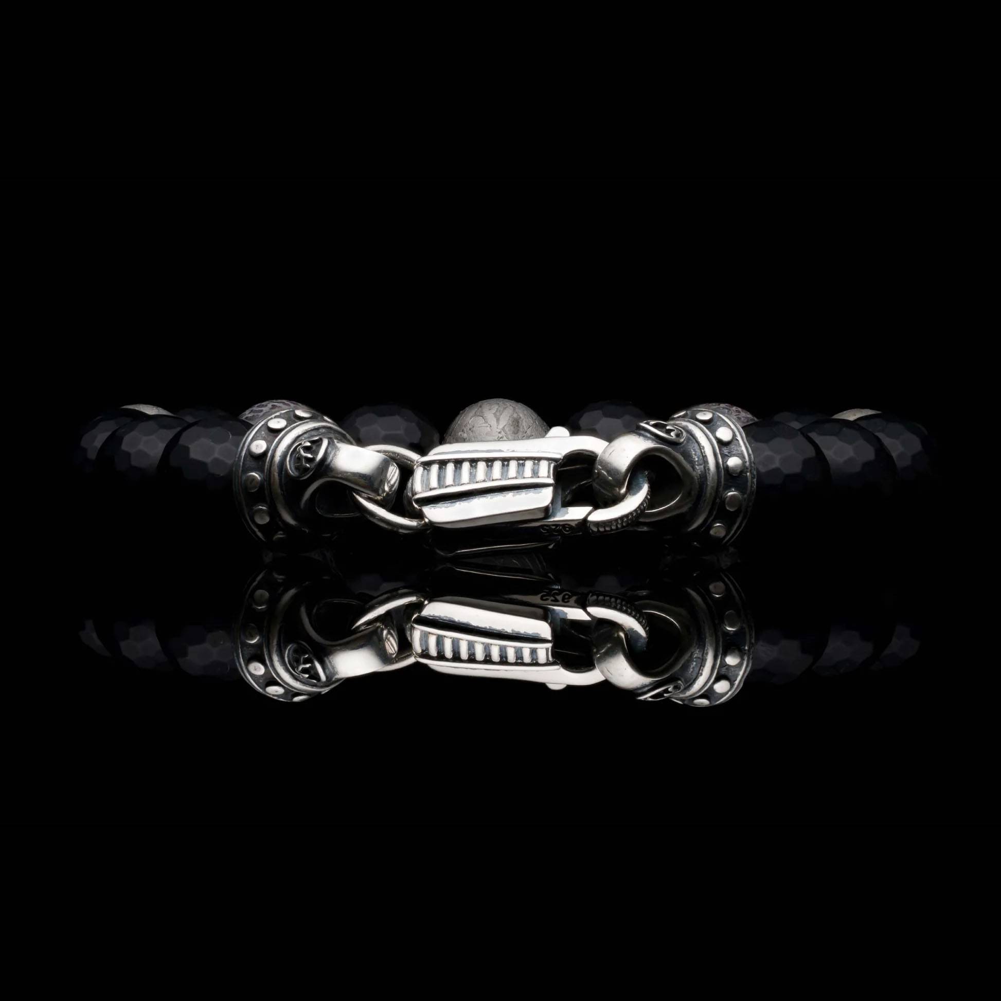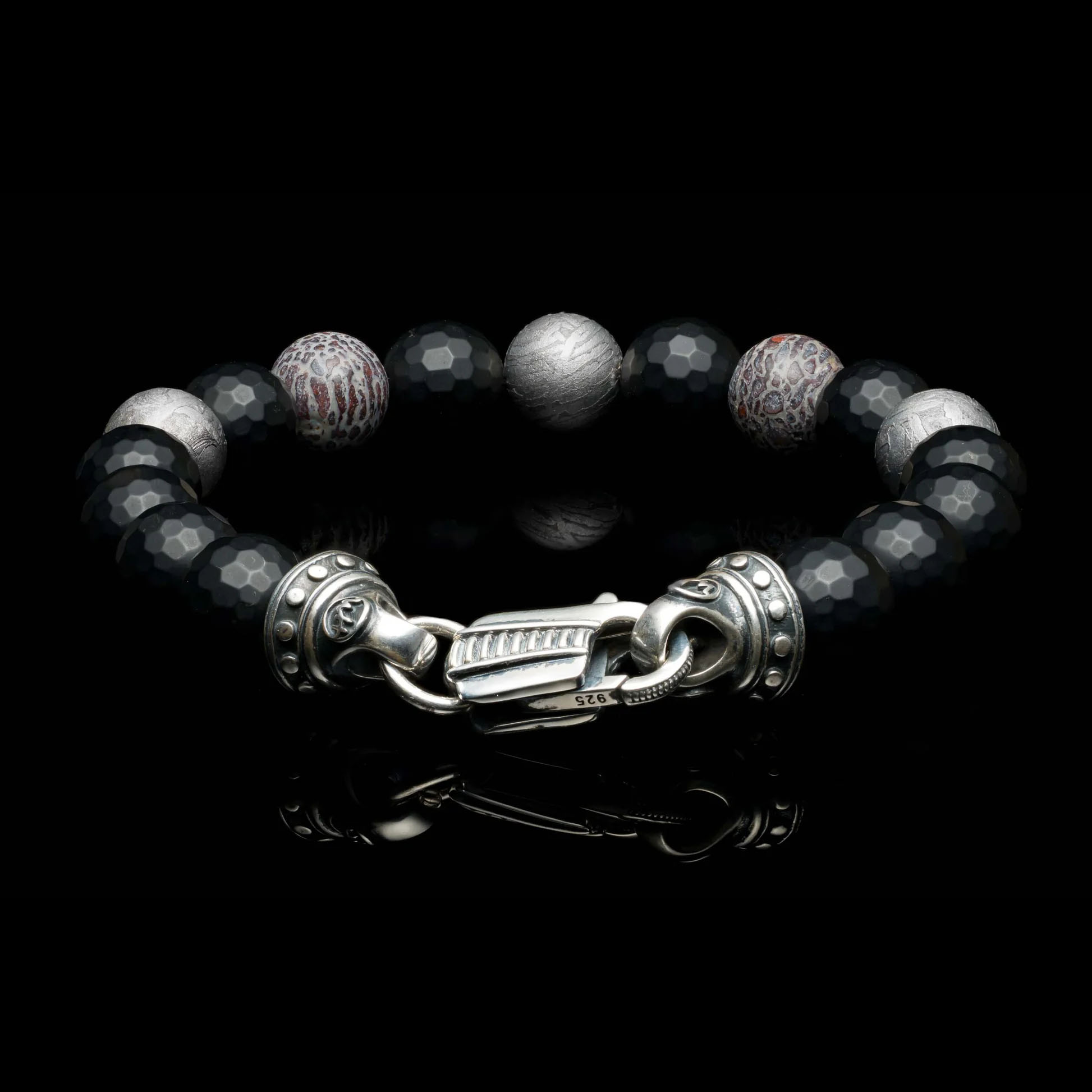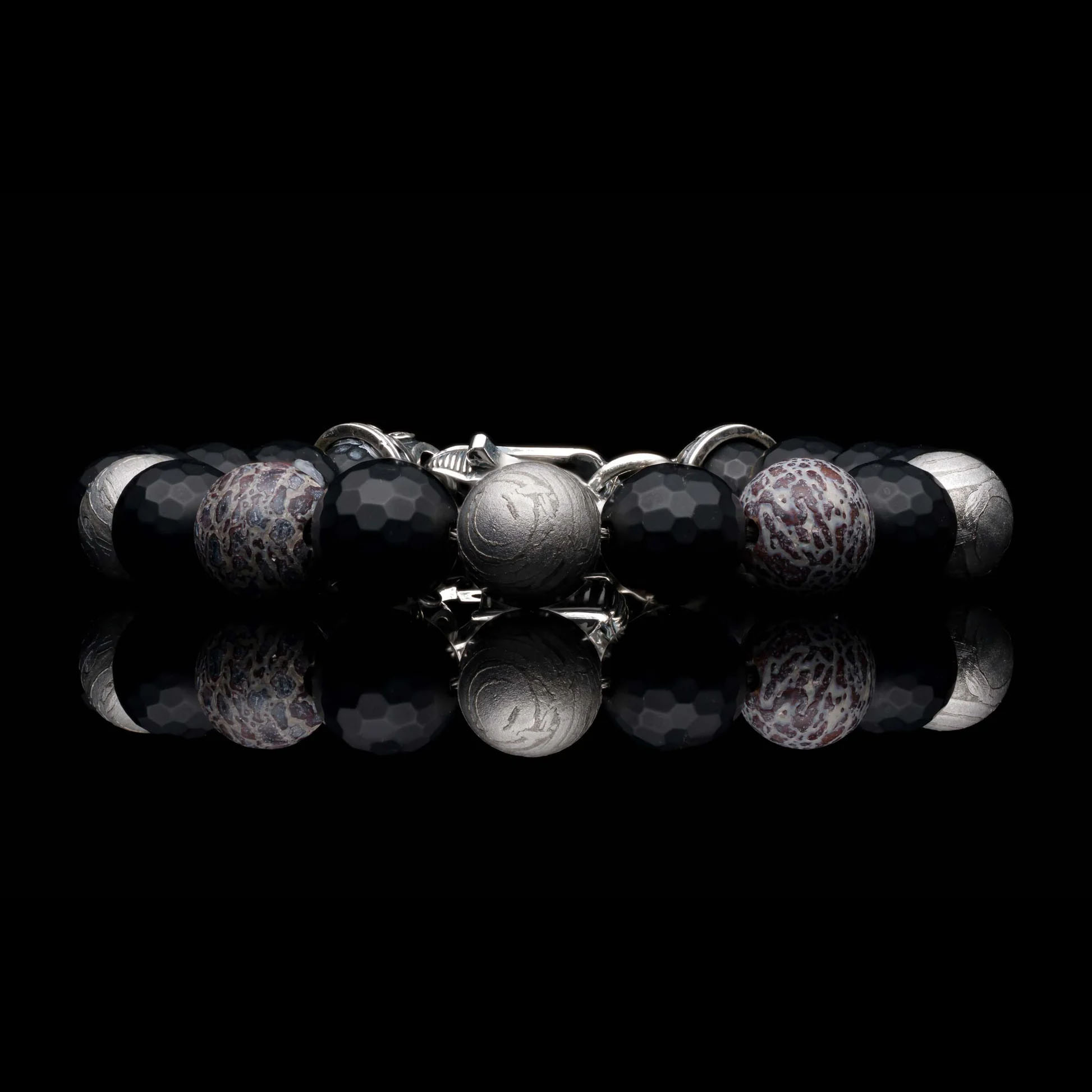 史前。宇宙。脚踏实地。这件作品巧妙融合了恐龙骨和吉贝陨石珠,搭配哑光刻面黑玛瑙,呈现出精致的质感和色调对比。配以定制搭扣,专为那些欣赏含蓄之美和细节之稀有的人士打造。