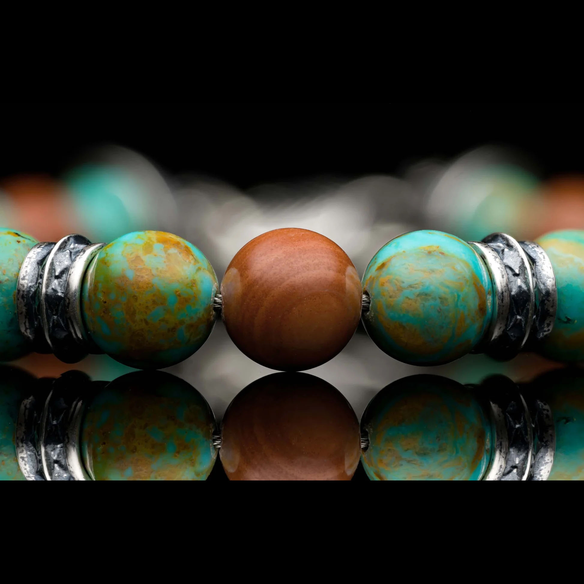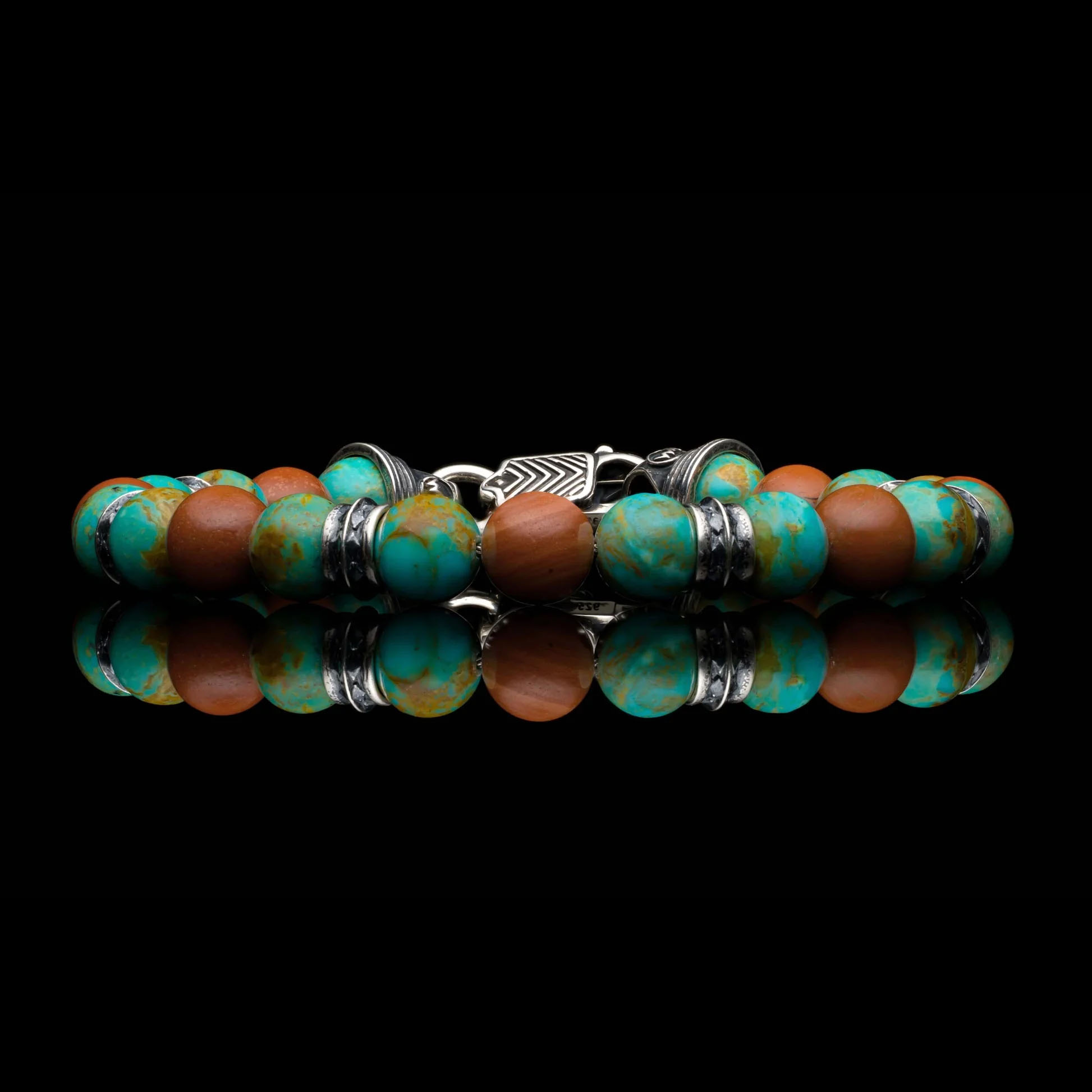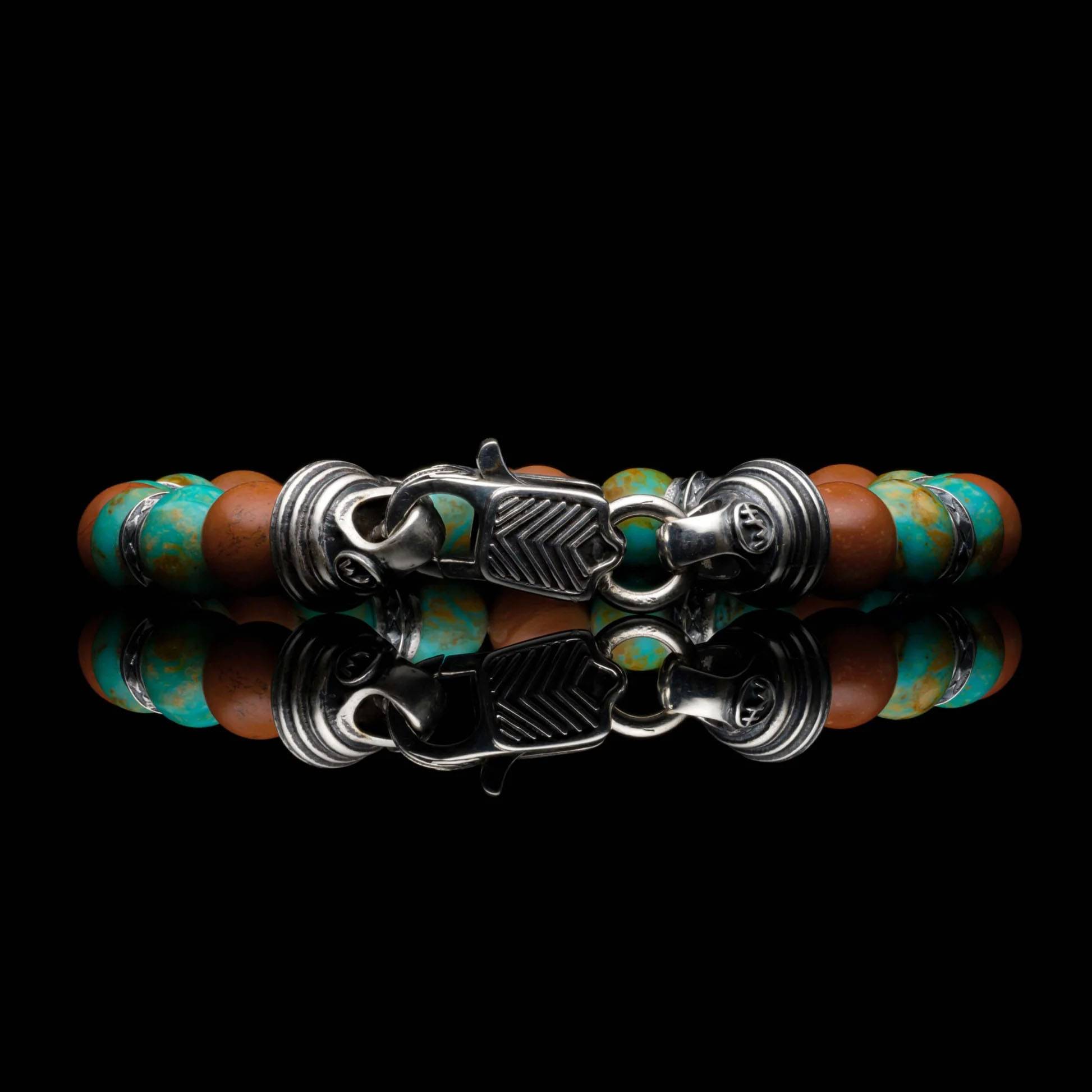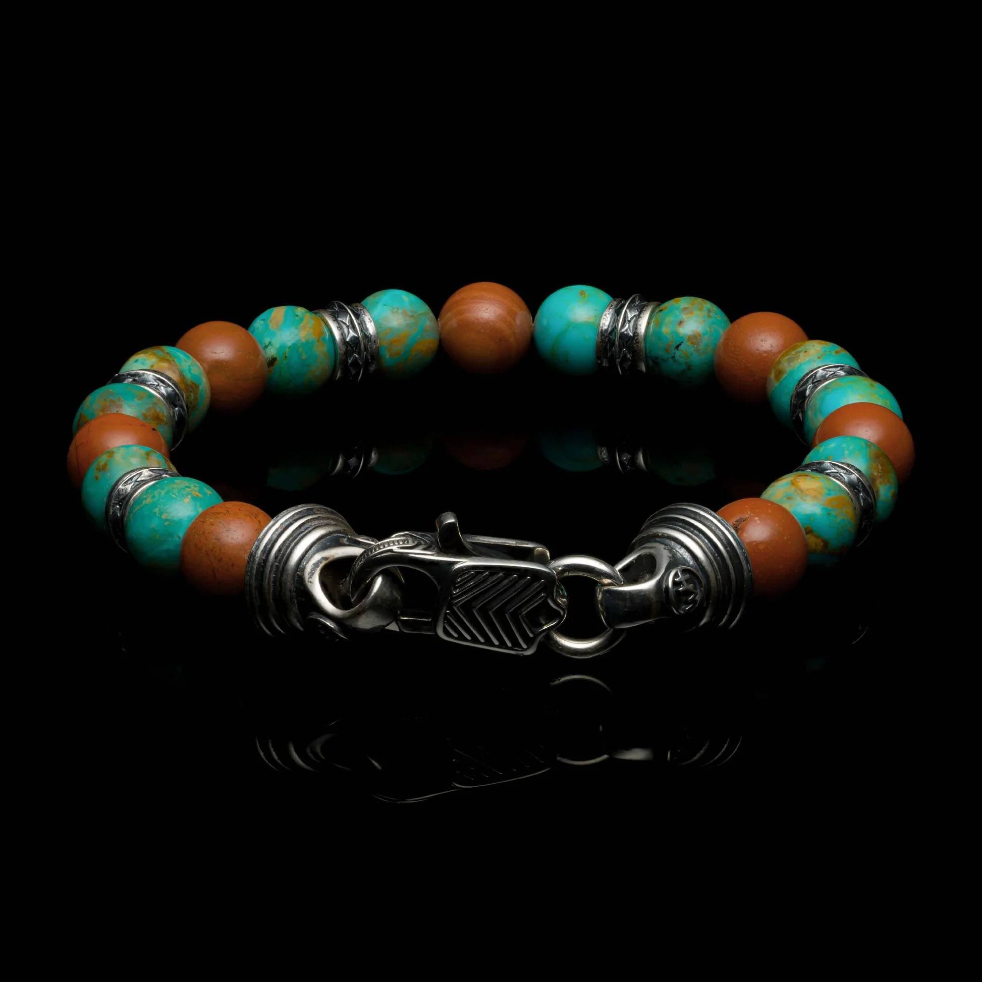 这款作品大胆而平衡,将金曼绿松石与深红色碧玉珠巧妙搭配——质朴、充满活力且经久不衰。饰以纯银配件和定制搭扣,彰显力量、个性与精致传承。