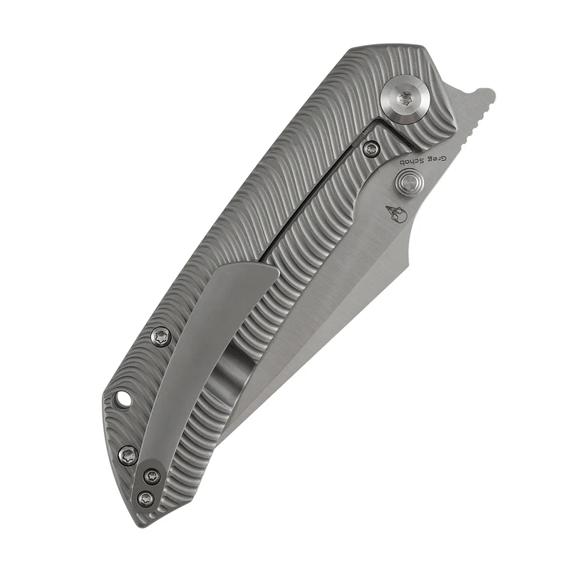 Fenrir采用了业界认可的框架锁结构作为锁具机构。 同时,它保留了实用的拇指钉设计。拇指螺柱表面处理有防滑花纹;结合Frame Lock的顺滑回弹特性,用户只需一根手指即可快速推动拇指螺柱以展开刀刃——过程中不会发生卡壳,开刀动作顺畅。
