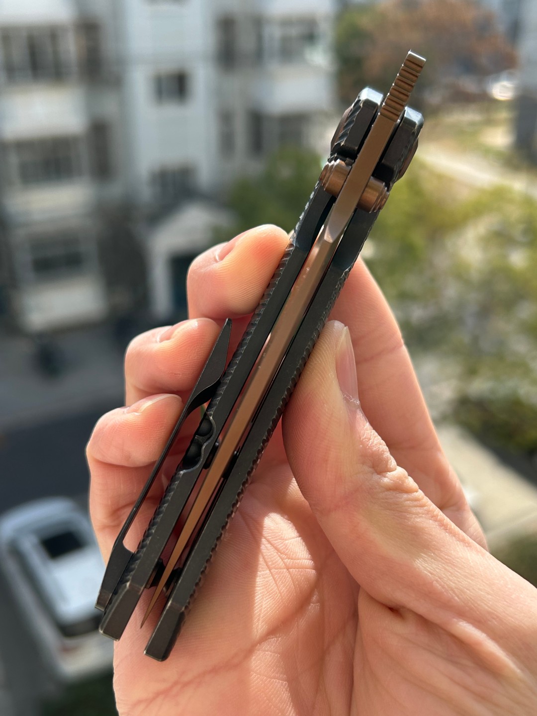 Fenrir采用了业界认可的框架锁结构作为锁具机构。 同时,它保留了实用的拇指钉设计。拇指螺柱表面处理有防滑花纹;结合Frame Lock的顺滑回弹特性,用户只需一根手指即可快速推动拇指螺柱以展开刀刃——过程中不会发生卡壳,开刀动作顺畅。