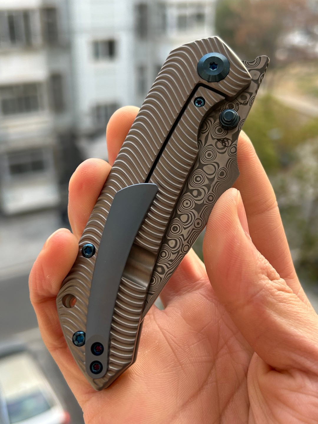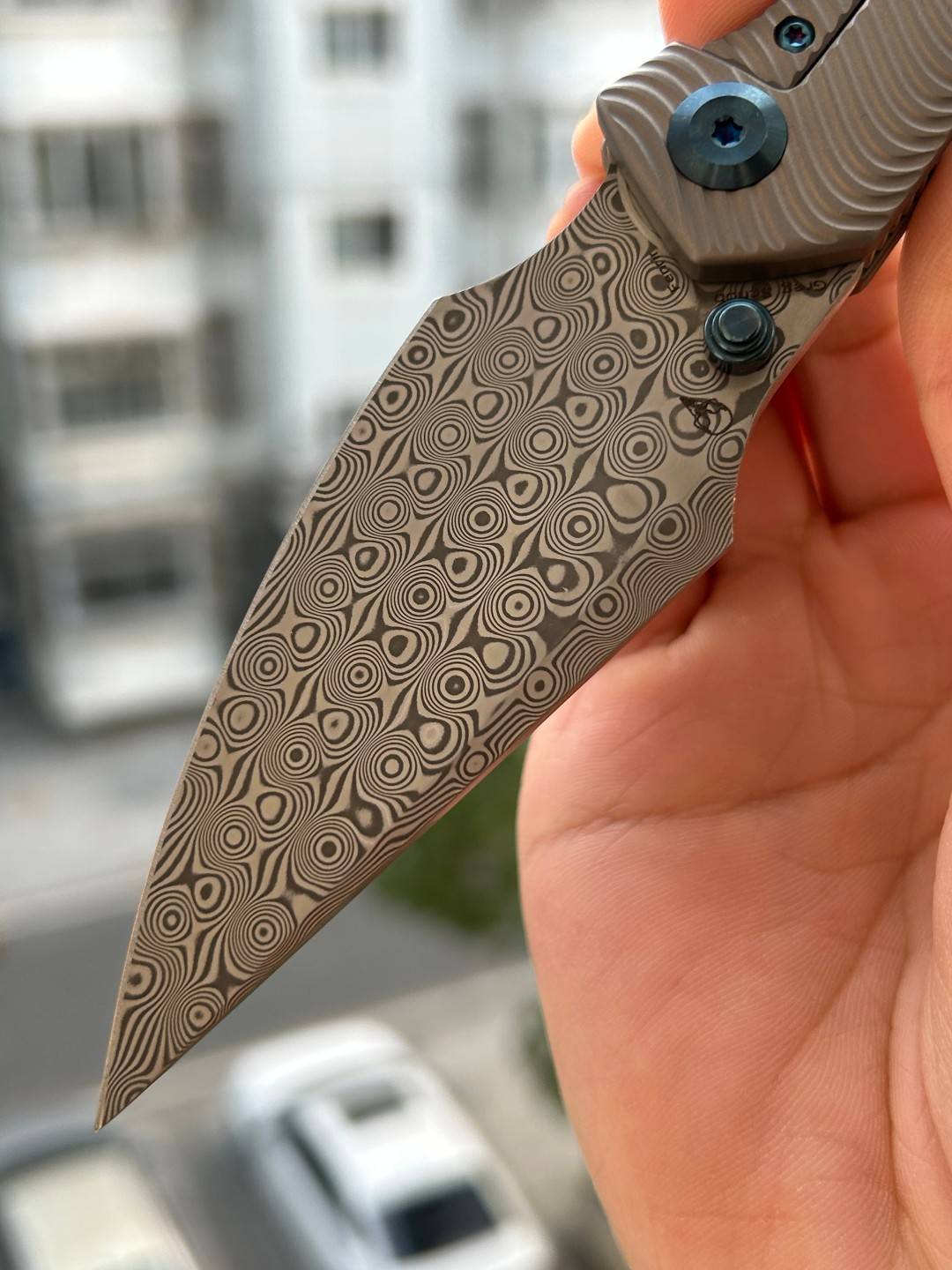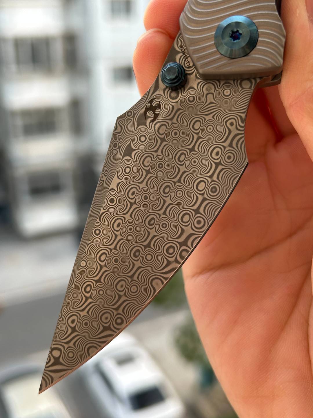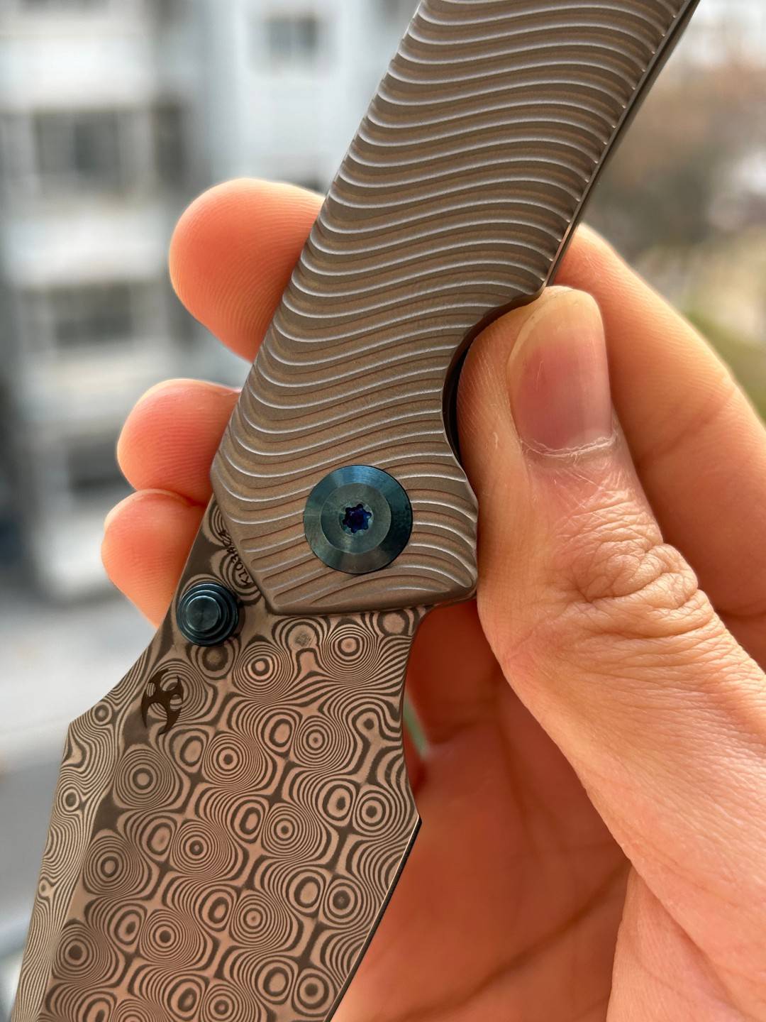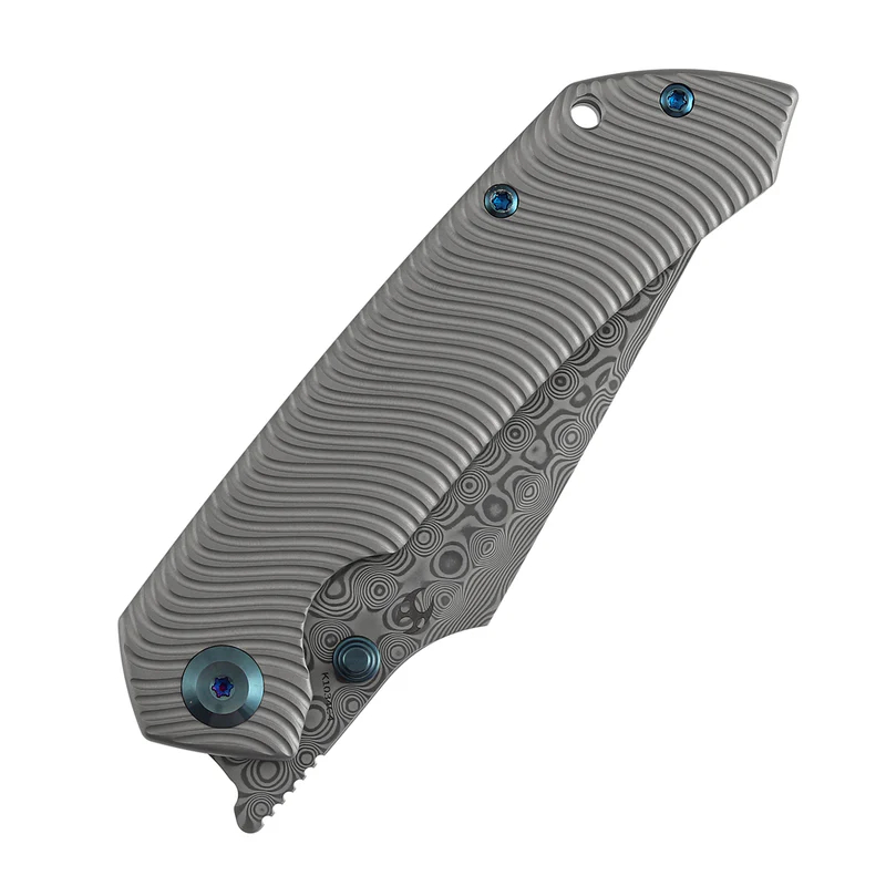 芬里尔采用经典的鱼叉式CPMS35VN/大马士革刀刃,宽阔弯曲的刀腹成为核心亮点。这个腹部的弯曲经过精确计算:切片时,它贴合食材表面以减少阻力,从而实现均匀整齐的切割;穿刺时,它允许精准施加力量以防止刀片晃动,为用户提供稳定且受控的作体验。