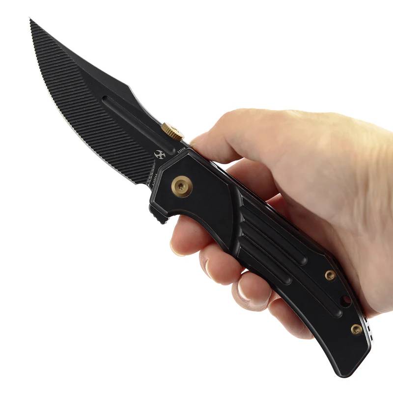 手柄采用钛合金制成,两侧刻有精细的凹槽,平面表面涂有机械染色,增添了精致感,提升刀具的高端质感。 - 多种展开选项