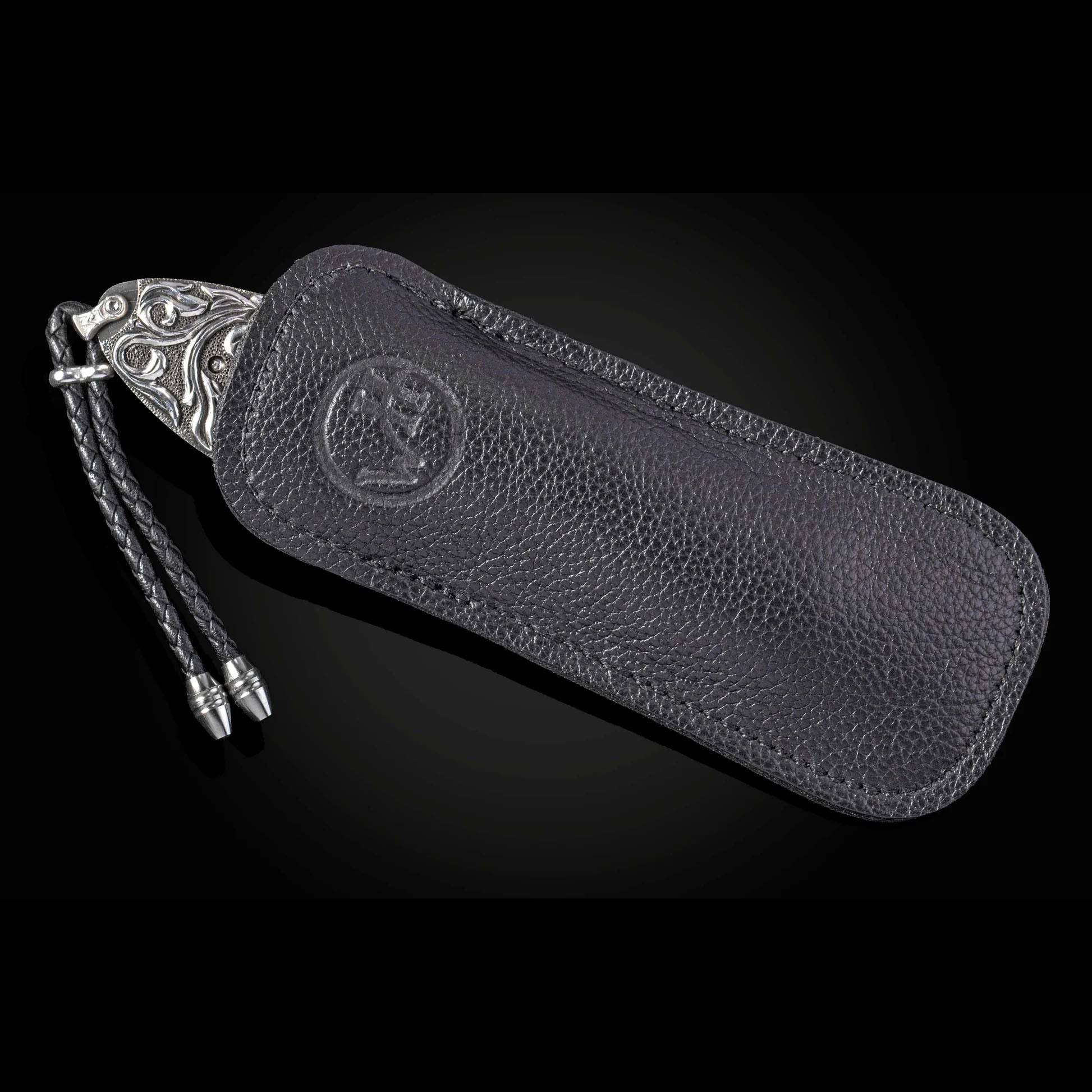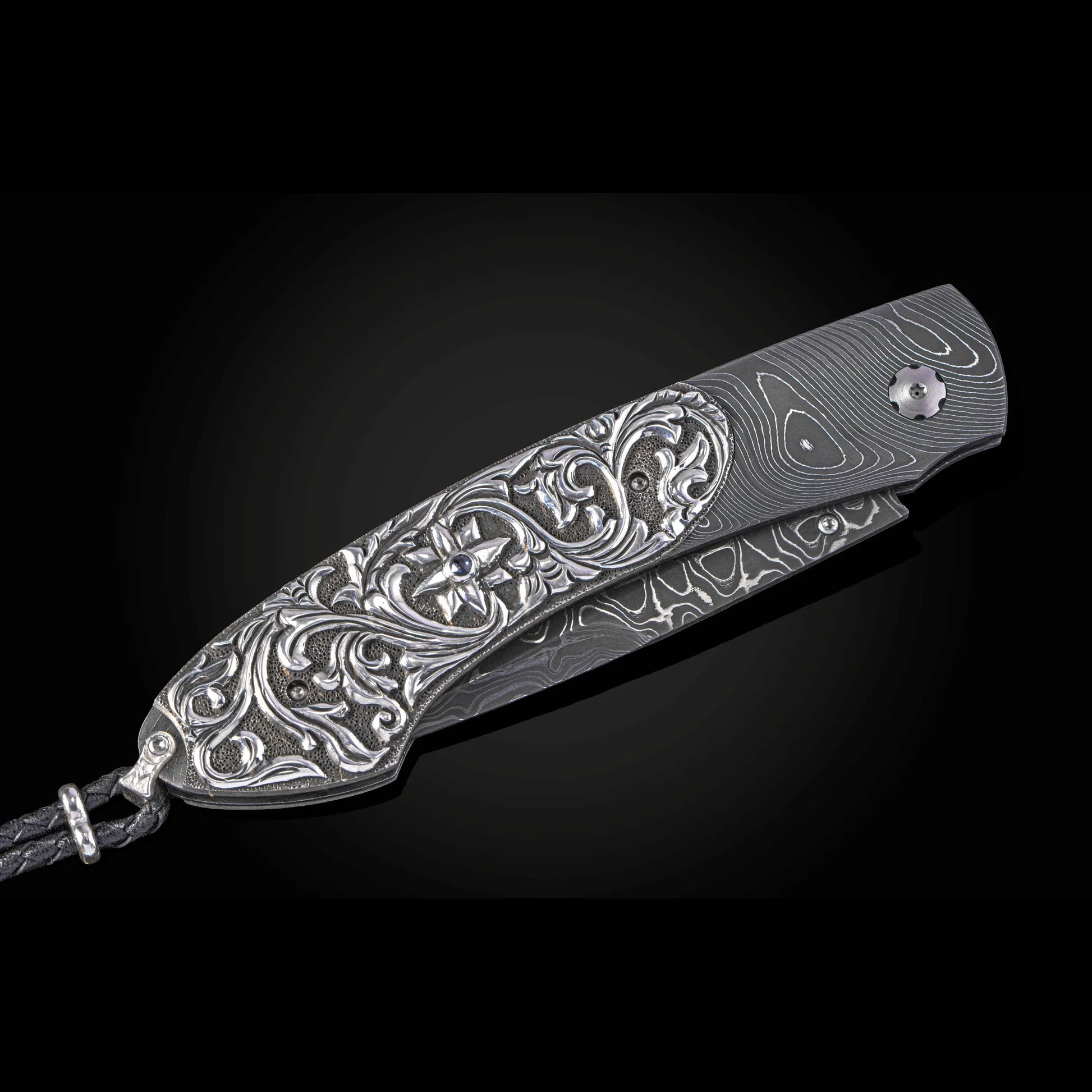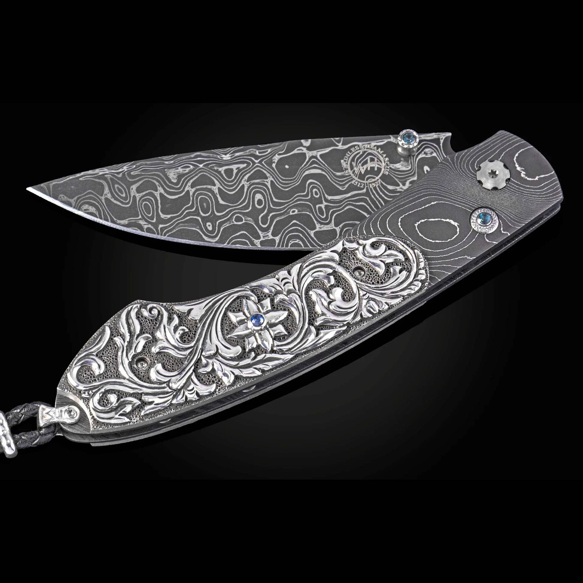 细节 这款名为“蓝旋”的矛尖折刀,由查德·尼科尔斯手工锻造“扭曲”大马士革钢刀架,并镶嵌李·唐尼手工雕刻的精美纯银刀柄和蓝宝石。刀刃同样由查德·尼科尔斯手工锻造“无畏”大马士革钢;单手按钮锁定装置...