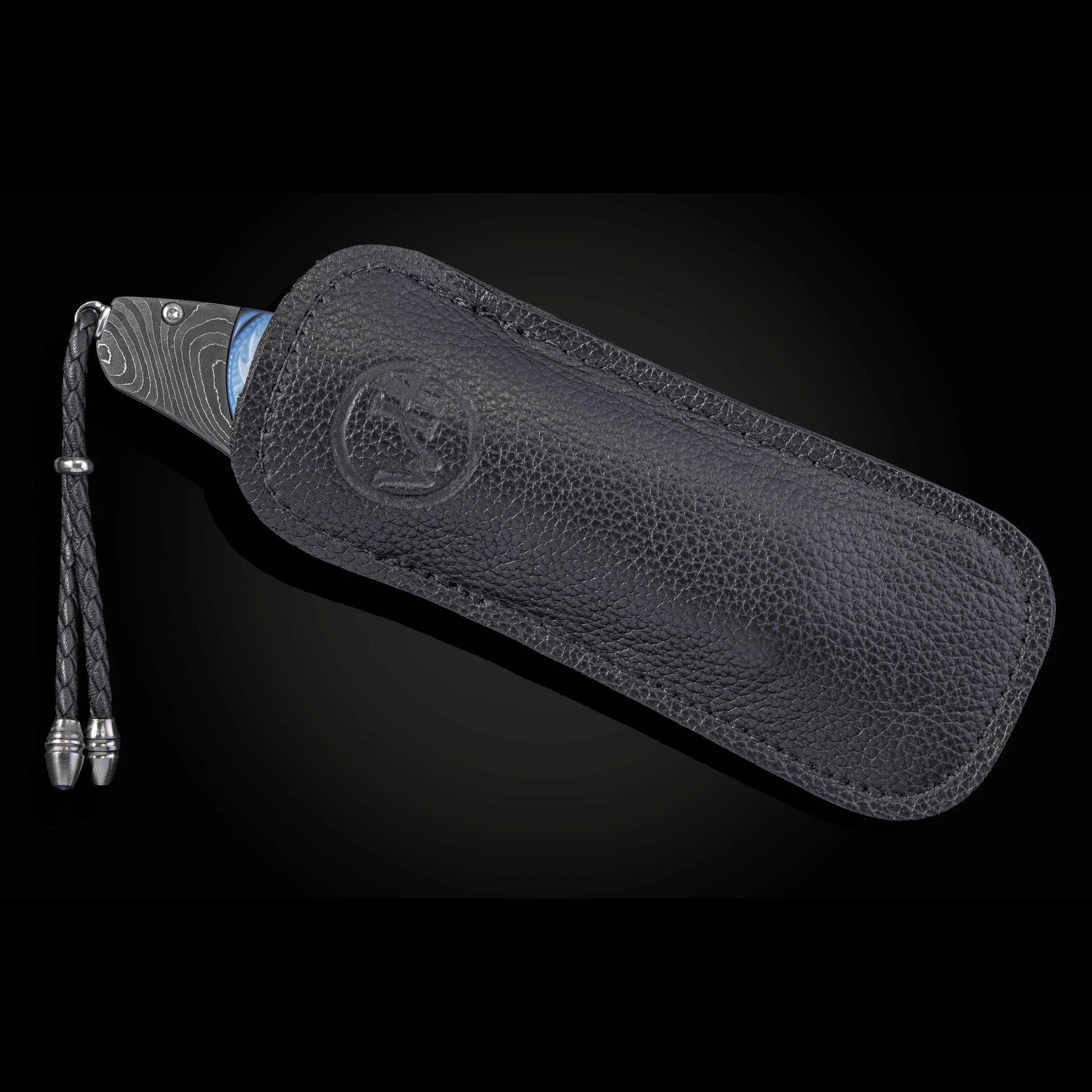 细节 Spearpoint“巨龙之谜”折刀的刀架由Chad Nichols手工锻造的“扭曲”大马士革钢制成,并镶嵌精美的雕刻条纹玛瑙鳞片。刀刃则由Luke Mattern手工锻造的“土耳其”大马士革钢打造;单手按钮锁定装置和拇...