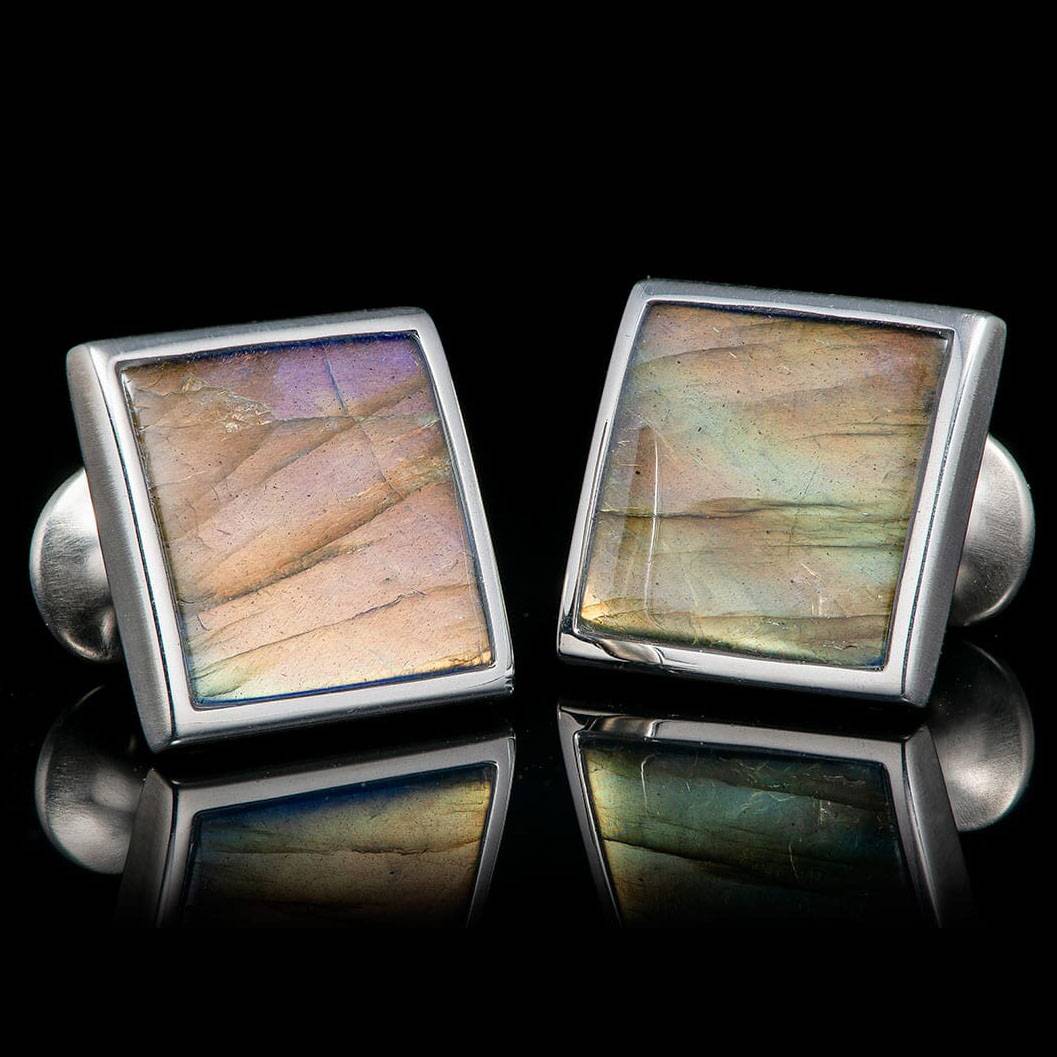 这款精美的袖扣,将黄昏时分天空的色彩栩栩如生地呈现在您眼前。袖扣采用纯银精雕细琢而成,镶嵌拉长石;蓝、绿、紫、黑等色调交织变幻,与拉长石的天然纹理相映成趣,展现出大自然的壮丽之美。它