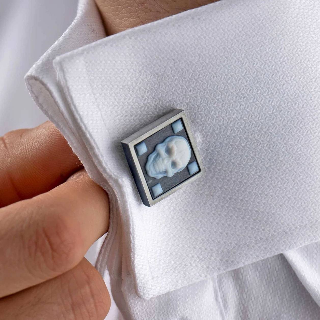 细节 这套精美的纯银袖扣饰有赫伯特·斯蒂芬创作的美丽条纹玛瑙镶嵌。 产品 SKU:CL SKULL