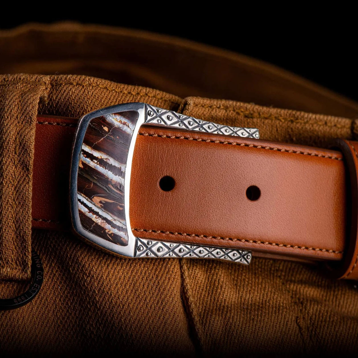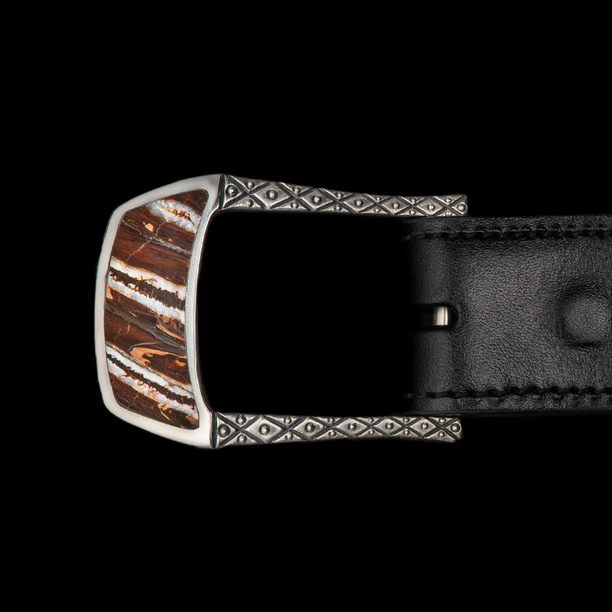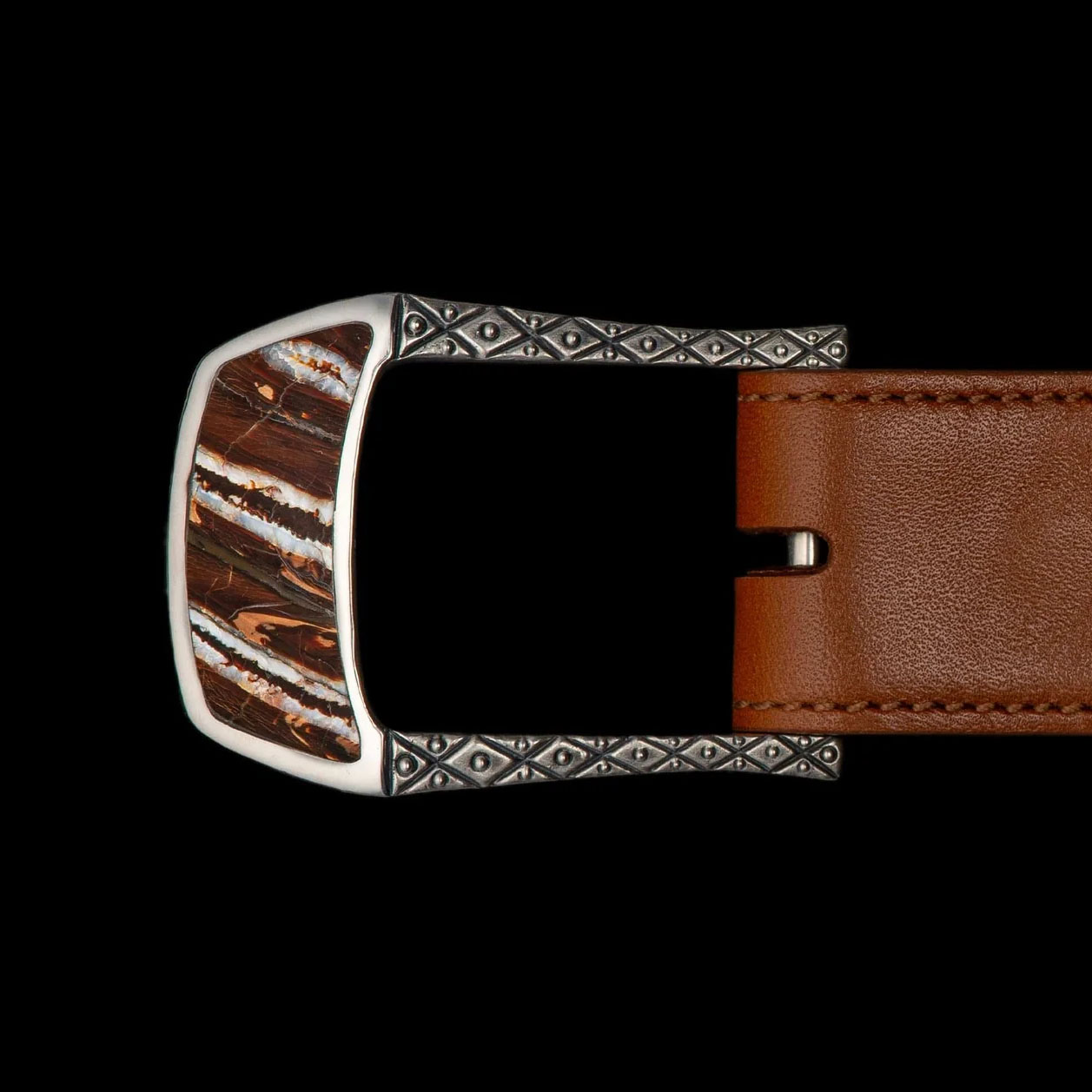 细节 这款精美的皮带扣,无论是在街头还是在会议室,都能完美驾驭,为任何装束增添优雅气息。它采用纯银打造,最引人注目的是镶嵌的猛犸象牙齿。每一块镶嵌物都由猛犸象臼齿切片手工打磨而成,这种传...