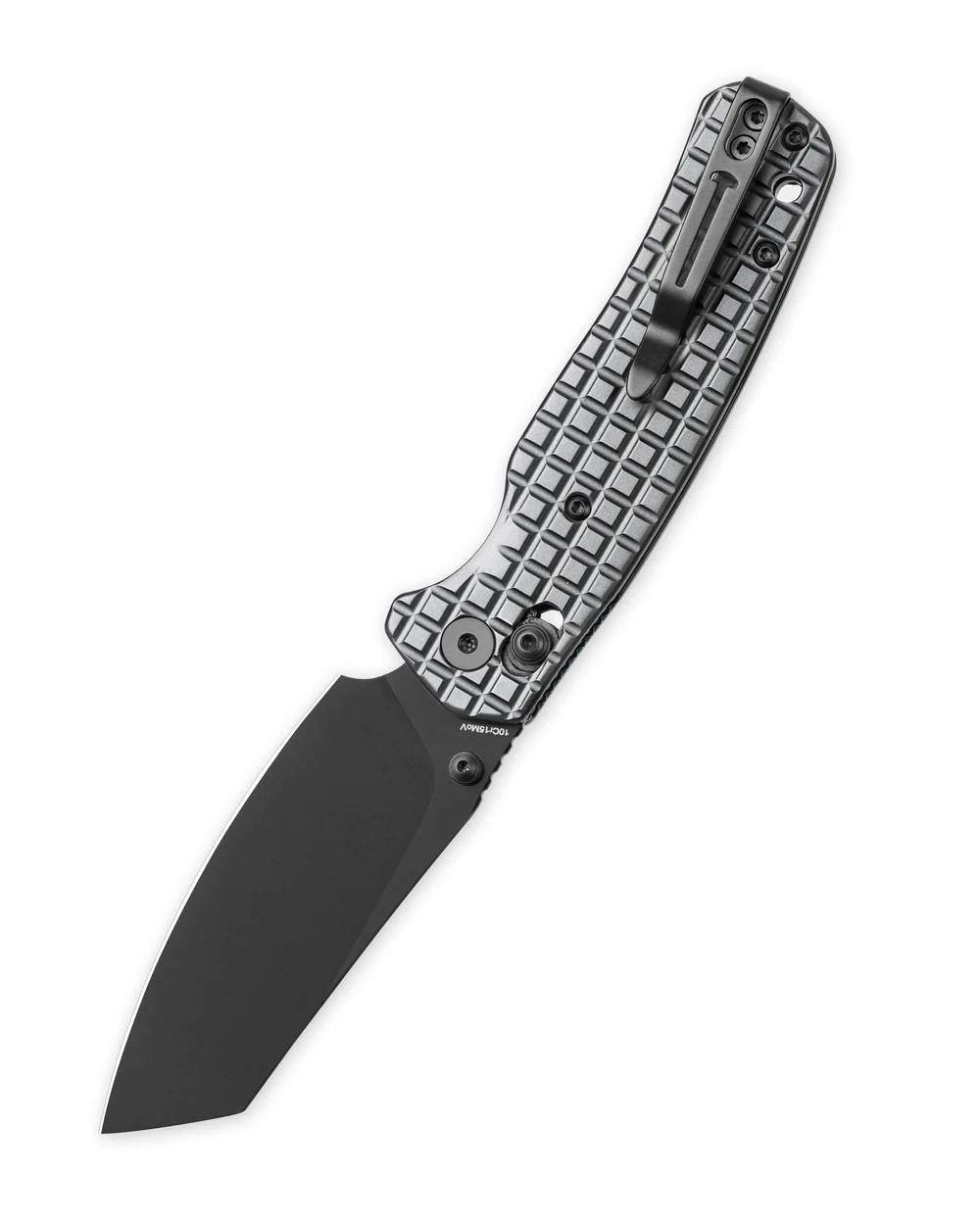 刀刃长度:3.15英寸(80毫米) 手柄长度:4.055英寸(103毫米) 全长:7.205英寸(183毫米) 刀刃厚度:0.091英寸(2.3毫米) 刀刃材质:10Cr15MoV 刀刃表面:黑色PVD 手柄材质:不锈钢带破片图案 手柄 表面处理:灰色PVD 锁定机构:B-Lock 口袋夹:深携带,左右携带 刀具重量:3.95盎司(112克) 中国制造