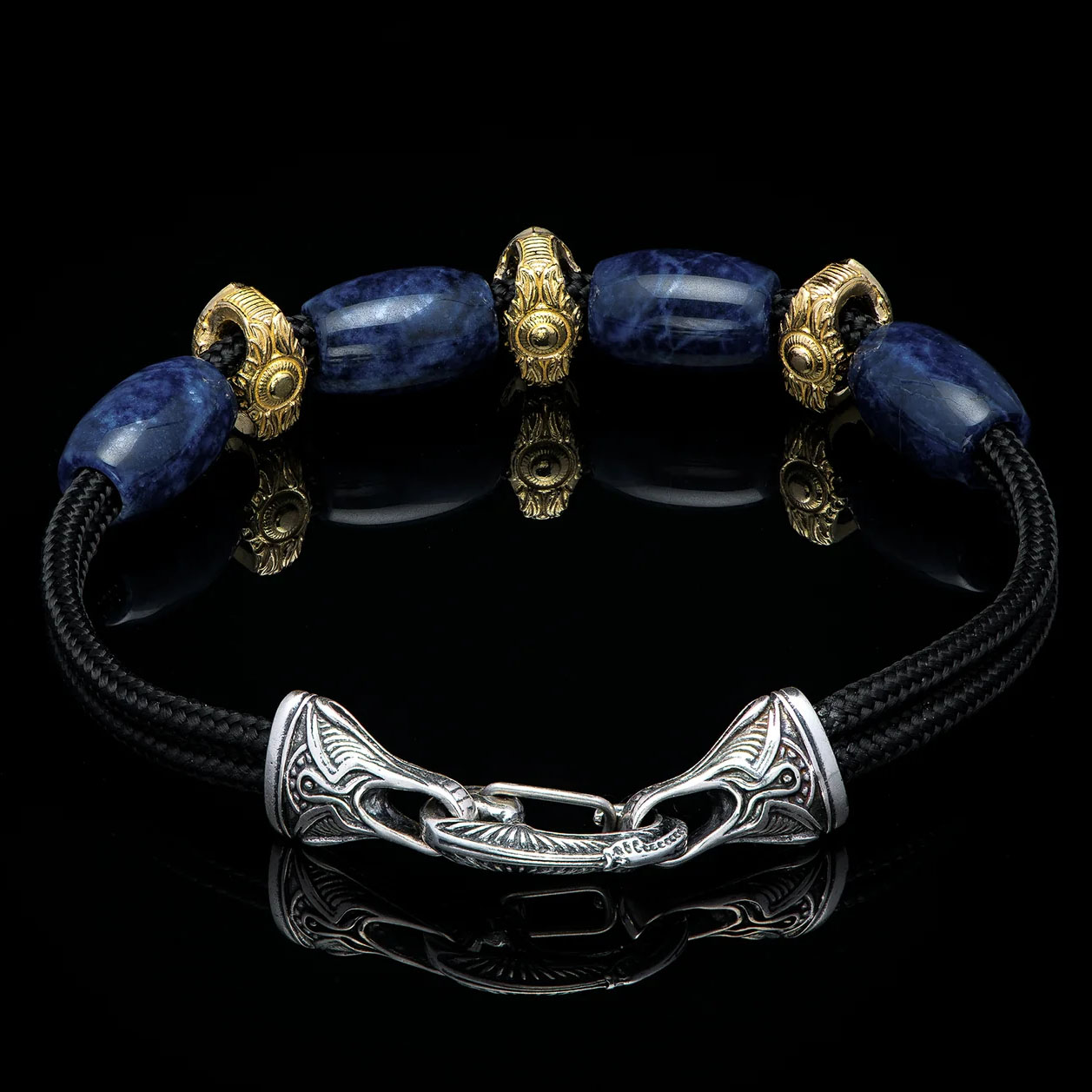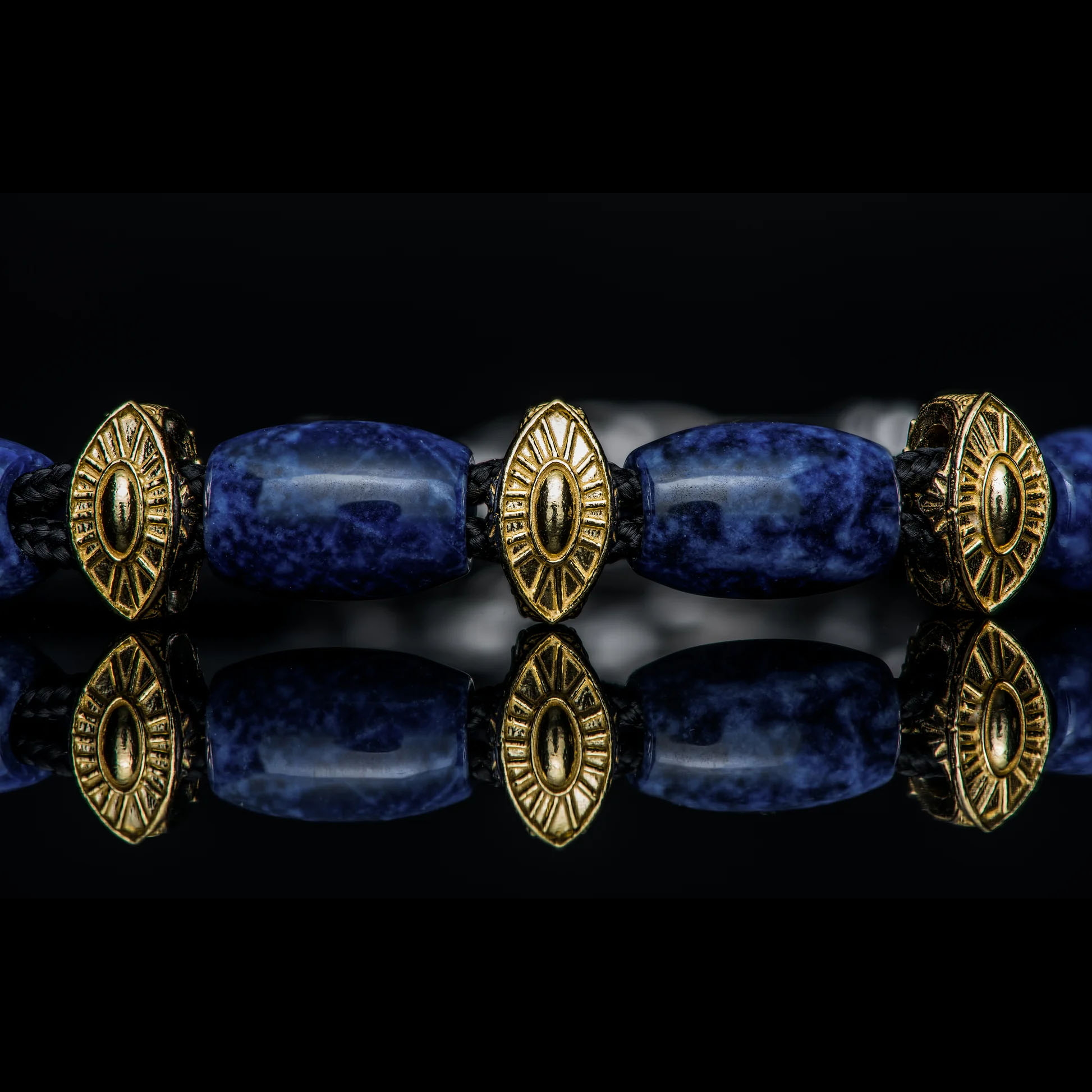 细节 BURST手链巧妙融合了现代与传统、珍贵与工业、张扬与低调。它以三颗18K纯金珠为特色,搭配优雅的蓝色大理石纹苏打石。手链采用双股耐用黑色伞绳编织而成,并以纯银扣环收尾。大胆而永恒,超越潮...