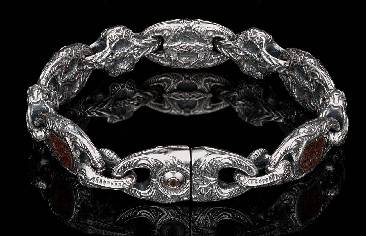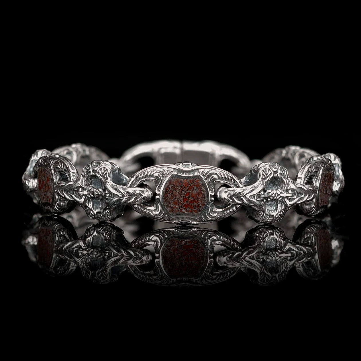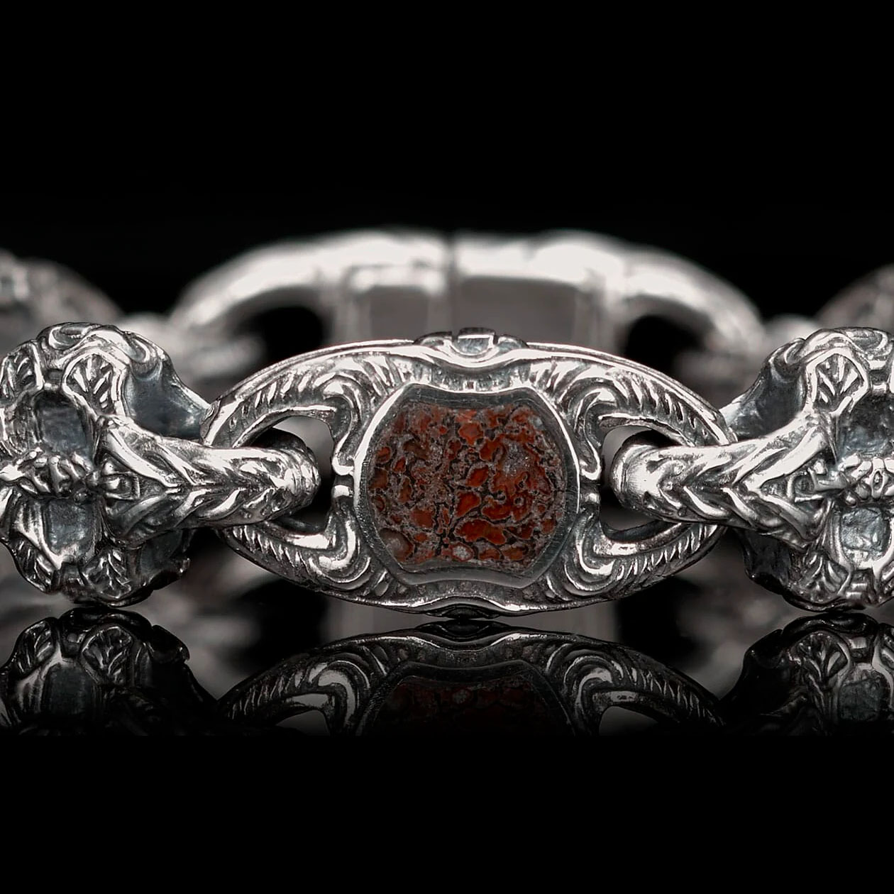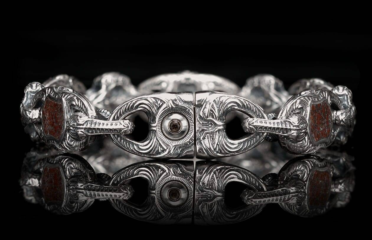 细节 “无畏”系列手链以精雕细琢的纯银链节镶嵌着一块非凡的恐龙化石骨。这块化石骨来自一只迷惑龙,距今至少有1亿年的历史,发现于美国西部。历经数百万年的岁月,这令人惊叹的远古遗迹如今以石头的形...