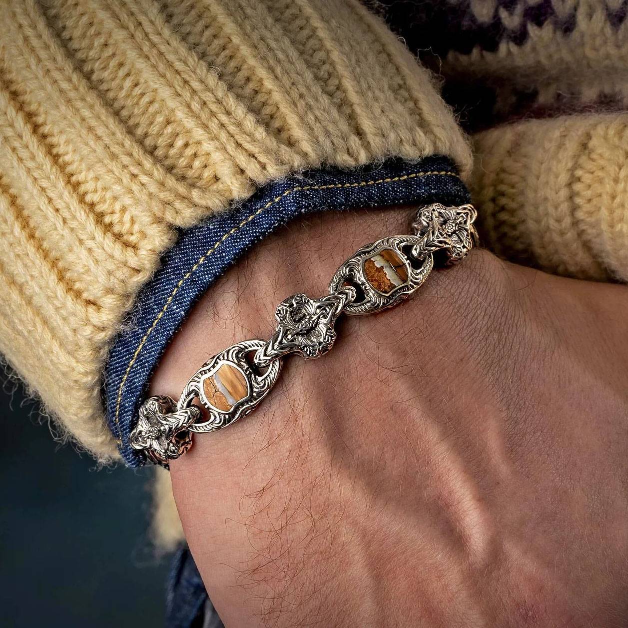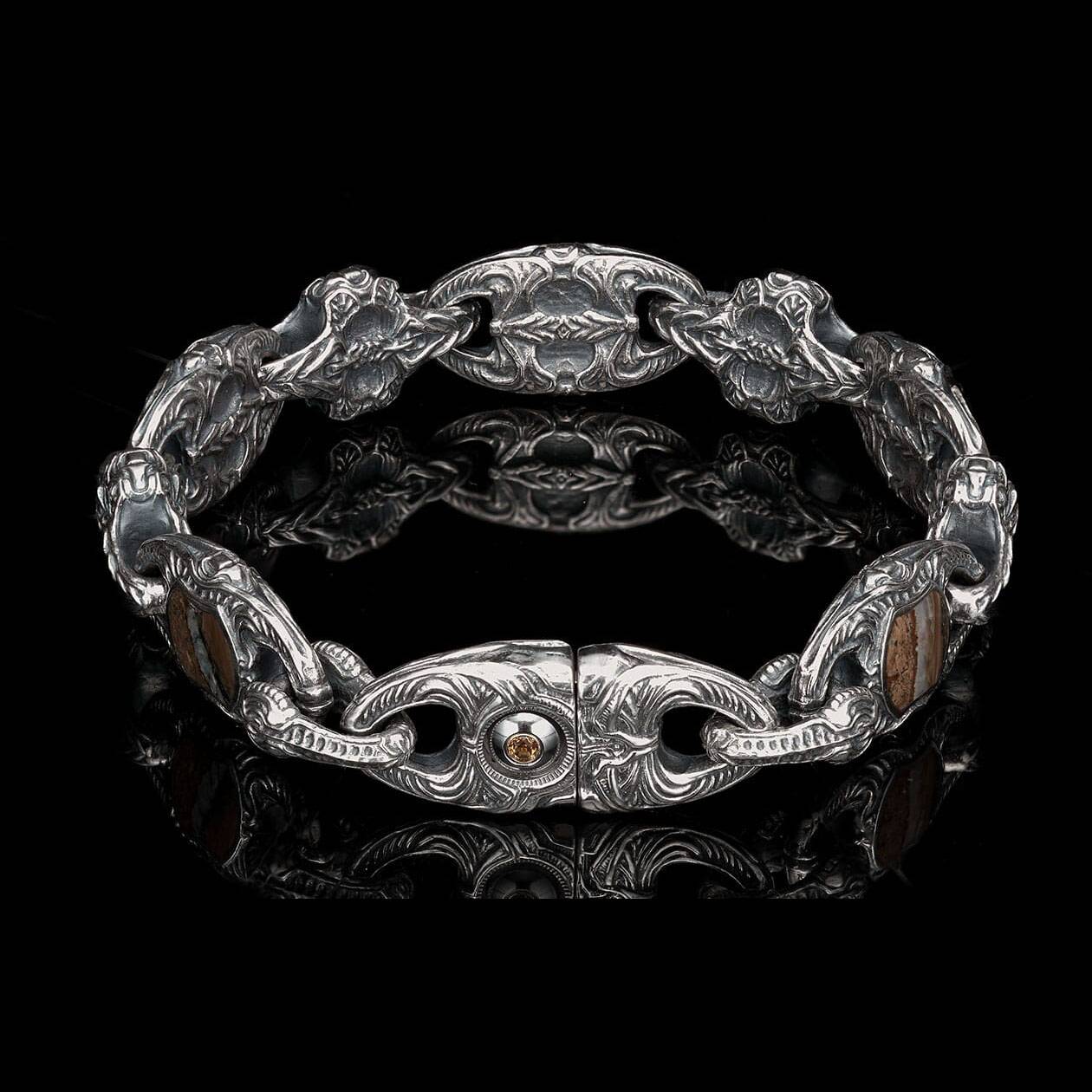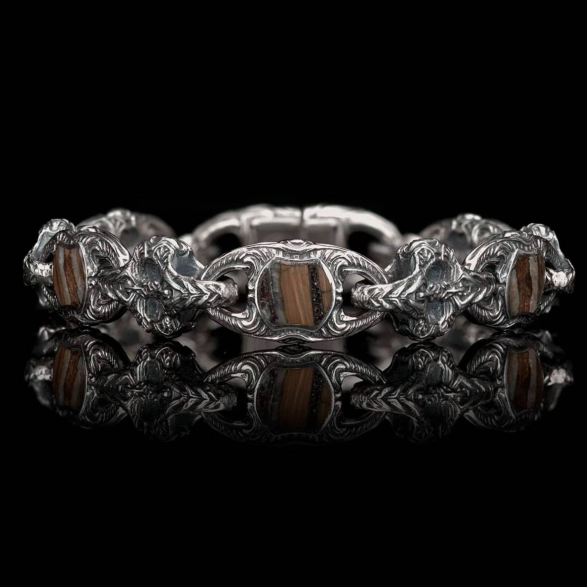 细节 “Squire”系列手链以我们珍稀的猛犸象化石牙齿为特色,镶嵌于修长而粗犷的纯银链节之中。这颗猛犸象牙齿至少有1万年的历史,发现于世界各地特定海域的海底。从发现到加工,整个过程需要近三年时间...