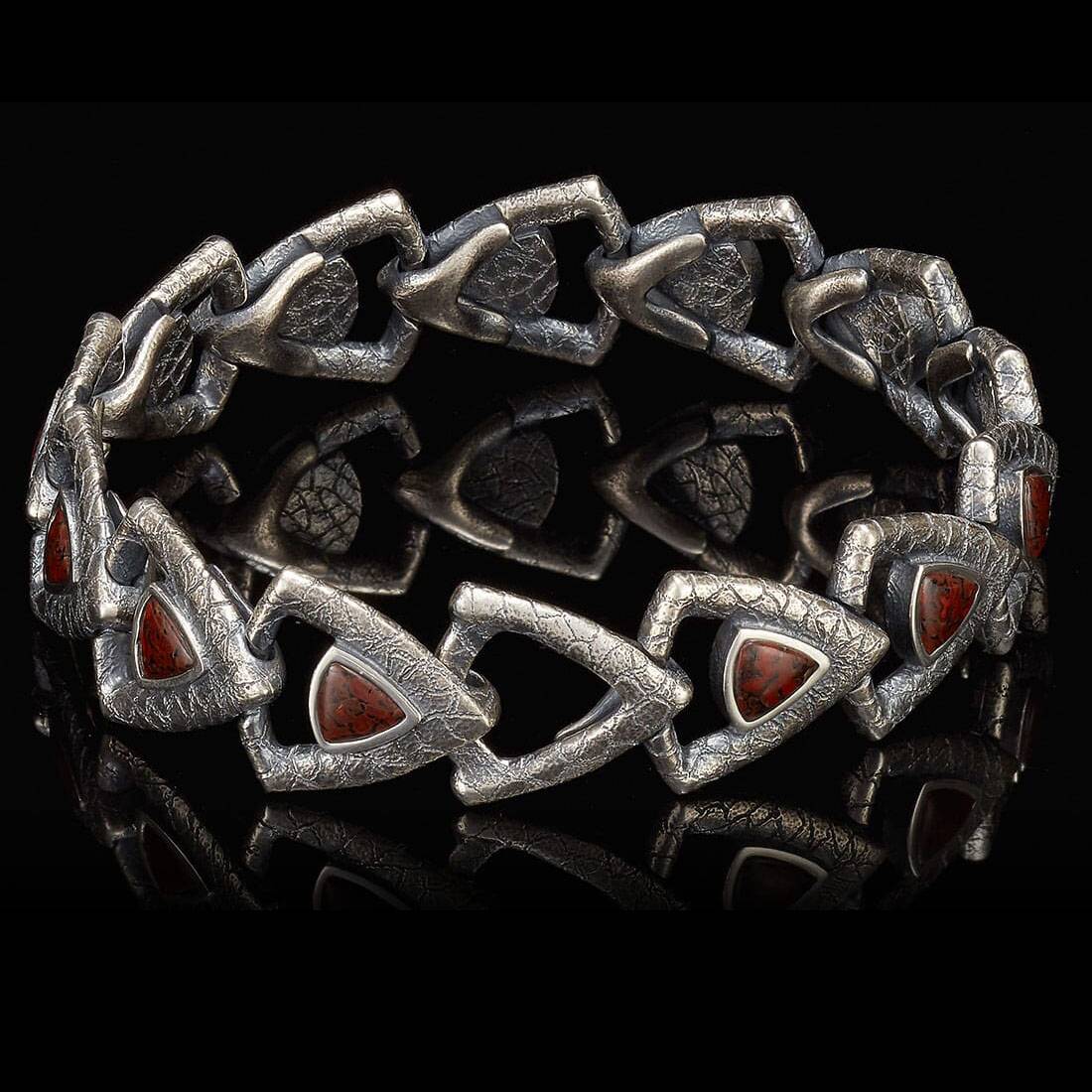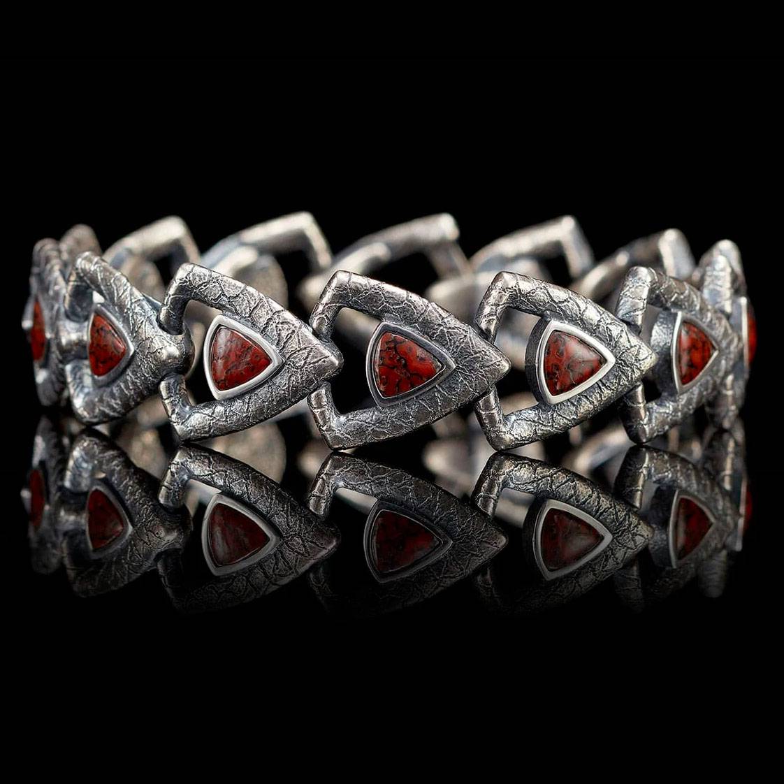 细节 这款手链的设计灵感源自经典的吉他拨片——或者如果你喜欢,也可以把它看作盾牌——一种能引起共鸣的造型。它采用手工雕刻的纯银材质,镶嵌着距今超过1亿年的恐龙化石,设计流畅自然。每个角度都美轮...
