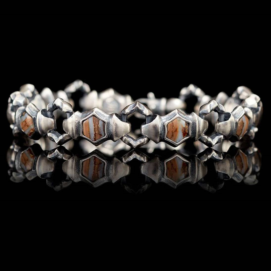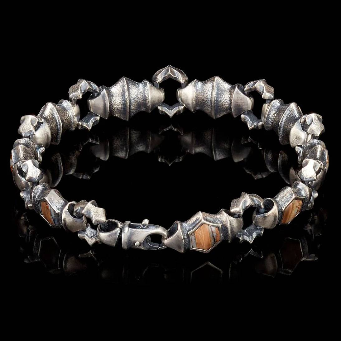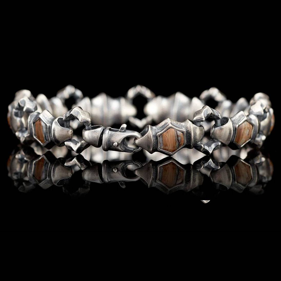 细节 你的寻觅之旅已然实现!这款手链单独佩戴便令人惊艳,同时又足够低调,可以与其他饰品叠戴。它采用纯银打造,表面呈现粗犷的缎面质感,并镶嵌有猛犸象牙化石。配有纯银弹簧扣。找到属于你的使命…...