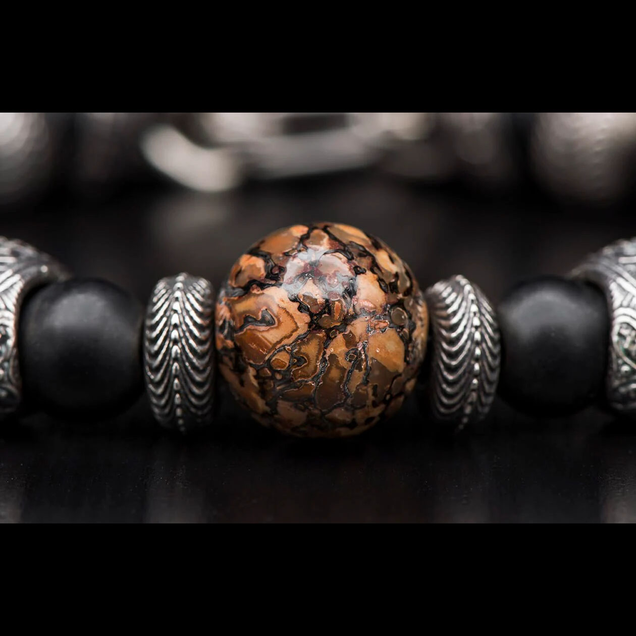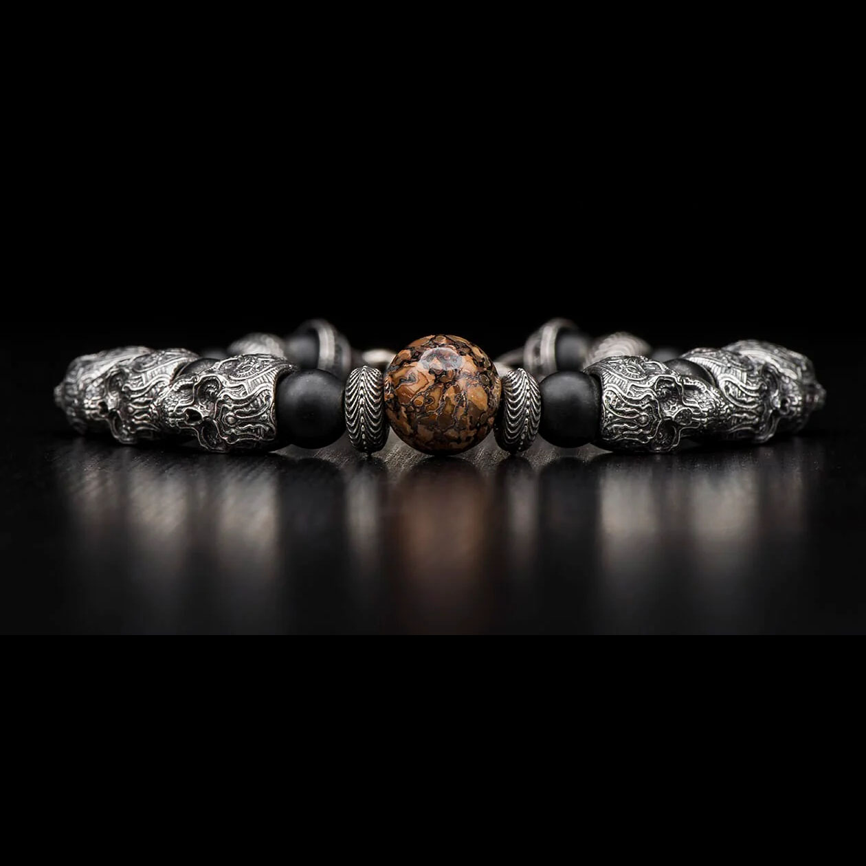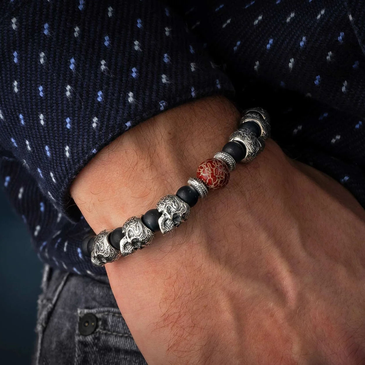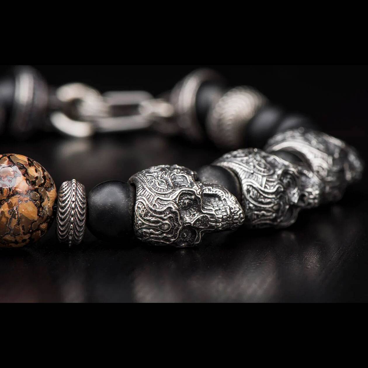 细节 “尤卡坦”手链精美绝伦,完美融合了过去、现在与未来。中央的珠子由化石恐龙骨手工打造而成,这是1亿年前漫步地球的迷惑龙留下的最后遗迹。珠子周围环绕着精雕细琢的纯银“糖骷髅”珠子,并点缀着磨...