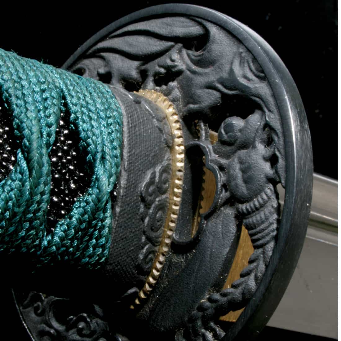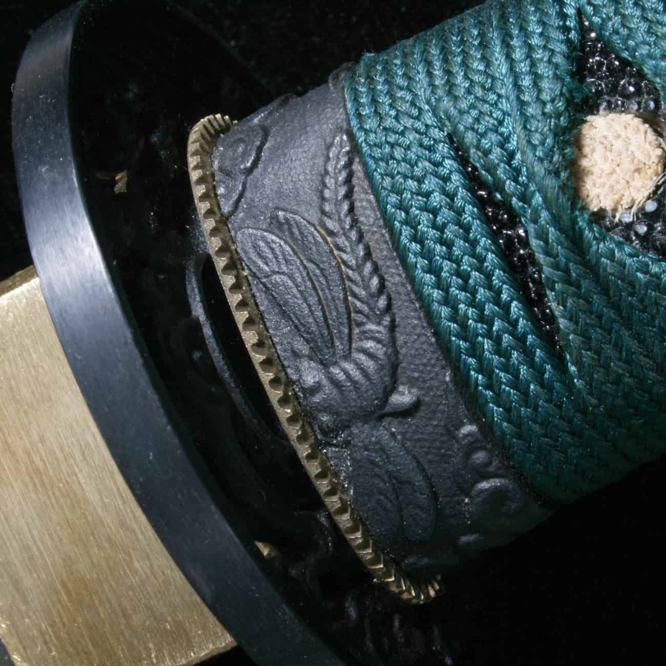 附加特征:鲛皮(珍珠鱼皮)手柄,搭配青绿色丝质编织绳与黄铜目贯;黑漆木鞘