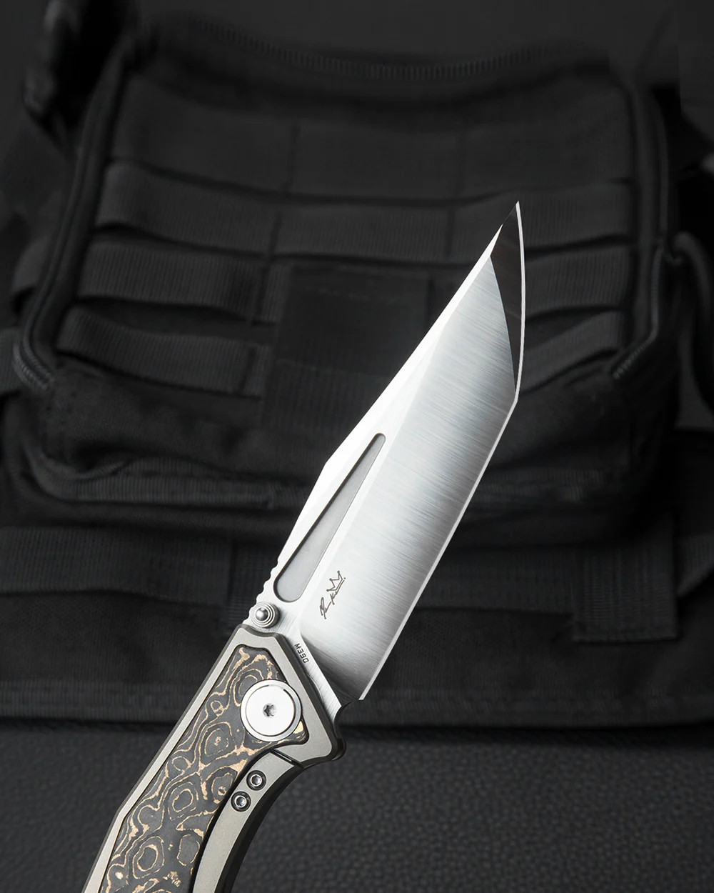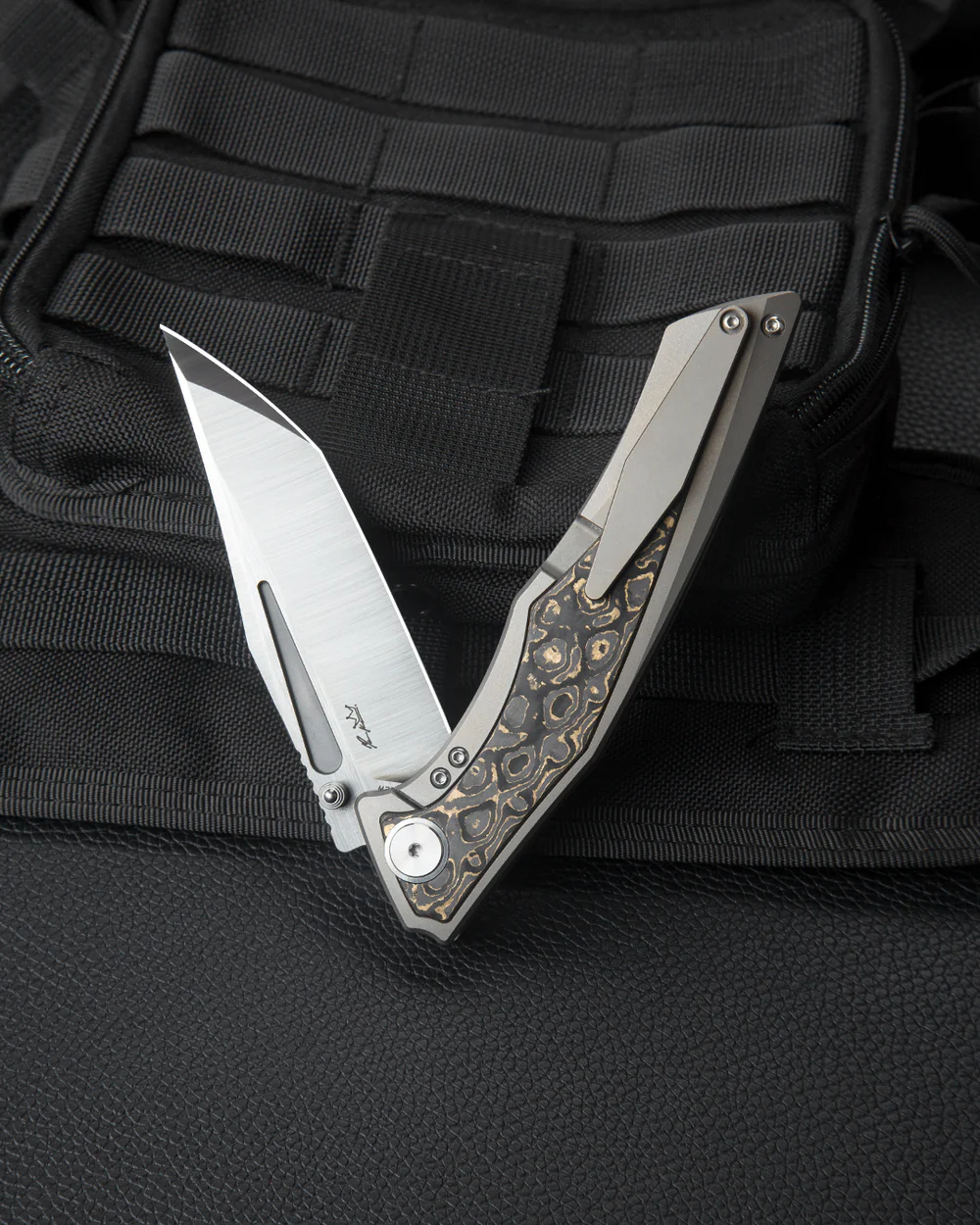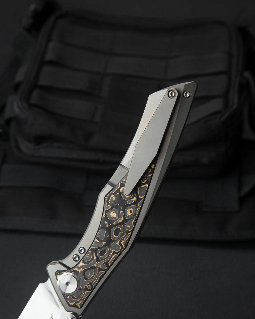 规格 刀刃材质:M390 刀刃表面处理:缎面+平缎 手柄材质:钛+大马士革铜碳纤维镶嵌 描述:帧锁定 握把颜色:浅青铜色 全长:9.1英寸(231毫米) 闭合长度:5.36英寸(136毫米) 刀刃长...