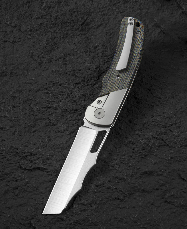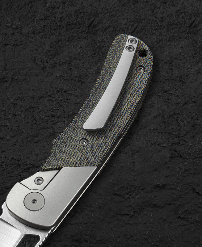 刀身材质:Elmax 刀刃表面:手工磨石洗 +手工磨砂 握柄材质:钛+深绿帆布 Micarta 镶嵌 握柄颜色:珠喷 全长:8.07“(205mm) 闭合长度:4.5” (114.3mm) 刀刃长度:3.57“ (90.7mm) 刀刃厚度:0.14” (3.5mm) 枢轴:钛合金,珠状喷砂 螺丝:钛合金,珠状喷砂 夹具:钛合金,珠状喷砂 后隔器:钛合金,珠状喷射 滚珠轴承:陶瓷