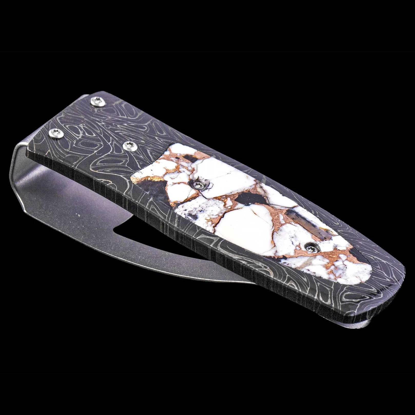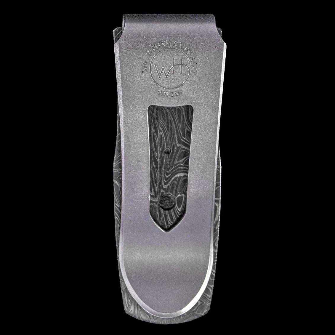 这款名为“法老白水牛”的戒指,其框架由查德·尼科尔斯手工锻造的“脑波”大马士革钢制成,并镶嵌有白水牛绿松石和青铜底座。夹子由淬火不锈钢经机械加工和喷砂抛光而成,哑光背景上的精美雕刻图案熠熠生辉。