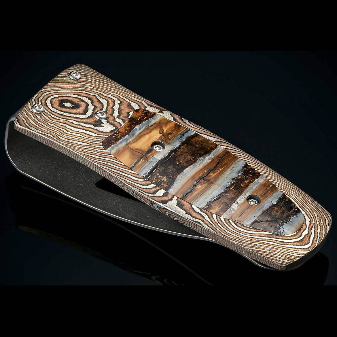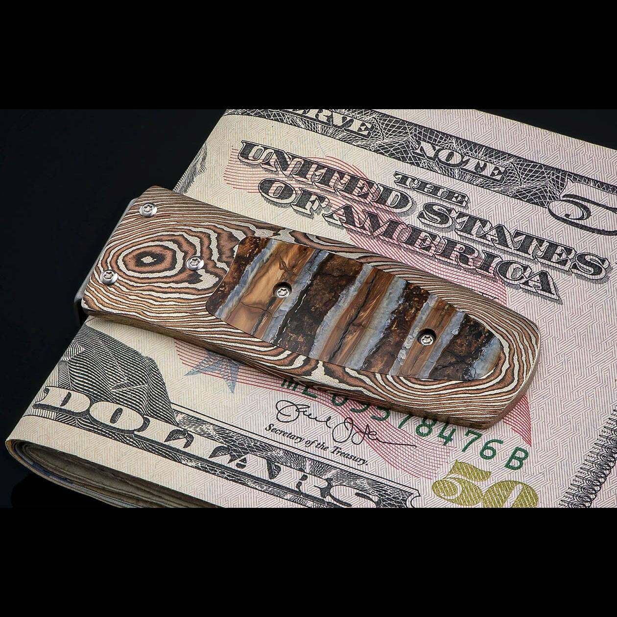 细节 这款法老“史诗”系列钱夹采用手工锻造的木刻金(Mokuke Gane)框架,镶嵌着一颗拥有万年历史的猛犸象牙化石。夹子由淬火不锈钢经机械加工和喷砂抛光而成,精美的雕刻图案在哑光背景的映衬下熠熠生...