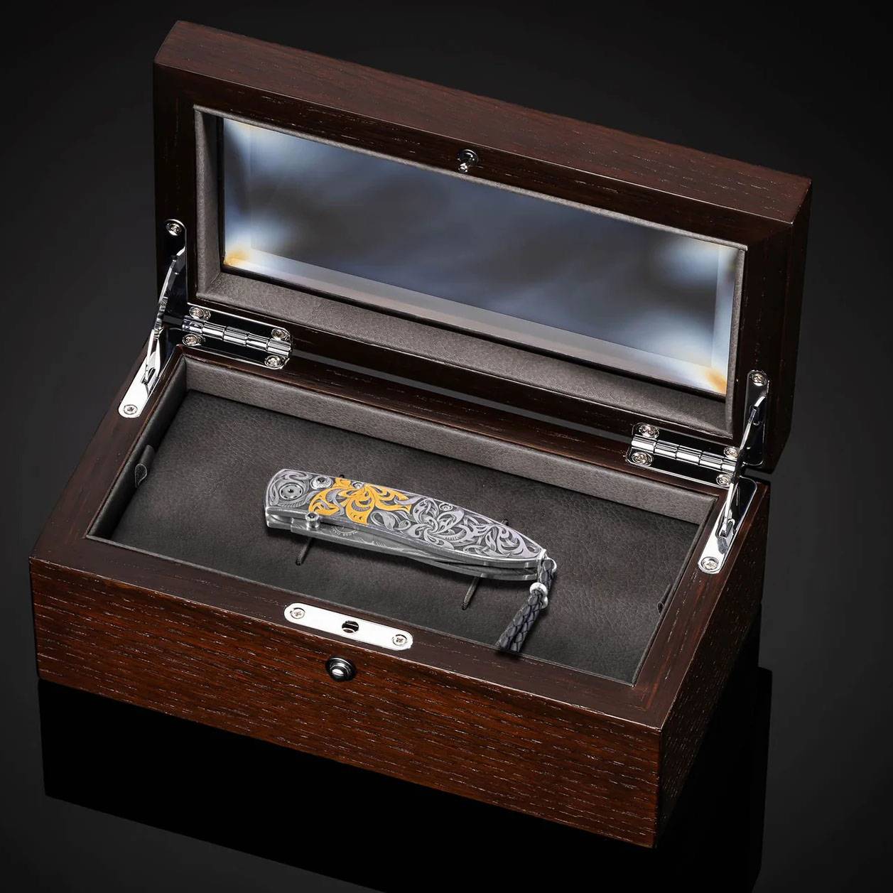 细节 Monarch“Flora”系列刀具拥有由Lucie Bandikova精心打造的精美手工雕刻刀架,并镶嵌24K金饰。刀刃采用Chad Nichols手工锻造的“回旋镖”大马士革钢;单手按钮锁定装置和拇指柱均镶嵌尖晶石。“Flora”...