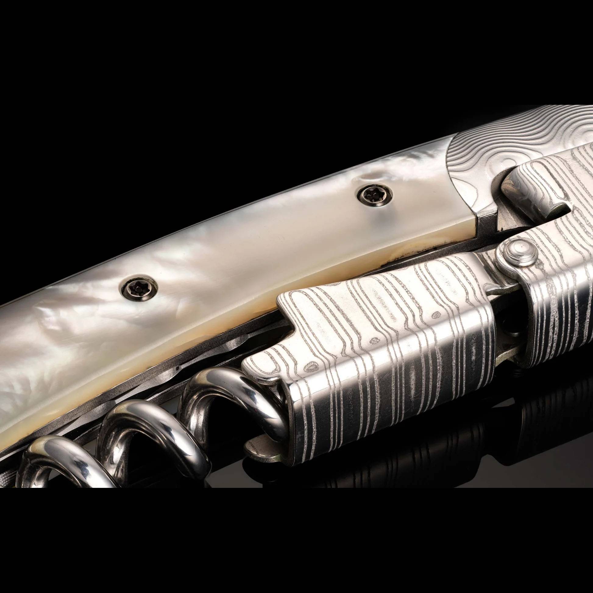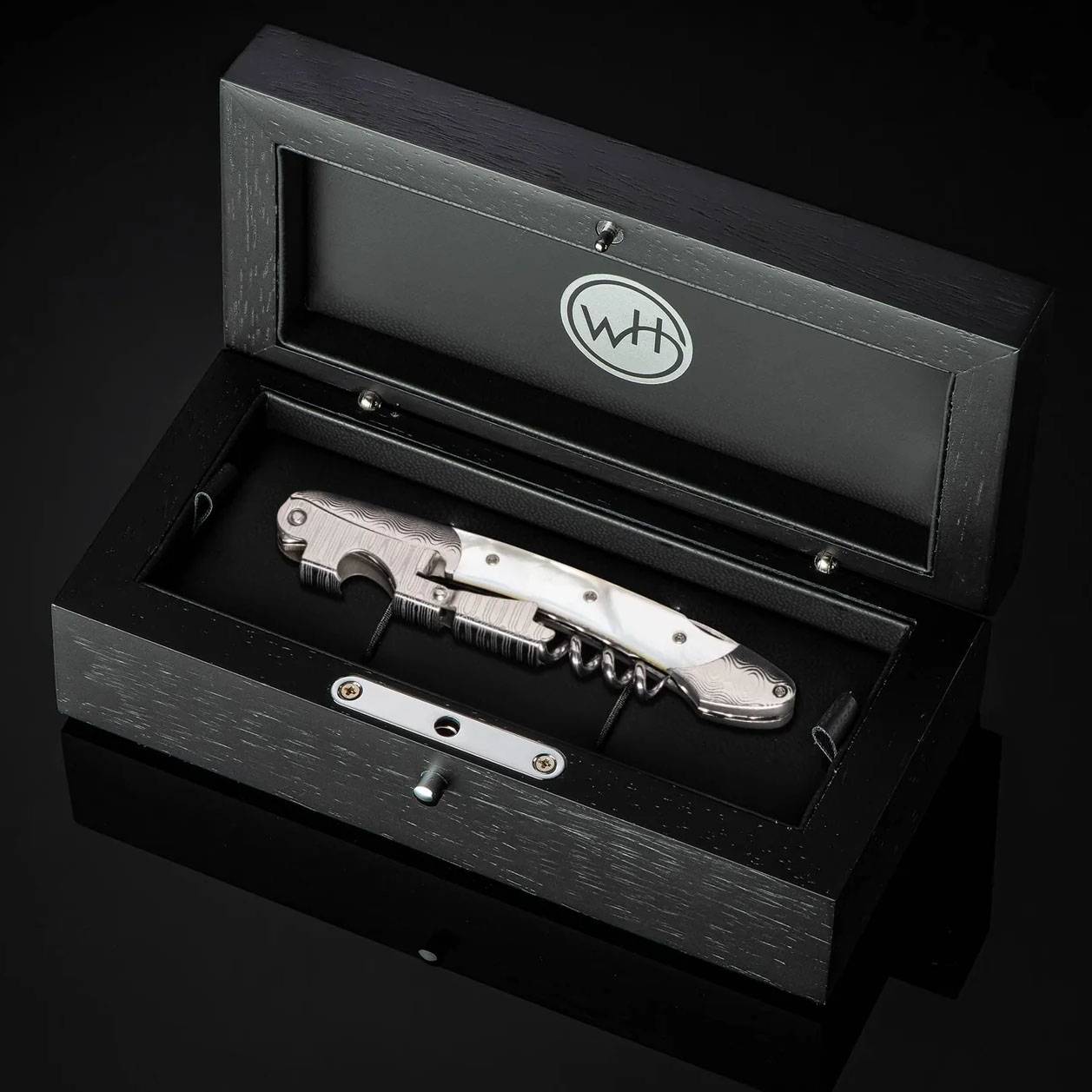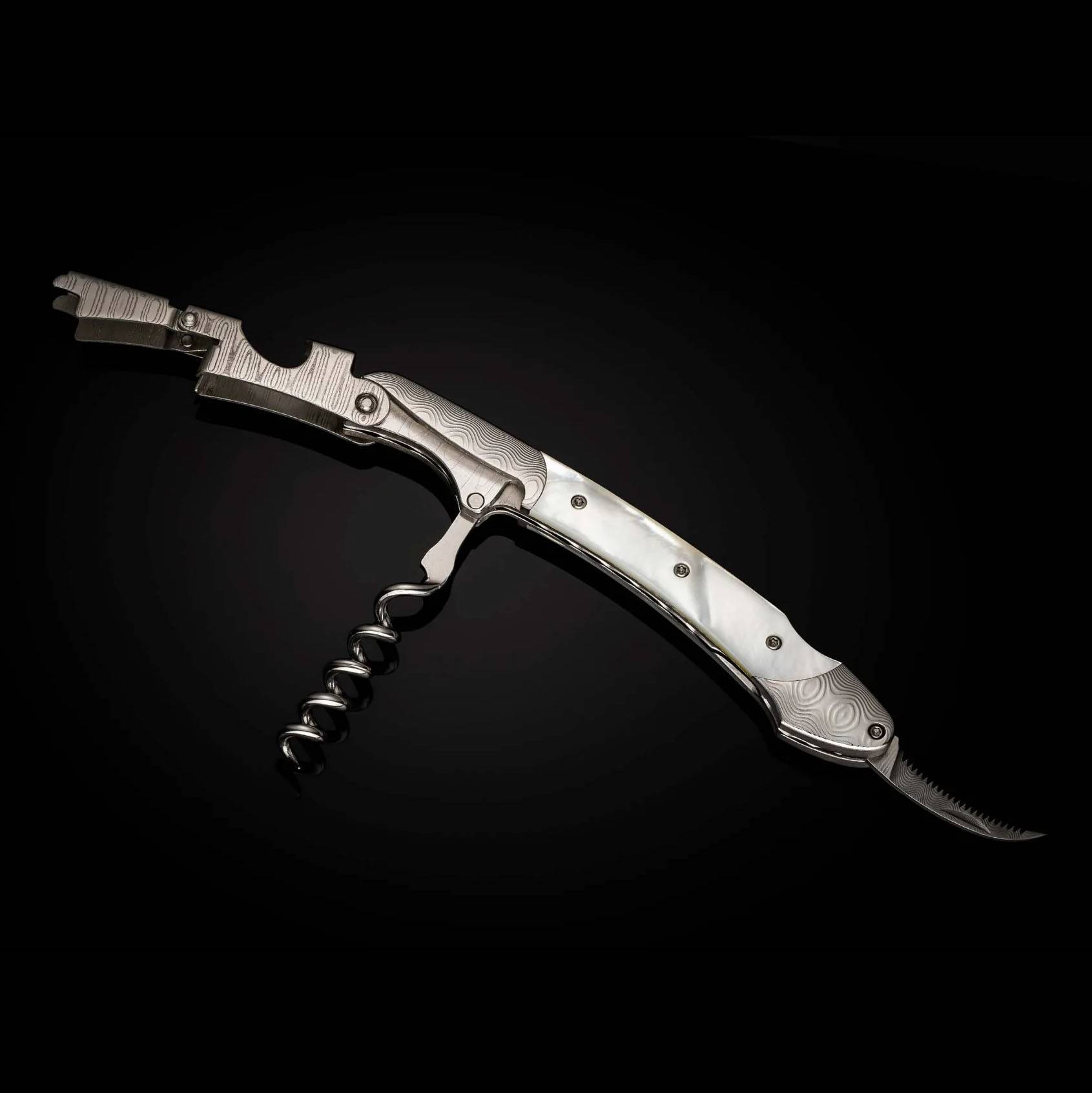 威廉·亨利“Gris”是一款双铰链侍酒师开瓶器,采用大马士革钢框架、杠杆和箔纸切割器。这款精美绝伦的开瓶器还饰有令人惊艳的白色珍珠镶嵌,整个脊部均采用锉纹工艺,尽显我们一贯的精湛工艺。