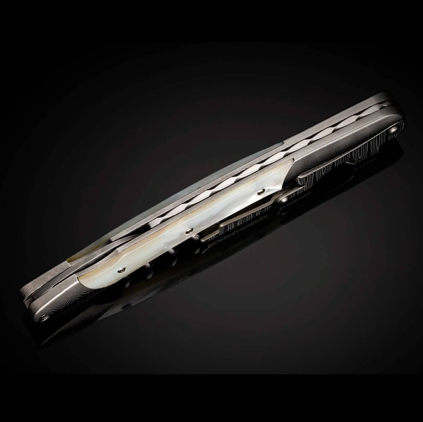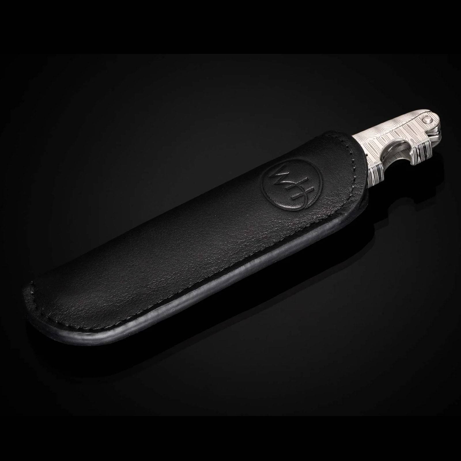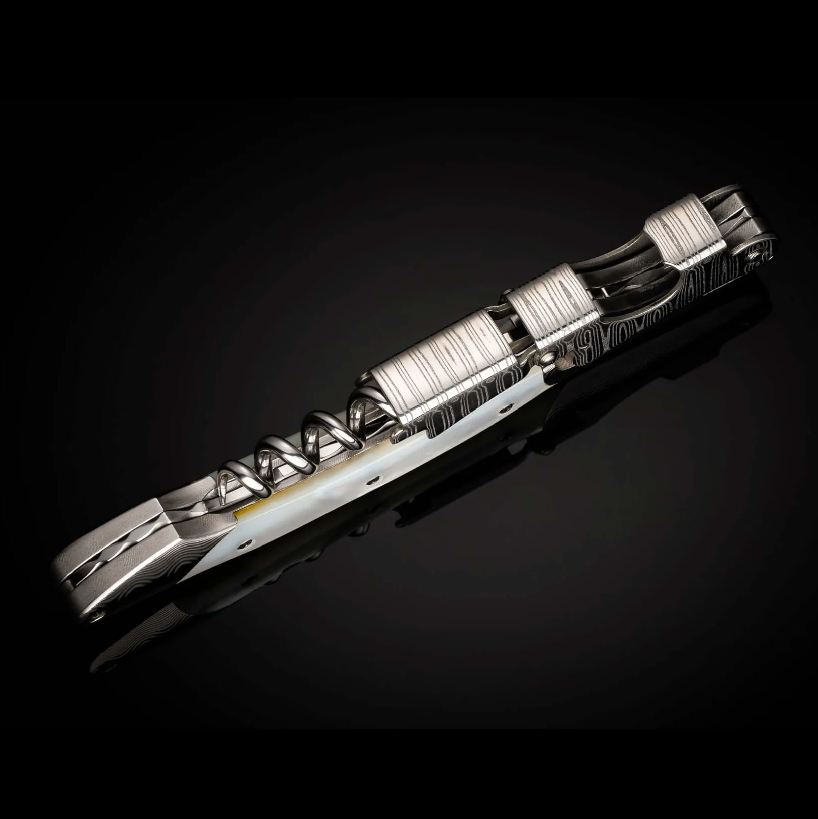 威廉·亨利“Gris”是一款双铰链侍酒师开瓶器,采用大马士革钢框架、杠杆和箔纸切割器。这款精美绝伦的开瓶器还饰有令人惊艳的白色珍珠镶嵌,整个脊部均采用锉纹工艺,尽显我们一贯的精湛工艺。