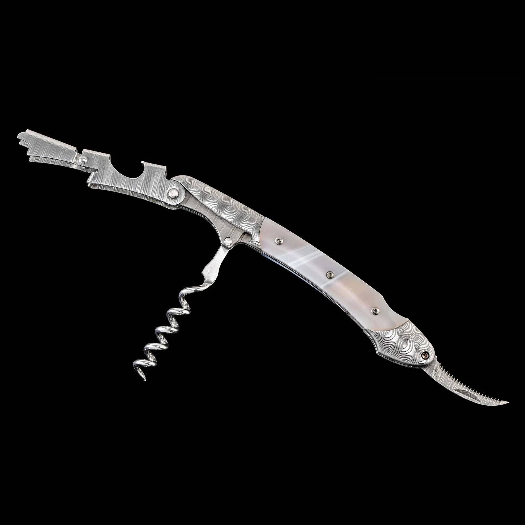 独一无二的开瓶器 框架与切割器:手工锻造大马士革钢 手柄材质:缠丝玛瑙石