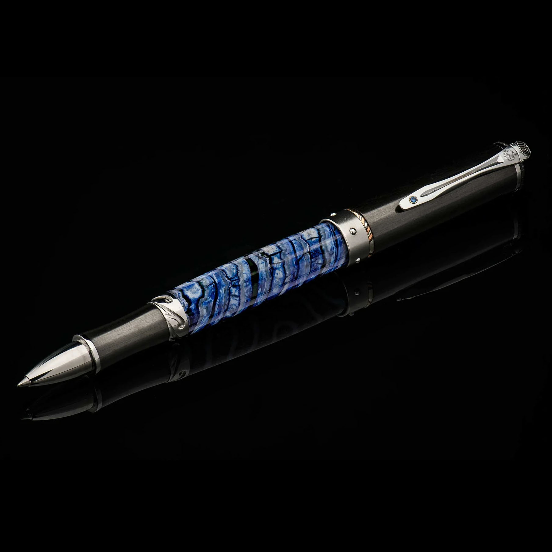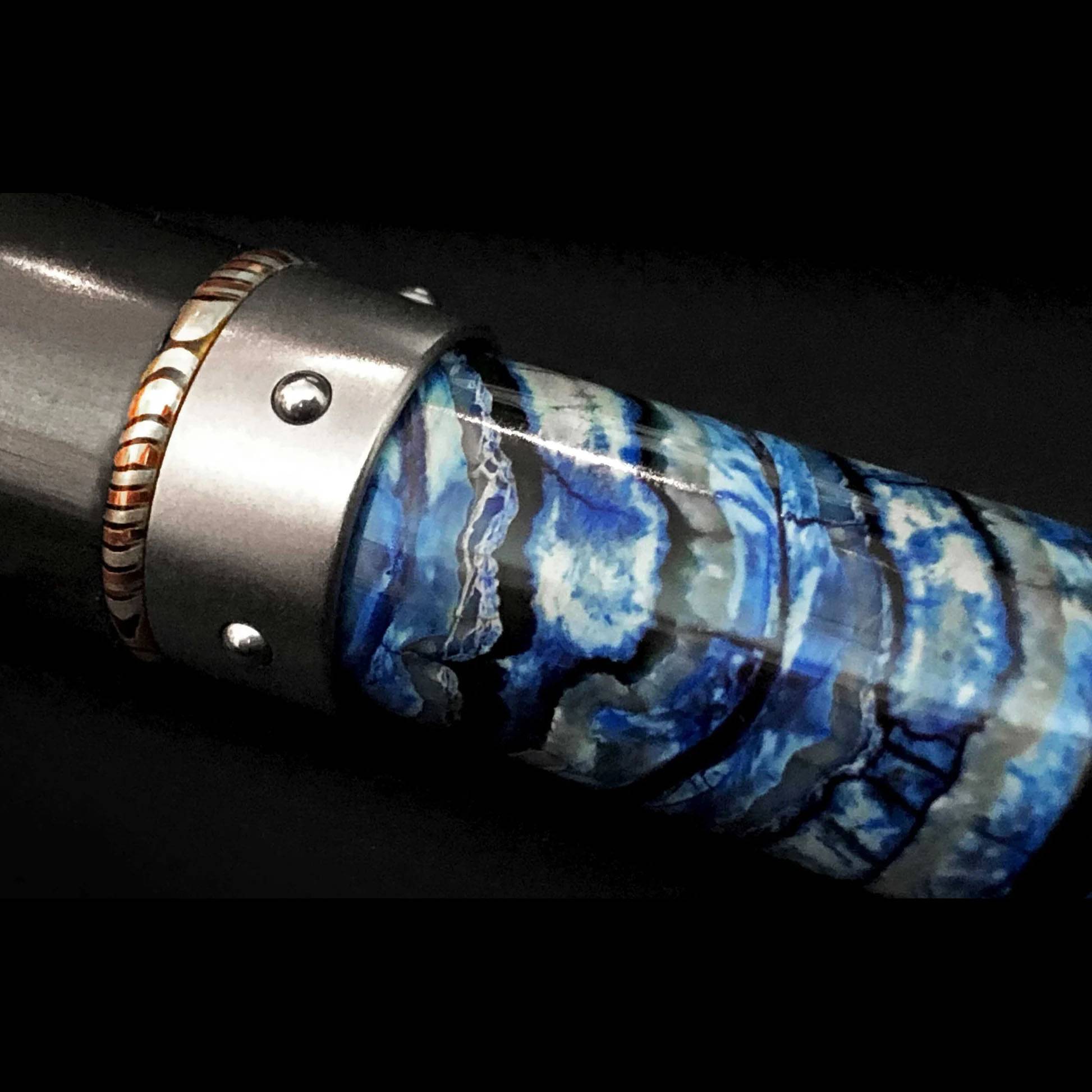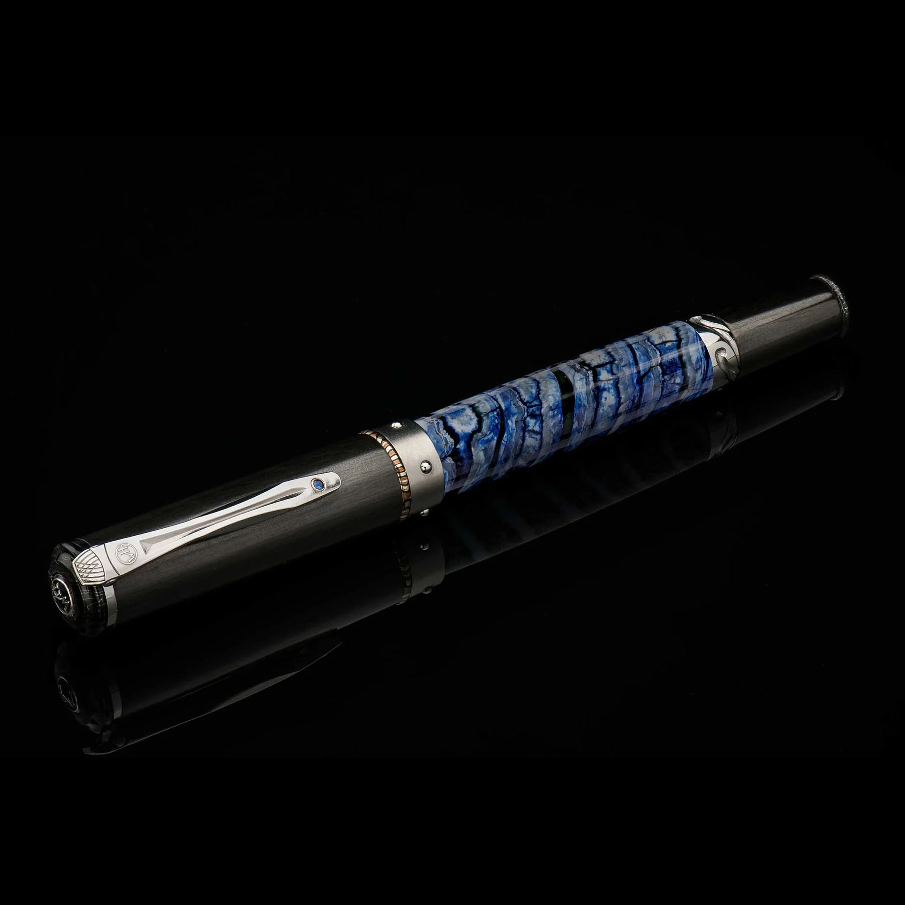 这款名为“蓝猛犸象”(Blue Mammoth)的赤霞珠圆珠笔,笔杆采用距今1万年的猛犸象牙齿化石制成,笔身则以航空级钛合金和铝合金打造,轻盈灵动。碳纤维笔帽饰以大马士革钢和木纹金,笔夹上镶嵌一颗蓝宝石。这款精美的书写工具还配备了威廉·亨利(William Henry)正在申请专利的Wavelock™笔帽闭合系统——一圈铬钢珠嵌入钛合金环中,并被钛合金笔套上的波浪形凹槽固定,从而实现笔帽的闭合和拔出两种状态。 这是威廉·亨利最尊贵的书写工具之一,每一支都拥有独特而鲜明的个性。